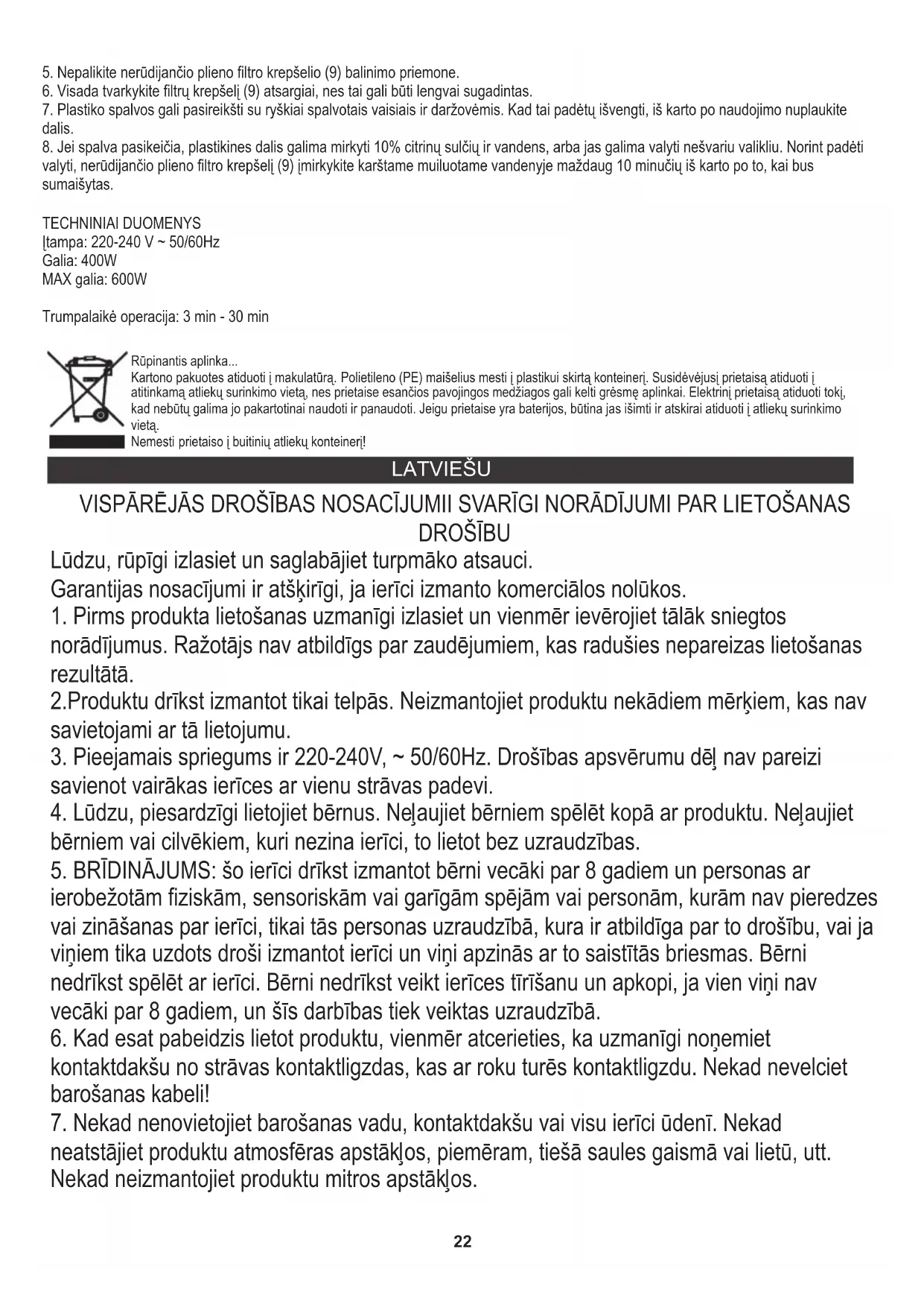 7. Plastmasas krāsojums var notikt ar ļoti krāsainiem augļiem un dārzeņiem. Lai to novērstu, mazgājiet daļas tūlīt pēc lietošanas. 8. Ja notiek krāsas maiņa, plastmasas detaļas var iemērc 10% citronu sulās un ūdenī vai tās var notīrīt ar neabrazīvu tīrīšanas līdzekli. Lai palīdzētu ar tīrīšanu, nerūsējošā tērauda filtra grozs (9) iemērc karstajos ziepjūdenī apmēram 10 minūtes tūlīt pēc sulu pildīšanas. Ja mīkstums ir atstāts, lai nožūtu uz filtra, tā var aizsprostot filca acs smalkās poras, tādējādi samazinot sulu spiedes efektivitāti. MAX jauda: 600W Īslaicīga darbība: 3 minūtes - 30 minūtes Jauda: 400W TEHNISKIE DATI Spriegums: 220-240 V ~ 50/60Hz Apkārtējās vides aizsardzība. Kartona iepakojumu, lūdzu, nododiet otreizējai pārstrādei. Polietilēna maisiņus (PE) izmest plastmasas izstrādājumiem paredzētajos konteineros. Lietotās elektropreces nododiet attiecīgajos pieņemšanas punktos. Ierīcē satur bīstamas sastāvdaļas, kas var izraisīt draudus apkārtējai videi. Elektroierīce jānodod tā, lai ierobežotu tās atkārtotu izmantošanu. Ja ierīcē atrodas baterijas, izņemiet tās un nododiet pieņemšanas punktā atsevišķi. Produktu neizmest sadzīves atkritumu konteinerā! EESTI