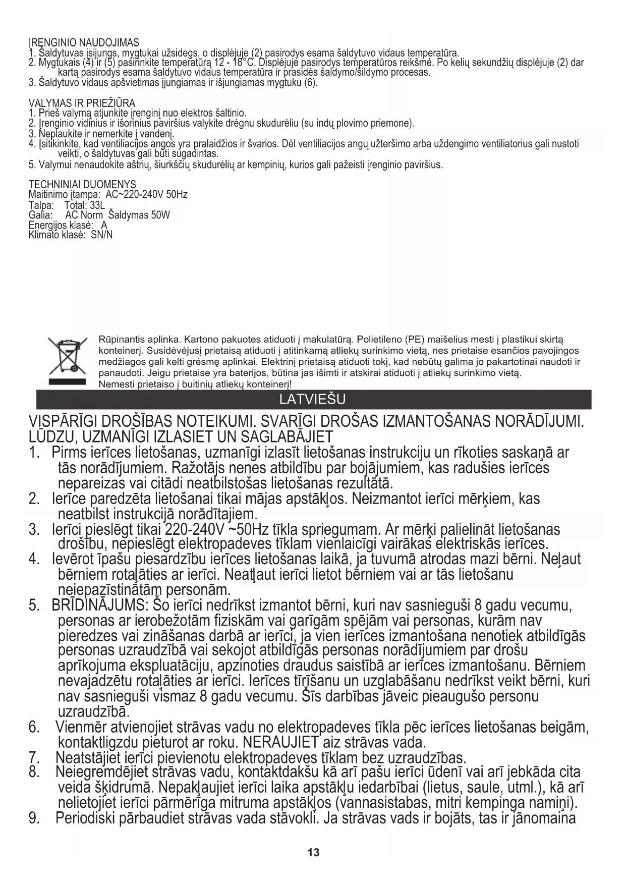 TEHNISKIE DATI Padeves strāva: AC~220-240V 50Hz Tilpums: Total: 33L Jauda: AC Norm Dzesēšana 50W Elektroenerģijas klase: A Klimata klase: SN/N Apkārtējās vides aizsardzība. Kartona iepakojumu, lūdzu, nododiet otreizējai pārstrādei. Polietilēna maisiņus (PE) izmest plastmasas izstrādājumiem paredzētajos konteineros. Lietotās elektropreces nododiet attiecīgajos pieņemšanas punktos. Ierīcē satur bīstamas sastāvdaļas, kas var izraisīt draudus apkārtējai videi. Elektroierīce jānodod tā, lai ierobežotu tās atkārtotu izmantošanu. Ja ierīcē atrodas baterijas, izņemiet tās un nododiet pieņemšanas punktā atsevišķi. Produktu neizmest sadzīves atkritumu konteinerā!15 Kui seadet kasutatakse ärilisel eesmärgil, muutuvad garantiitingimused.