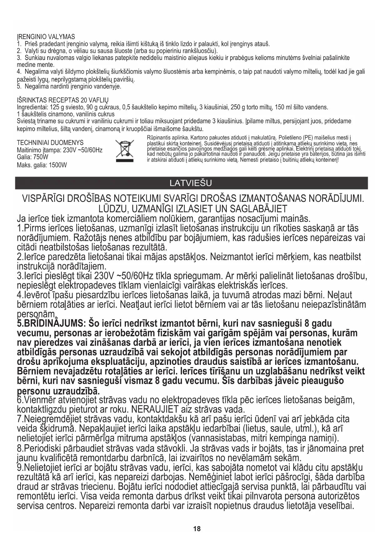 4. Nemazgājiet cepamās plāksnes ar asām, abrazīvu audumu lupatām vai švammēm, nielietojojiet tīrīšanas pulverus, tādēļ, ka tie var sabojāt gludo, nepiedegošu plaķšu pārklājumu. Barošanas bloks: 230V ~50/60Hz Maks. jauda: 1500 W Samalt sviestu ar cukuru un vaniļas cukuru un, turpinot maisīšanu, pievienot 3 veselas olas. Pievienot miltus vienlaicīgi sijājot, pievienot cepamo pulveri, remdenu ūdeni, kanēli un kārtīgi samaistīt ar karoti. 1 tējkarote kanēļa, vaniļas cukurs