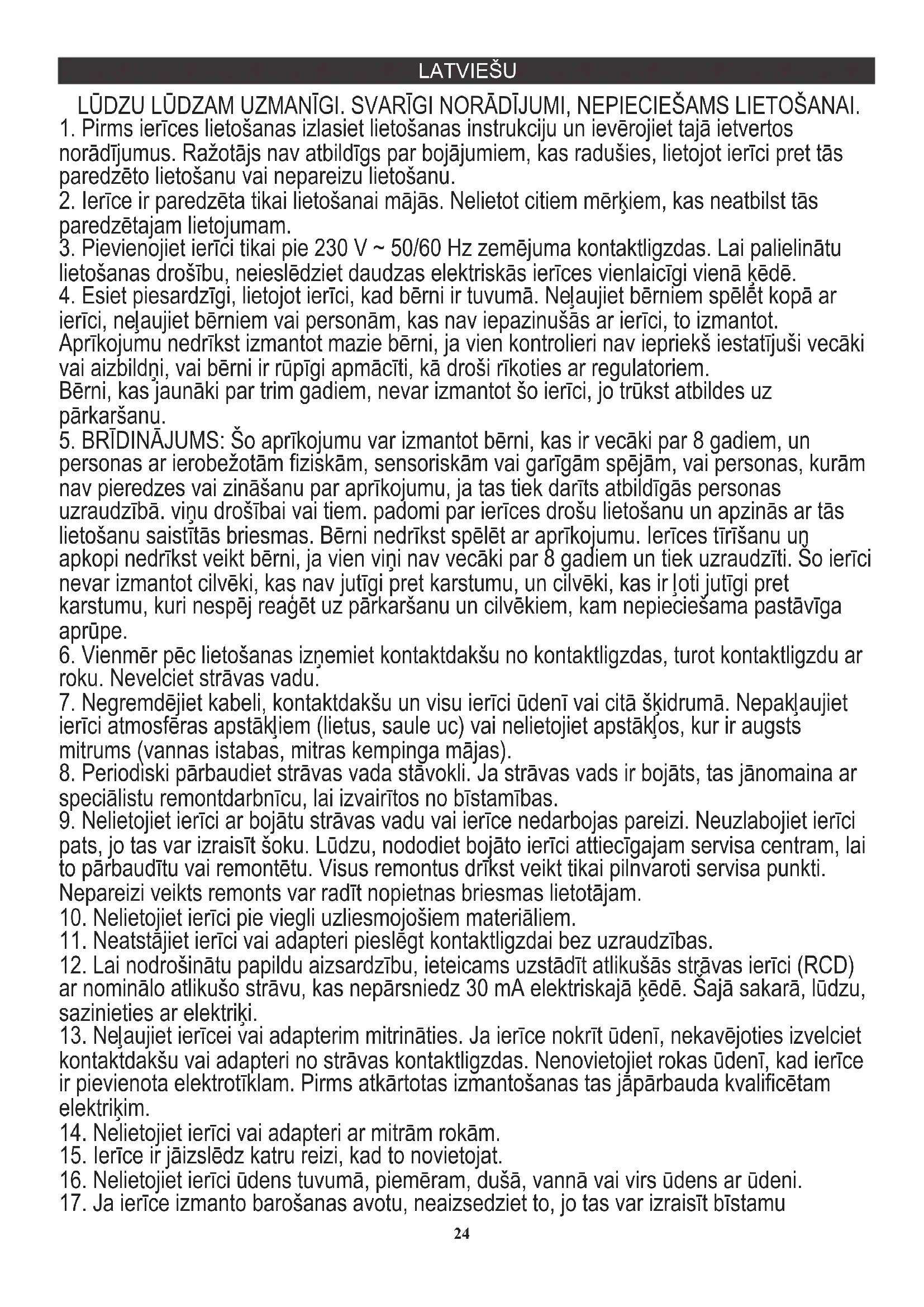 16. Nelietojiet ierīci ūdens tuvumā, piemēram, dušā, vannā vai virs ūdens ar ūdeni.