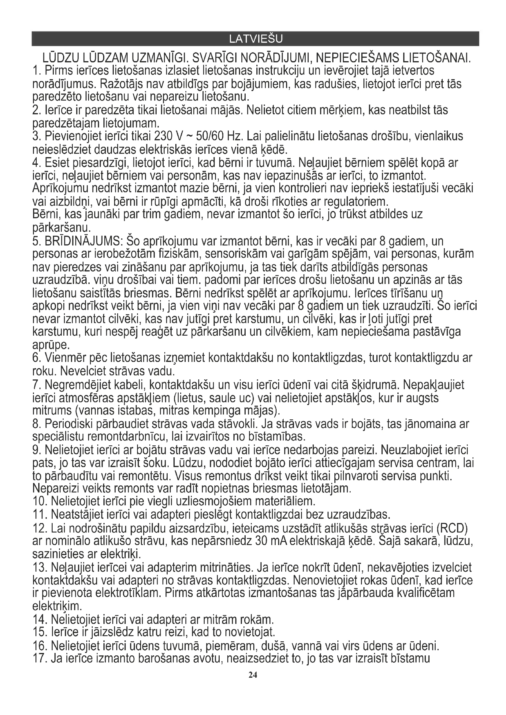 16. Nelietojiet ierīci ūdens tuvumā, piemēram, dušā, vannā vai virs ūdens ar ūdeni.