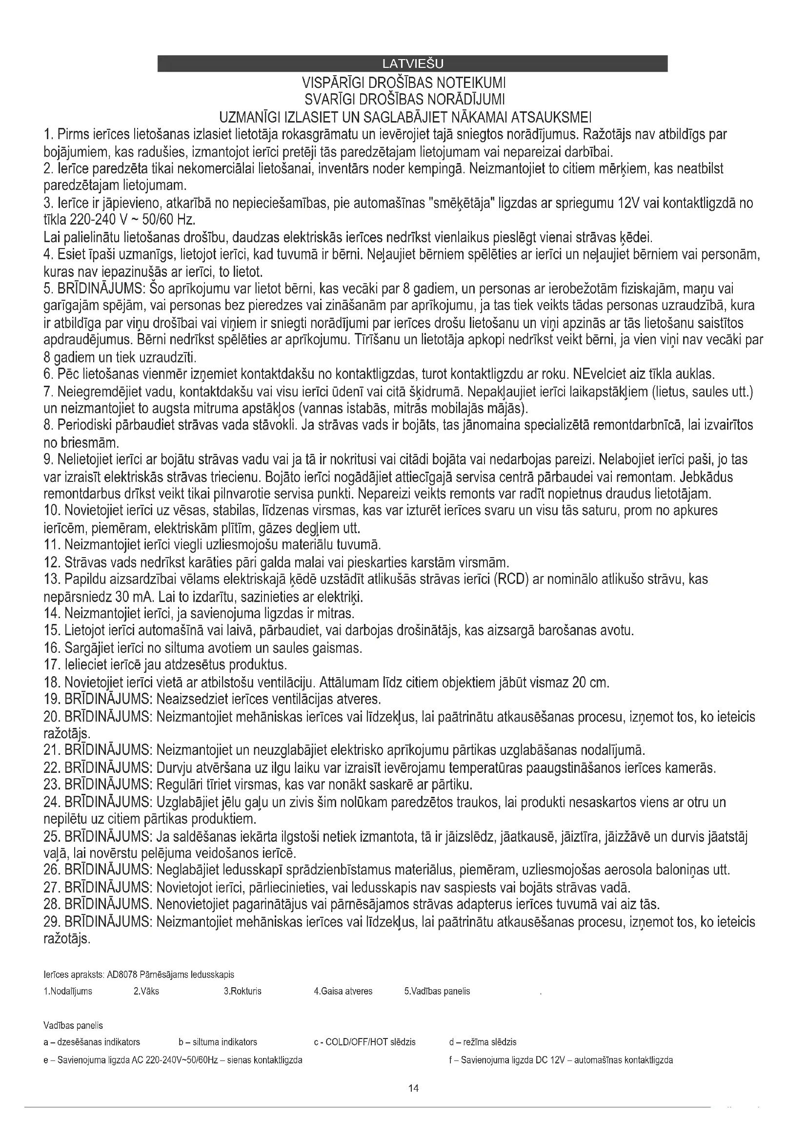 29. BRĪDINĀJUMS: Neizmantojiet mehāniskas ierīces vai līdzekļus, lai paātrinātu atkausēšanas procesu, izņemot tos, ko ieteicis ražotājs. Ierīces apraksts: AD8078 Pārnēsājams ledusskapis 1.Nodalījums 2.Vāks 3.Rokturis 4.Gaisa atveres 5.Vadības panelis . Vadības panelis a – dzesēšanas indikators b – siltuma indikators c - COLD/OFF/HOT slēdzis d – režīma slēdzis e – Savienojuma ligzda AC 220-240V~50/60Hz – sienas kontaktligzda f – Savienojuma ligzda DC 12V – automašīnas kontaktligzda15