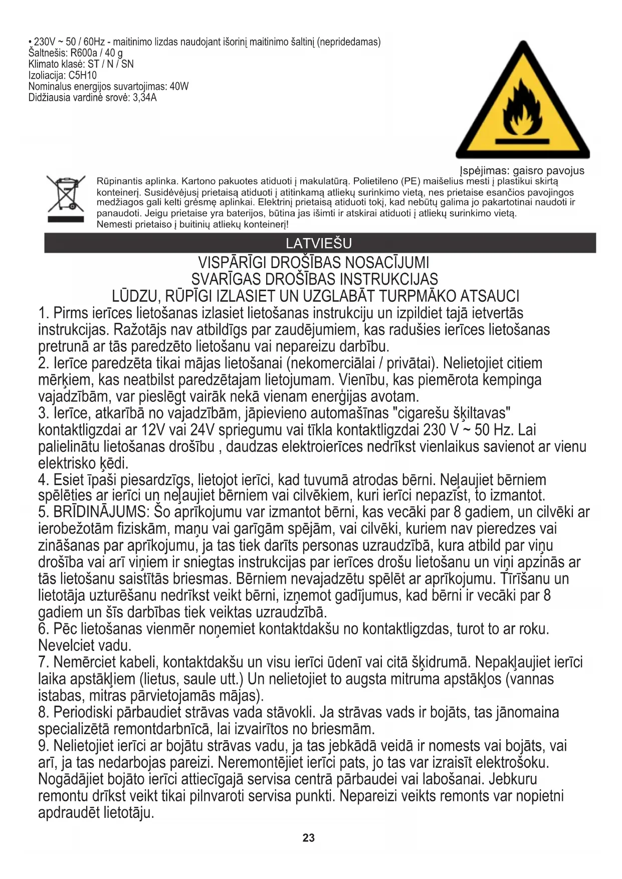 kontaktligzdai ar 12V vai 24V spriegumu vai tīkla kontaktligzdai 230 V ~ 50 Hz. Lai palielinātu lietošanas drošību , daudzas elektroierīces nedrīkst vienlaikus savienot ar vienu elektrisko ķēdi.