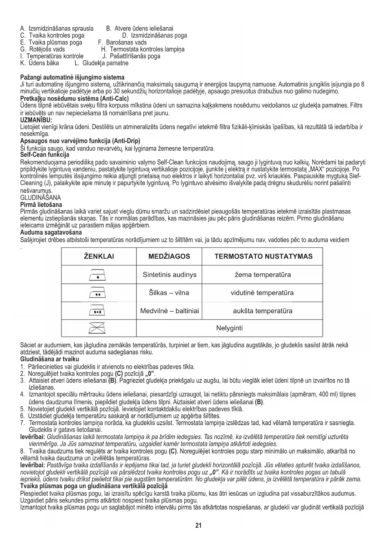 3. Attaisiet atveri ūdens ieliešanai (B). Pagrieziet gludekļa priekšgalu uz augšu, lai būtu vieglāk ieliet ūdeni tilpnē un izvairītos no tā izliešanas. 7. Termostata kontroles lampiņa norāda, ka gludeklis uzsilst. Termostata lampiņa izslēdzas tad, kad vēlamā temperatūra ir sasniegta. Gludeklis ir gatavs lietošanai. GLUDINĀŠANA Rekomenduojama periodišką pado savaiminio valymo Self-Clean funkcijos naudojimą, saugo ji lygintuvą nuo kalkių. Norėdami tai padaryti pripildykite lygintuvą vandeniu, pastatykite lygintuvą vertikalioje pozicijoje, įjunkite į elektrą ir nustatykite termostatą „MAX“ pozicijoje. Po kontrolinės lemputės išsijungimo reikia atjungti prietaisą nuo elektros ir laikyti horizontaliai pvz. virš kriauklės. Paspauskite mygtuką Slef- Cleaning (J), palaikykite apie minutę ir papurtykite lygintuvą. Po lygintuvo atvėsimo išvalykite padą drėgnu skudurėliu norint pašalinti nešvarumus. Ši funkcija saugo, kad vanduo nevarvėtų, kai lyginama žemesne temperatūra. Pirmā lietošana Piespiediet tvaika plūsmas pogu, lai izraisītu spēcīgu karstā tvaika plūsmu, kas ātri iesūcas un izgludina pat vissaburzītākos audumus. Uzgaidiet pāris sekundes pirms atkārtoti nospiest tvaika plūsmas pogu. Tvaika plūsmas poga un gludināšana vertikālā pozīcijā 8. Tvaika daudzums tiek regulēts ar tvaika kontroles pogu (C). Noregulējiet kontroles pogu starp minimālo un maksimālo, atkarībā no vēlamā tvaika daudzuma un izvēlētās temperatūras. Izmantojot tvaika plūsmas pogu un saglabājot minēto intervālu pirms tās atkārtotas nospiešanas, ar gludekli var gludināt vertikalā pozīcijā Ievērībai: Pastāvīga tvaika izdalīšanās ir iepējama tikai tad, ja turiet gludekli horizontālā pozīcijā. Jūs vēlaties apturēt tvaika izdalīšanos, novietojot gludekli vertikālā pozīcijā vai pārslēdzot tvaika kontroles pogu uz „0”. Kā ir norādīts uz tvaika kontroles pogas un tabulā iepriekš, ūdens tvaiku drīkst pielietot tikai pie augstām temperatūrām. No gludekļa var pilēt ūdens, ja izvēlētā temperatūra ir pārāk zema.