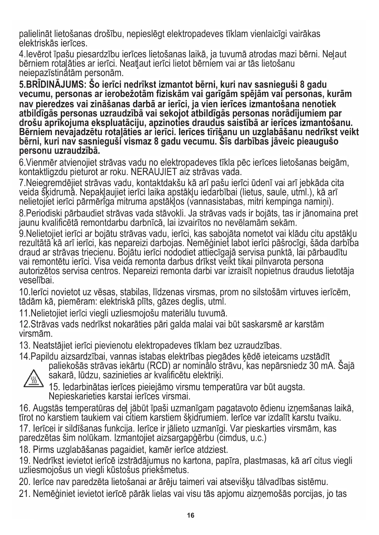 paredzētas šim nolūkam. Izmantojiet aizsargapģērbu (cimdus, u.c.) palielināt lietošanas drošību, nepieslēgt elektropadeves tīklam vienlaicīgi vairākas elektriskās ierīces. 4.Ievērot īpašu piesardzību ierīces lietošanas laikā, ja tuvumā atrodas mazi bērni. Neļaut bērniem rotaļāties ar ierīci. Neatļaut ierīci lietot bērniem vai ar tās lietošanu neiepazīstinātām personām. 5.BRĪDINĀJUMS: Šo ierīci nedrīkst izmantot bērni, kuri nav sasnieguši 8 gadu vecumu, personas ar ierobežotām fiziskām vai garīgām spējām vai personas, kurām nav pieredzes vai zināšanas darbā ar ierīci, ja vien ierīces izmantošana nenotiek atbildīgās personas uzraudzībā vai sekojot atbildīgās personas norādījumiem par drošu aprīkojuma ekspluatāciju, apzinoties draudus saistībā ar ierīces izmantošanu. Bērniem nevajadzētu rotaļāties ar ierīci. Ierīces tīrīšanu un uzglabāšanu nedrīkst veikt bērni, kuri nav sasnieguši vismaz 8 gadu vecumu. Šīs darbības jāveic pieaugušo personu uzraudzībā. 7.Neiegremdējiet strāvas vadu, kontaktdakšu kā arī pašu ierīci ūdenī vai arī jebkāda cita veida šķidrumā. Nepakļaujiet ierīci laika apstākļu iedarbībai (lietus, saule, utml.), kā arī nelietojiet ierīci pārmērīga mitruma apstākļos (vannasistabas, mitri kempinga namiņi). 6.Vienmēr atvienojiet strāvas vadu no elektropadeves tīkla pēc ierīces lietošanas beigām, kontaktligzdu pieturot ar roku. NERAUJIET aiz strāvas vada. 10.Ierīci novietot uz vēsas, stabilas, līdzenas virsmas, prom no silstošām virtuves ierīcēm, tādām kā, piemēram: elektriskā plīts, gāzes deglis, utml. 11.Nelietojiet ierīci viegli uzliesmojošu materiālu tuvumā. 8.Periodiski pārbaudiet strāvas vada stāvokli. Ja strāvas vads ir bojāts, tas ir jānomaina pret jaunu kvalificētā remontdarbu darbnīcā, lai izvairītos no nevēlamām sekām. 9.Nelietojiet ierīci ar bojātu strāvas vadu, ierīci, kas sabojāta nometot vai klādu citu apstākļu rezultātā kā arī ierīci, kas nepareizi darbojas. Nemēģiniet labot ierīci pāšrocīgi, šāda darbība draud ar strāvas triecienu. Bojātu ierīci nododiet attiecīgajā servisa punktā, lai pārbaudītu vai remontētu ierīci. Visa veida remonta darbus drīkst veikt tikai pilnvarota persona autorizētos servisa centros. Nepareizi remonta darbi var izraisīt nopietnus draudus lietotāja veselībai. 14.Papildu aizsardzībai, vannas istabas elektrības piegādes ķēdē ieteicams uzstādīt paliekošās strāvas iekārtu (RCD) ar nominālo strāvu, kas nepārsniedz 30 mA. Šajā sakarā, lūdzu, sazinieties ar kvalificētu elektriķi. 12.Strāvas vads nedrīkst nokarāties pāri galda malai vai būt saskarsmē ar karstām virsmām.