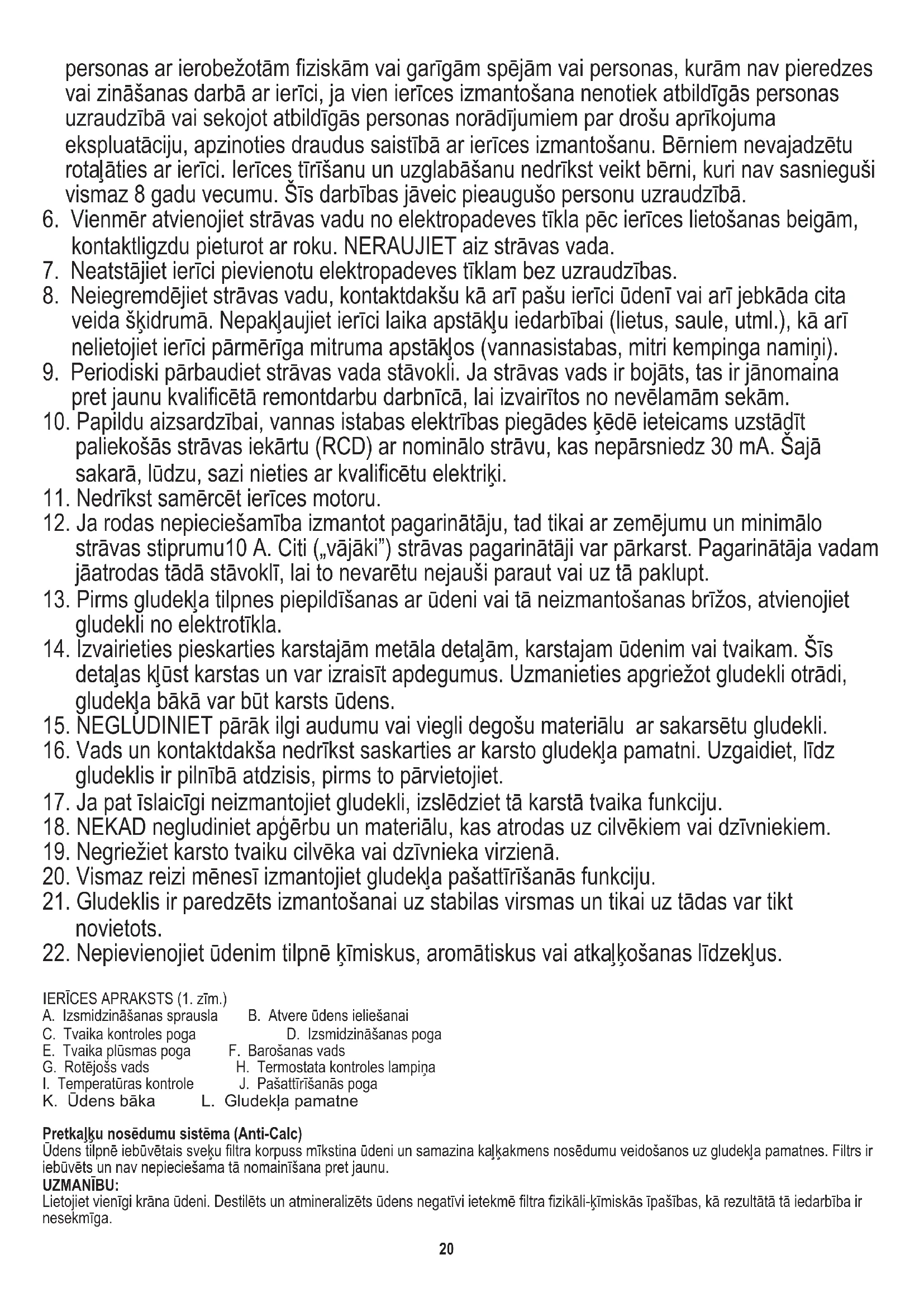 K. Ūdens bāka L. Gludekļa pamatne Pretkaļķu nosēdumu sistēma (Anti-Calc) Ūdens tilpnē iebūvētais sveķu filtra korpuss mīkstina ūdeni un samazina kaļķakmens nosēdumu veidošanos uz gludekļa pamatnes. Filtrs ir iebūvēts un nav nepieciešama tā nomainīšana pret jaunu.