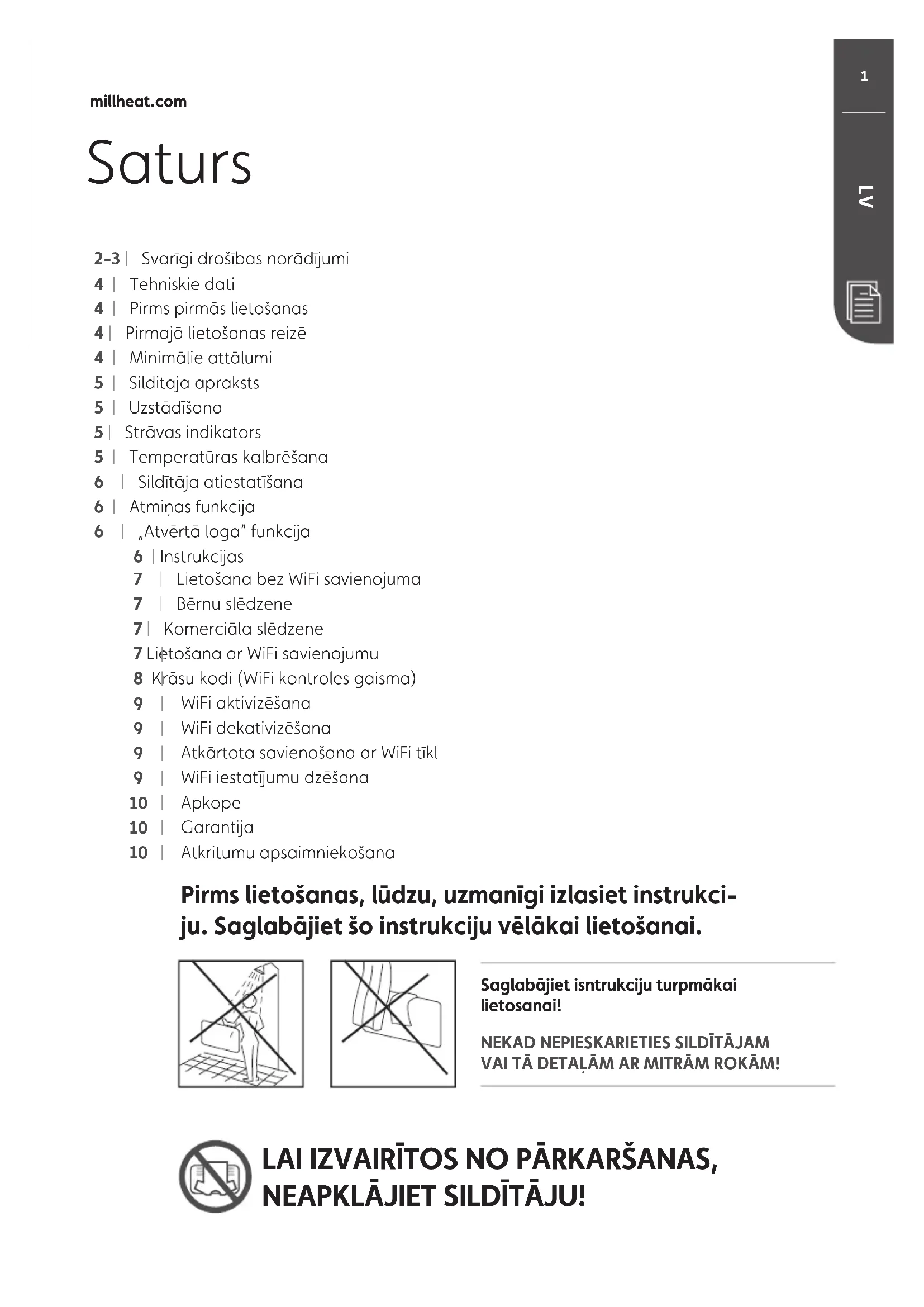EESaturs 2-3 | Svarīgi drošības norādījumi 4 | Tehniskie dati 4 | Pirms pirmās lietošanas 4 | Pirmajā lietošanas reizē 4 | Minimālie attālumi 5 | Silditaja apraksts 5 | Uzstādīšana 5 | Strāvas indikators 5 | Temperatūras kalbrēšana 6 | Sildītāja atiestatīšana 6 | Atmiņas funkcija 6 | „Atvērtā loga” funkcija 6 | Instrukcijas 7 | Lietošana bez WiFi savienojuma 7 | Bērnu slēdzene 7 | Komerciāla slēdzene 7 Lietošana ar WiFi savienojumu 8 Krāsu kodi (WiFi kontroles gaisma)