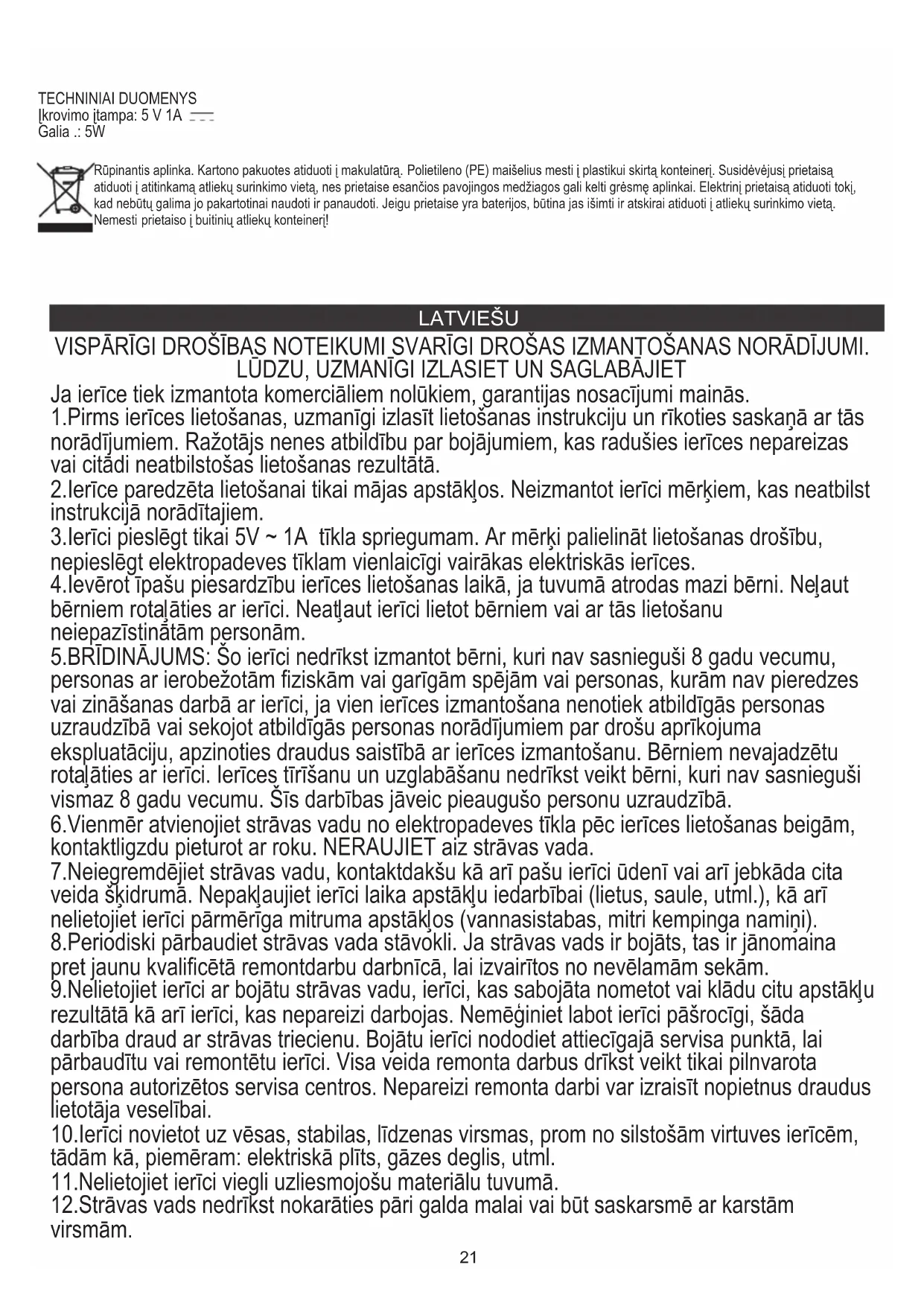 Barzdos, ūsų ir šoninių plaukų plaukai turi būti sausi. Venkite naudoti losjonus prieš naudodami savo asmeninį kirpėją. Šukuokite plaukus jų augimo kryptimi. Nuimkite žoliapjovės šukos tvirtinimą, jei: nustatote plaukų linijos kraštus, tokius kaip šoniniai raiščiai, apipjaukite pakaušį, apipjaukite barzdos liniją kaklo priekyje. Valymas: Po kiekvieno naudojimo išjunkite įrenginį. Likusius plaukus švelniai nuvalykite pritvirtintomis šukomis (12). Šukos priedus ir ašmenis valykite tik tada, kai jie yra pašalinti iš pagrindinio prietaiso. Naudokite tik lengvą siuvimo mašinos aliejų arba aliejų, pritvirtintą prie prietaiso. Prietaisą galima plauti vandeniu, tačiau prieš laikydami prietaisą, išdžiovinkite jį minkštu sausu rankšluosčiu.21 LATVIEŠU Rūpinantis aplinka. Kartono pakuotes atiduoti į makulatūrą. Polietileno (PE) maišelius mesti į plastikui skirtą konteinerį. Susidėvėjusį prietaisą atiduoti į atitinkamą atliekų surinkimo vietą, nes prietaise esančios pavojingos medžiagos gali kelti grėsmę aplinkai. Elektrinį prietaisą atiduoti tokį, kad nebūtų galima jo pakartotinai naudoti ir panaudoti. Jeigu prietaise yra baterijos, būtina jas išimti ir atskirai atiduoti į atliekų surinkimo vietą. Nemesti prietaiso į buitinių atliekų konteinerį! TECHNINIAI DUOMENYS Įkrovimo įtampa: 5 V 1A Galia .: 5W 9.Nelietojiet ierīci ar bojātu strāvas vadu, ierīci, kas sabojāta nometot vai klādu citu apstākļu rezultātā kā arī ierīci, kas nepareizi darbojas. Nemēģiniet labot ierīci pāšrocīgi, šāda darbība draud ar strāvas triecienu. Bojātu ierīci nododiet attiecīgajā servisa punktā, lai pārbaudītu vai remontētu ierīci. Visa veida remonta darbus drīkst veikt tikai pilnvarota persona autorizētos servisa centros. Nepareizi remonta darbi var izraisīt nopietnus draudus lietotāja veselībai. 10.Ierīci novietot uz vēsas, stabilas, līdzenas virsmas, prom no silstošām virtuves ierīcēm, tādām kā, piemēram: elektriskā plīts, gāzes deglis, utml. 11.Nelietojiet ierīci viegli uzliesmojošu materiālu tuvumā. 12.Strāvas vads nedrīkst nokarāties pāri galda malai vai būt saskarsmē ar karstām virsmām. VISPĀRĪGI DROŠĪBAS NOTEIKUMI SVARĪGI DROŠAS IZMANTOŠANAS NORĀDĪJUMI. LŪDZU, UZMANĪGI IZLASIET UN SAGLABĀJIET Ja ierīce tiek izmantota komerciāliem nolūkiem, garantijas nosacījumi mainās. 1.Pirms ierīces lietošanas, uzmanīgi izlasīt lietošanas instrukciju un rīkoties saskaņā ar tās norādījumiem. Ražotājs nenes atbildību par bojājumiem, kas radušies ierīces nepareizas vai citādi neatbilstošas lietošanas rezultātā. 2.Ierīce paredzēta lietošanai tikai mājas apstākļos. Neizmantot ierīci mērķiem, kas neatbilst instrukcijā norādītajiem. 3.Ierīci pieslēgt tikai 5V ~ 1A tīkla spriegumam. Ar mērķi palielināt lietošanas drošību, nepieslēgt elektropadeves tīklam vienlaicīgi vairākas elektriskās ierīces. 4.Ievērot īpašu piesardzību ierīces lietošanas laikā, ja tuvumā atrodas mazi bērni. Neļaut bērniem rotaļāties ar ierīci. Neatļaut ierīci lietot bērniem vai ar tās lietošanu neiepazīstinātām personām. 5.BRĪDINĀJUMS: Šo ierīci nedrīkst izmantot bērni, kuri nav sasnieguši 8 gadu vecumu, personas ar ierobežotām fiziskām vai garīgām spējām vai personas, kurām nav pieredzes vai zināšanas darbā ar ierīci, ja vien ierīces izmantošana nenotiek atbildīgās personas uzraudzībā vai sekojot atbildīgās personas norādījumiem par drošu aprīkojuma ekspluatāciju, apzinoties draudus saistībā ar ierīces izmantošanu. Bērniem nevajadzētu rotaļāties ar ierīci. Ierīces tīrīšanu un uzglabāšanu nedrīkst veikt bērni, kuri nav sasnieguši vismaz 8 gadu vecumu. Šīs darbības jāveic pieaugušo personu uzraudzībā. 6.Vienmēr atvienojiet strāvas vadu no elektropadeves tīkla pēc ierīces lietošanas beigām, kontaktligzdu pieturot ar roku. NERAUJIET aiz strāvas vada. 7.Neiegremdējiet strāvas vadu, kontaktdakšu kā arī pašu ierīci ūdenī vai arī jebkāda cita veida šķidrumā. Nepakļaujiet ierīci laika apstākļu iedarbībai (lietus, saule, utml.), kā arī nelietojiet ierīci pārmērīga mitruma apstākļos (vannasistabas, mitri kempinga namiņi). 8.Periodiski pārbaudiet strāvas vada stāvokli. Ja strāvas vads ir bojāts, tas ir jānomaina pret jaunu kvalificētā remontdarbu darbnīcā, lai izvairītos no nevēlamām sekām.22