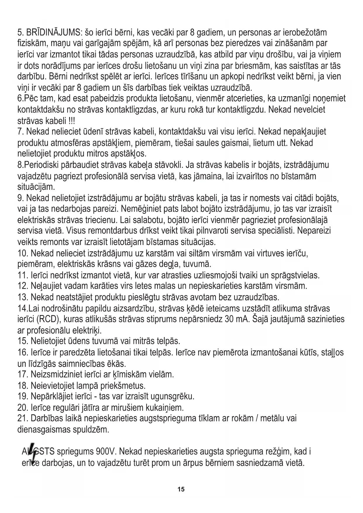 15. Nelietojiet ūdens tuvumā vai mitrās telpās.