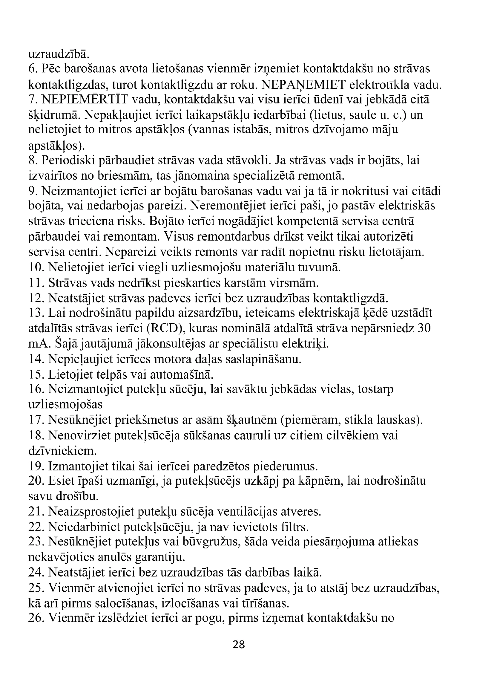 16. Neizmantojiet putekļu sūcēju, lai savāktu jebkādas vielas, tostarp