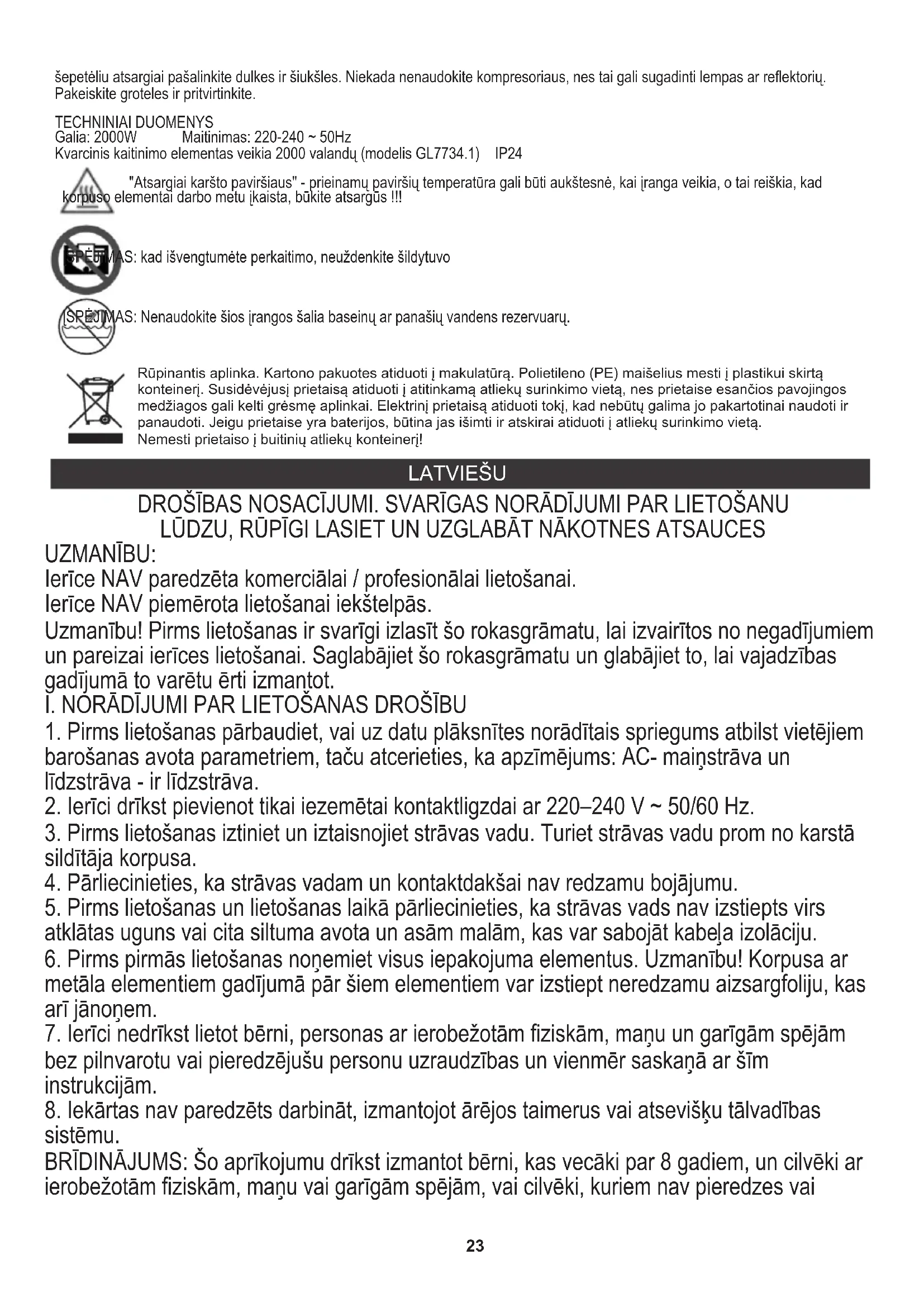 sistēmu. BRĪDINĀJUMS: Šo aprīkojumu drīkst izmantot bērni, kas vecāki par 8 gadiem, un cilvēki ar ierobežotām fiziskām, maņu vai garīgām spējām, vai cilvēki, kuriem nav pieredzes vai šepetėliu atsargiai pašalinkite dulkes ir šiukšles. Niekada nenaudokite kompresoriaus, nes tai gali sugadinti lempas ar reflektorių. Pakeiskite groteles ir pritvirtinkite. TECHNINIAI DUOMENYS Galia: 2000W Maitinimas: 220-240 ~ 50Hz Kvarcinis kaitinimo elementas veikia 2000 valandų (modelis GL7734.1) IP24 "Atsargiai karšto paviršiaus" - prieinamų paviršių temperatūra gali būti aukštesnė, kai įranga veikia, o tai reiškia, kad korpuso elementai darbo metu įkaista, būkite atsargūs !!! ĮSPĖJIMAS: kad išvengtumėte perkaitimo, neuždenkite šildytuvo ĮSPĖJIMAS: Nenaudokite šios įrangos šalia baseinų ar panašių vandens rezervuarų.24 zināšanas par aprīkojumu, TIKAI tad, ja tas tiek darīts tādas personas uzraudzībā, kura atbild par viņu drošībai vai ja viņi ir apmācīti par ierīces drošu lietošanu un apzinās ar tās lietošanu saistītās briesmas. Bērniem nevajadzētu spēlēt ar aprīkojumu. Ierīces tīrīšanu un apkopi nedrīkst veikt bērni, ja vien viņi nav vecāki par 8 gadiem un šīs darbības veic uzraudzībā
