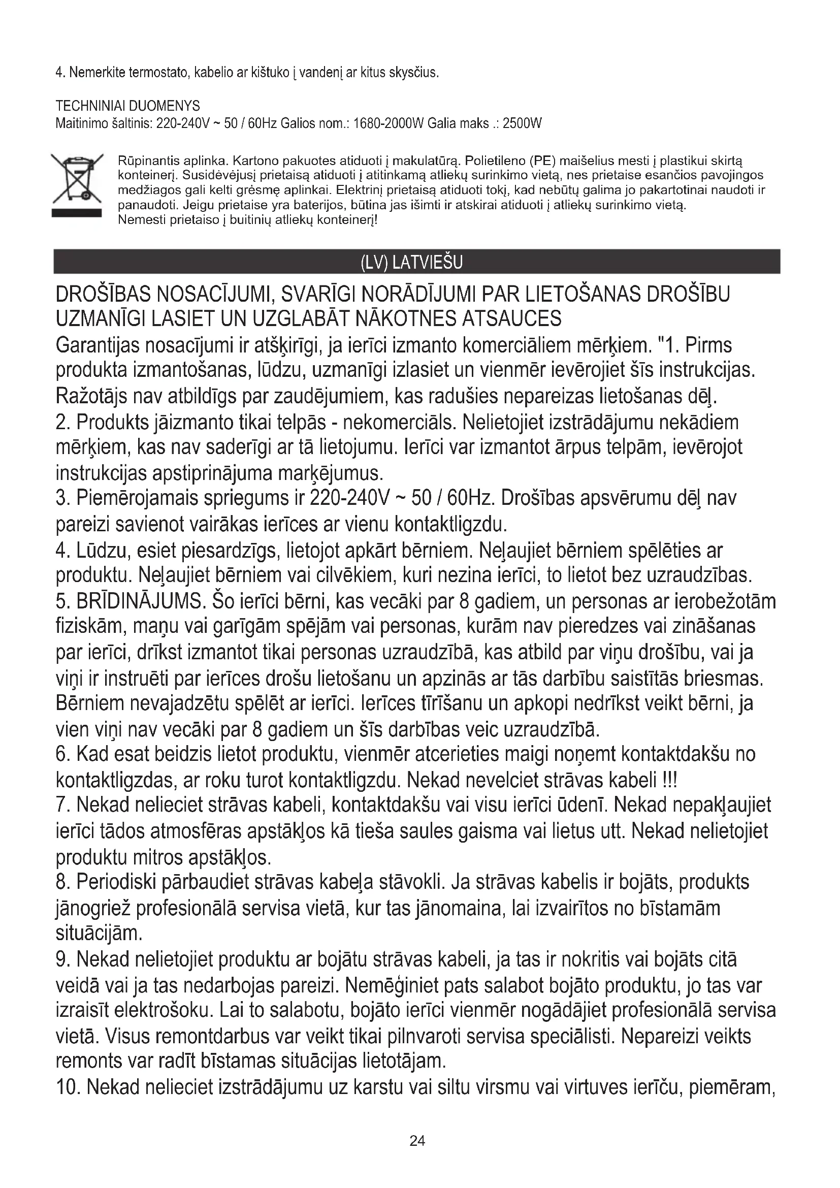 Apkārtējās vides aizsardzība. Kartona iepakojumu, lūdzu, nododiet otreizējai pārstrādei. Polietilēna maisiņus (PE) izmest plastmasas izstrādājumiem paredzētajos konteineros. Lietotās elektropreces nododiet attiecīgajos pieņemšanas punktos. Ierīcē satur bīstamas sastāvdaļas, kas var izraisīt draudus apkārtējai videi. Elektroierīce jānodod tā, lai ierobežotu tās atkārtotu izmantošanu. Ja ierīcē atrodas baterijas, izņemiet tās un nododiet pieņemšanas punktā atsevišķi. Produktu neizmest sadzīves atkritumu konteinerā!