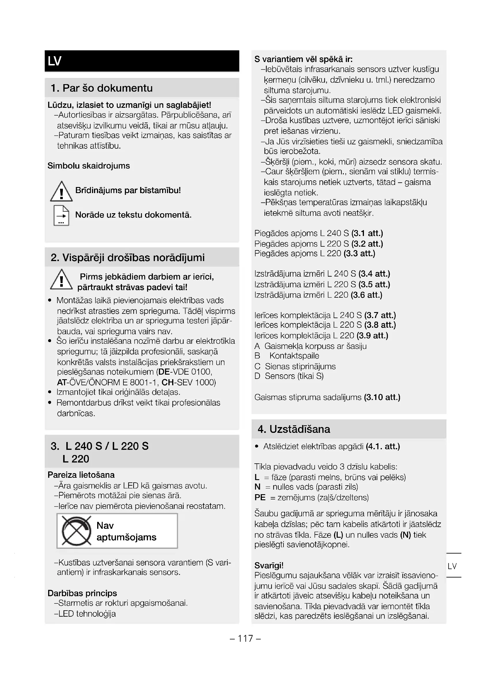 L 220 Pareiza lietošana – Āra gaismeklis ar LED kā gaismas avotu. – Piemērots motāžai pie sienas ārā. – Ierīce nav piemērota pievienošanai reostatam. Nav aptumšojams – Kustības uztveršanai sensora varantiem (S vari- antiem) ir infraskarkanais sensors. Darbības princips – Starmetis ar rokturi apgaismošanai. – LED tehnoloģija S variantiem vēl spēkā ir: – Iebūvētais infrasarkanais sensors uztver kustīgu ķermeņu (cilvēku, dzīvnieku u. tml.) neredzamo siltuma starojumu. – Šis saņemtais siltuma starojums tiek elektroniski pārveidots un automātiski ieslēdz LED gaismekli. – Droša kustības uztvere, uzmontējot ierīci sāniski pret iešanas virzienu. – Ja Jūs virzīsieties tieši uz gaismekli, sniedzamība būs ierobežota. – Šķēršļi (piem., koki, mūri) aizsedz sensora skatu. – Caur šķēršļiem (piem., sienām vai stiklu) termis- kais starojums netiek uztverts, tātad – gaisma ieslēgta netiek. – Pēkšņas temperatūras izmaiņas laikapstākļu ietekmē siltuma avoti neatšķir. Piegādes apjoms L 240 S (3.1 att.) Piegādes apjoms L 220 S (3.2 att.) Piegādes apjoms L 220 (3.3 att.) Izstrādājuma izmēri L 240 S (3.4 att.) Izstrādājuma izmēri L 220 S (3.5 att.) Izstrādājuma izmēri L 220 (3.6 att.) Ierīces komplektācija L 240 S (3.7 att.) Ierīces komplektācija L 220 S (3.8 att.) Ierīces komplektācija L 220 (3.9 att.) A Gaismekļa korpuss ar šasiju B Kontaktspaile C Sienas stiprinājums D Sensors (tikai S) Gaismas stipruma sadalījums (3.10 att.)