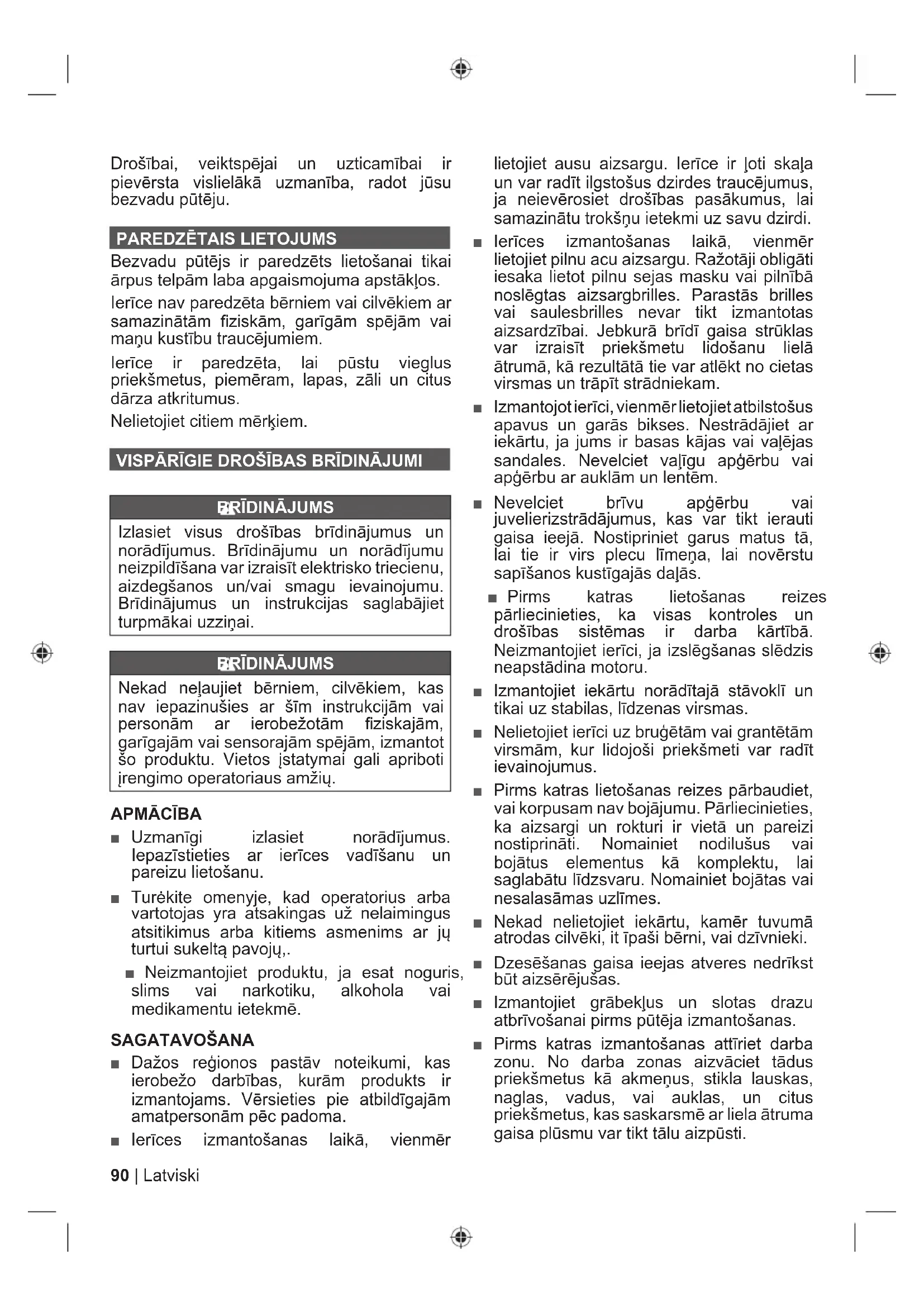■ Uzmanīgi izlasiet norādījumus. Iepazīstieties ar ierīces vadīšanu un pareizu lietošanu. ■ Turėkite omenyje, kad operatorius arba vartotojas yra atsakingas už nelaimingus atsitikimus arba kitiems asmenims ar jų turtui sukeltą pavojų,. ■ Neizmantojiet produktu, ja esat noguris, slims vai narkotiku, alkohola vai medikamentu ietekmē. SAGATAVOŠANA ■ Dažos reģionos pastāv noteikumi, kas ierobežo darbības, kurām produkts ir izmantojams. Vērsieties pie atbildīgajām amatpersonām pēc padoma. ■ Ierīces izmantošanas laikā, vienmēr lietojiet ausu aizsargu. Ierīce ir ļoti skaļa un var radīt ilgstošus dzirdes traucējumus, ja neievērosiet drošības pasākumus, lai samazinātu trokšņu ietekmi uz savu dzirdi. ■ Ierīces izmantošanas laikā, vienmēr lietojiet pilnu acu aizsargu. Ražotāji obligāti iesaka lietot pilnu sejas masku vai pilnībā noslēgtas aizsargbrilles. Parastās brilles vai saulesbrilles nevar tikt izmantotas aizsardzībai. Jebkurā brīdī gaisa strūklas var izraisīt priekšmetu lidošanu lielā ātrumā, kā rezultātā tie var atlēkt no cietas virsmas un trāpīt strādniekam. ■ Izmantojot ierīci, vienmēr lietojiet atbilstošus apavus un garās bikses. Nestrādājiet ar iekārtu, ja jums ir basas kājas vai vaļējas sandales. Nevelciet vaļīgu apģērbu vai apģērbu ar auklām un lentēm. ■ Nevelciet brīvu apģērbu vai juvelierizstrādājumus, kas var tikt ierauti gaisa ieejā. Nostipriniet garus matus tā, lai tie ir virs plecu līmeņa, lai novērstu sapīšanos kustīgajās daļās. ■ Pirms katras lietošanas reizes pārliecinieties, ka visas kontroles un drošības sistēmas ir darba kārtībā. Neizmantojiet ierīci, ja izslēgšanas slēdzis neapstādina motoru. ■ Izmantojiet iekārtu norādītajā stāvoklī un tikai uz stabilas, līdzenas virsmas. ■ Nelietojiet ierīci uz bruģētām vai grantētām virsmām, kur lidojoši priekšmeti var radīt ievainojumus. ■ Pirms katras lietošanas reizes pārbaudiet, vai korpusam nav bojājumu. Pārliecinieties, ka aizsargi un rokturi ir vietā un pareizi nostiprināti. Nomainiet nodilušus vai bojātus elementus kā komplektu, lai saglabātu līdzsvaru. Nomainiet bojātas vai nesalasāmas uzlīmes. ■ Nekad nelietojiet iekārtu, kamēr tuvumā atrodas cilvēki, it īpaši bērni, vai dzīvnieki. ■ Dzesēšanas gaisa ieejas atveres nedrīkst būt aizsērējušas. ■ Izmantojiet grābekļus un slotas drazu atbrīvošanai pirms pūtēja izmantošanas. ■ Pirms katras izmantošanas attīriet darba zonu. No darba zonas aizvāciet tādus priekšmetus kā akmeņus, stikla lauskas, naglas, vadus, vai auklas, un citus priekšmetus, kas saskarsmē ar liela ātruma gaisa plūsmu var tikt tālu aizpūsti.91 Latviski |
