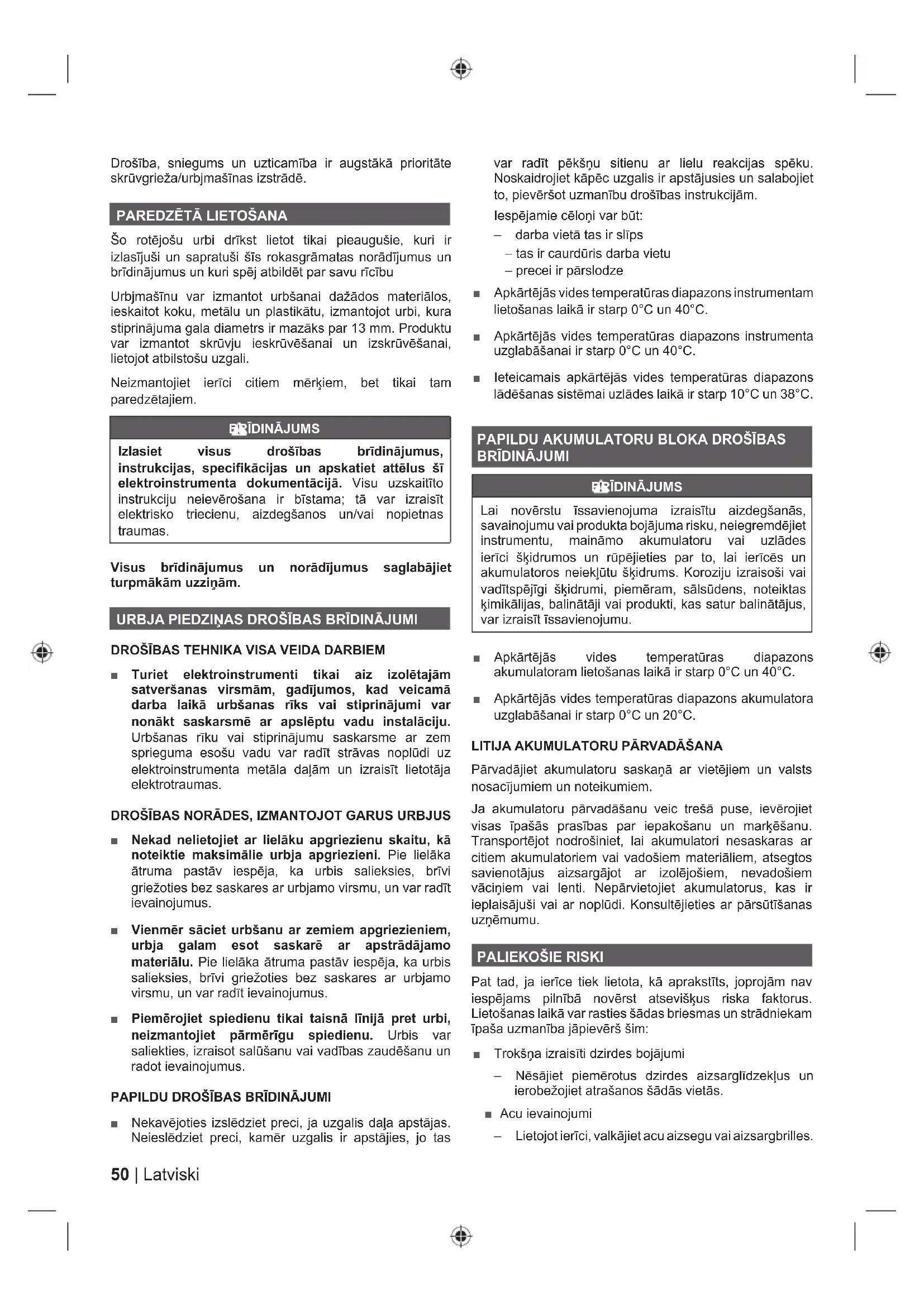 ■ Nekavējoties izslēdziet preci, ja uzgalis daļa apstājas. Neieslēdziet preci, kamēr uzgalis ir apstājies, jo tas var radīt pēkšņu sitienu ar lielu reakcijas spēku. Noskaidrojiet kāpēc uzgalis ir apstājusies un salabojiet to, pievēršot uzmanību drošības instrukcijām. Iespējamie cēloņi var būt: – darba vietā tas ir slīps – tas ir caurdūris darba vietu – precei ir pārslodze ■ Apkārtējās vides temperatūras diapazons instrumentam lietošanas laikā ir starp 0°C un 40°C. ■ Apkārtējās vides temperatūras diapazons instrumenta uzglabāšanai ir starp 0°C un 40°C. ■ Ieteicamais apkārtējās vides temperatūras diapazons lādēšanas sistēmai uzlādes laikā ir starp 10°C un 38°C.