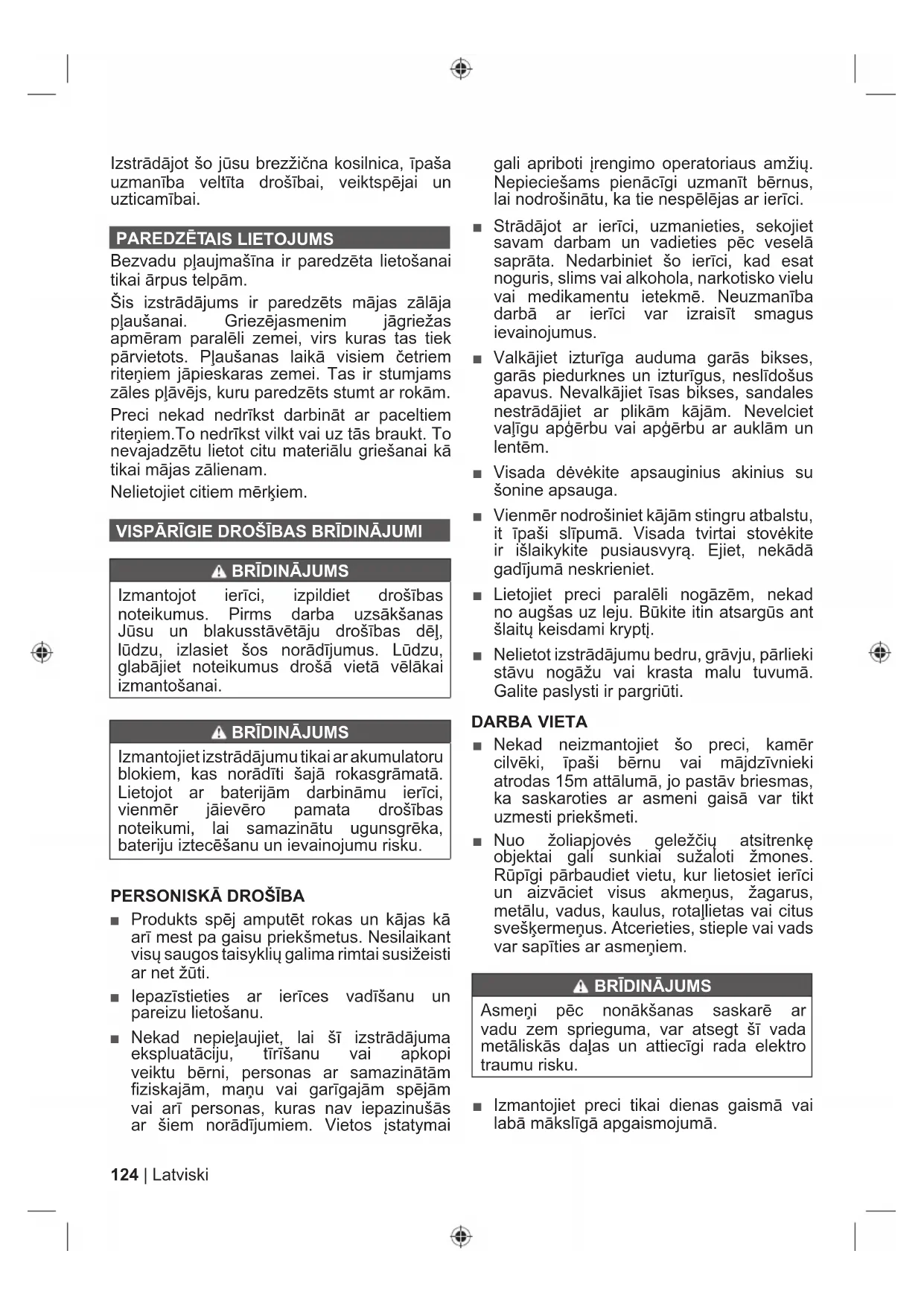 TR■ Nesiet preci uz pilnvarotu pakalpojumu centru, lai nomainītu bojātos vai nesalasāmās uzlīmes. ■ Bieži un regulāri pārbaudiet visu uzgriežņu, bultskrūvju un skrūvju stingrību, lai pārliecinātos, vai aprīkojums ir drošā darba stāvoklī. ■ Bieži pārbaudiet, vai zāles satvērējs nav nolietojies, nodilis, kā arī vai tajā nav radušies caurumi. ■ Pirms izstrādājuma lietošanas, aizvietojiet nolietojušās vai bojātas detaļas. ■ Preci jāiedarbina, lietotājam atrodoties aiz roktura, operatora drošības zonā. Nekad nedarbiniet preci, ja: ● visi četri riteņi neatrodas uz zemes ● zāles izmešanas atvere ir atvērta un to neaizsargā zāles uztveršanas grozs un zāles izmešanas atveres aizsargvāks ● visi personu rokas un pēdas ir pakļautas griešanas ierīcēm ■ Nekad nedarbiniet preci, ja iesl./izsl. slēdzis uz roktura pareizi neieslēdzas un neaptur preci. ■ Nekad nemēģiniet ieslēgšanas/izslēgšanas slēdžus bloķēt ieslēgšanas pozīcijā, jo tas ir ļoti bīstami. ■ Nepielietojiet spēku, izmantojot ražojumu. Tas darbu darīs labāk un drošāk ar ātrumu, kādam tas ticis izstrādāts. ■ Apturiet asmeni, kad šķērsojat grantētas virsmas. ■ Nevilkt izstrādājumu atmuguriski, izņemot, ja absolūti nepieciešams. Ja ierīce ir jāvirza atpakaļ no sienas vai šķēršļa, vispirms paskatieties uz leju un aiz sevis, lai nepakluptu vai neuzvilktu ierīci uz kājām. ■ Ja zāles pļāvējs ir jāsasver transportēšanai, šķērsojot citas virsmas, izņemot zāli, un transportējot zāles pļāvēju uz pļaujamo teritoriju vai no tās, izslēdziet motoru un pagaidiet, līdz asmens apstājas. ■ Nekad nelietojiet iekārtu, ja ir bojāti aizsargi vai pārsegi vai drošības ierīces, piemēram, deflektori un/vai zāles savācējs, neatrodas vietā. ■ Nesasveriet produktu, kad ieslēdzat motoru vai kamēr motors darbojas. Ja īpaši nepieciešams, jūs varat pacelt pļaujmašīnas priekšpusi ne vairāk kā 5 cm, lai atvieglotu palaišanu. Lai to panāktu, spiediet uz leju rokturi. Pirms sākt pļaušanu, vienmēr atgrieziet pļaujmašīnu tās normālajā stāvoklī at visiem četriem riteņiem uz zemes. Pļaujmašīnas pacelšana atsedz asmeni, palielinot iespējamību dažādu priekšmetu mešanai un nejaušai saskarsmei ar asmeni. ■ Uzmanīgi, saskaņā ar norādēm ieslēdziet motoru, turiet rokas un kājas atstatu no asmeņiem. Nenovietojiet rokas vai kājas zem rotējošām detaļām vai to tuvumā. ■ Nekad nepaceliet vai nesiet preci, kamēr darbojas motors. ■ Apturiet izstrādājumu, izņemiet bloķēšanas atslēgu un noņemiet akumulatoru. Pārliecinieties, ka visas kustīgās daļas ir pilnīgi apstājušās: ● ja atstājat preci nepieskatītu (tai skaitā atbrīvojoties no zāles). ● pirms tīrīt nosprostojumu vai atbrīvotu zāles izmešanas atveri ● pirms iekārtas pārbaudes, tīrīšanas vai labošanas ● pirms noņemt zāles tvertni vai atvērt zāles izmešanas izvada pārsegu. ● pēc sadursmes ar kādu priekšmetu; pārbaudiet, vai iekārta nav bojāta, un veiciet pirms iedarbināšanas un lietošanas veiciet nepieciešamos remontdarbus. ● ja iekārta sāk neparasti vibrēt (pārbaudiet nekavējoties) – pārbaudot vai nav bojājumu, īpaši asmeņi – nomainiet vai salabojiet bojātās daļas – pārbaudiet un pievelciet vaļīgās detaļas ■ Venkite skylių, provėžų, iškilimų, akmenų ar kitų paslėptų objektų. Nelīdzena zeme var novest pie nejaušas paslīdēšanas un kritiena. ■ Vienmēr nodrošiniet, ka motora kontroles kabelis nekad nav iesprūdis, saspiests vai kā citādi bojāts, salikšanas laikā, vai kad turat rokturi. 126 | LatviskiPAPILDU AKUMULATORU BLOKA