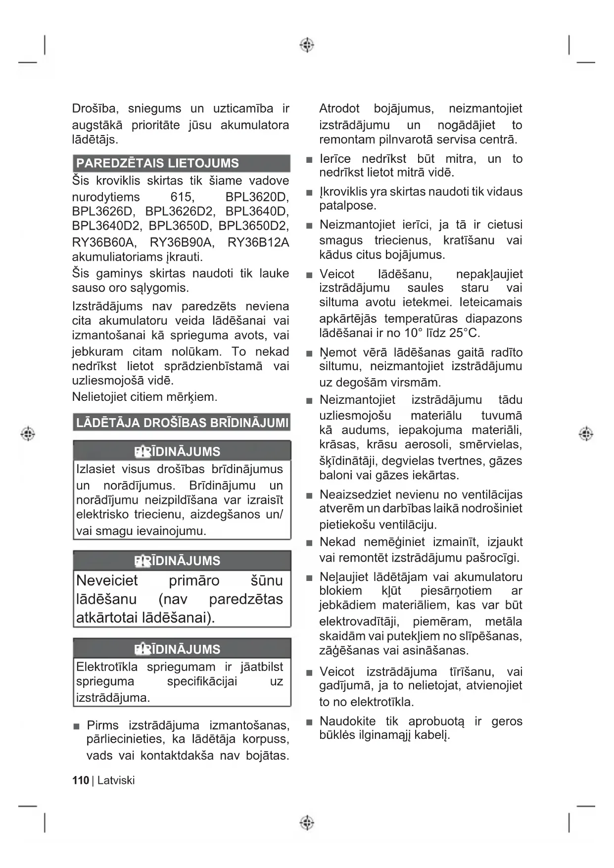 Šis kroviklis skirtas tik šiame vadove nurodytiems 615, BPL3620D, BPL3626D, BPL3626D2, BPL3640D, BPL3640D2, BPL3650D, BPL3650D2, RY36B60A, RY36B90A, RY36B12A akumuliatoriams įkrauti. Šis gaminys skirtas naudoti tik lauke sauso oro sąlygomis. Izstrādājums nav paredzēts neviena cita akumulatoru veida lādēšanai vai izmantošanai kā sprieguma avots, vai jebkuram citam nolūkam. To nekad nedrīkst lietot sprādzienbīstamā vai uzliesmojošā vidē. Nelietojiet citiem mērķiem. LĀDĒTĀJA DROŠĪBAS BRĪDINĀJUMI