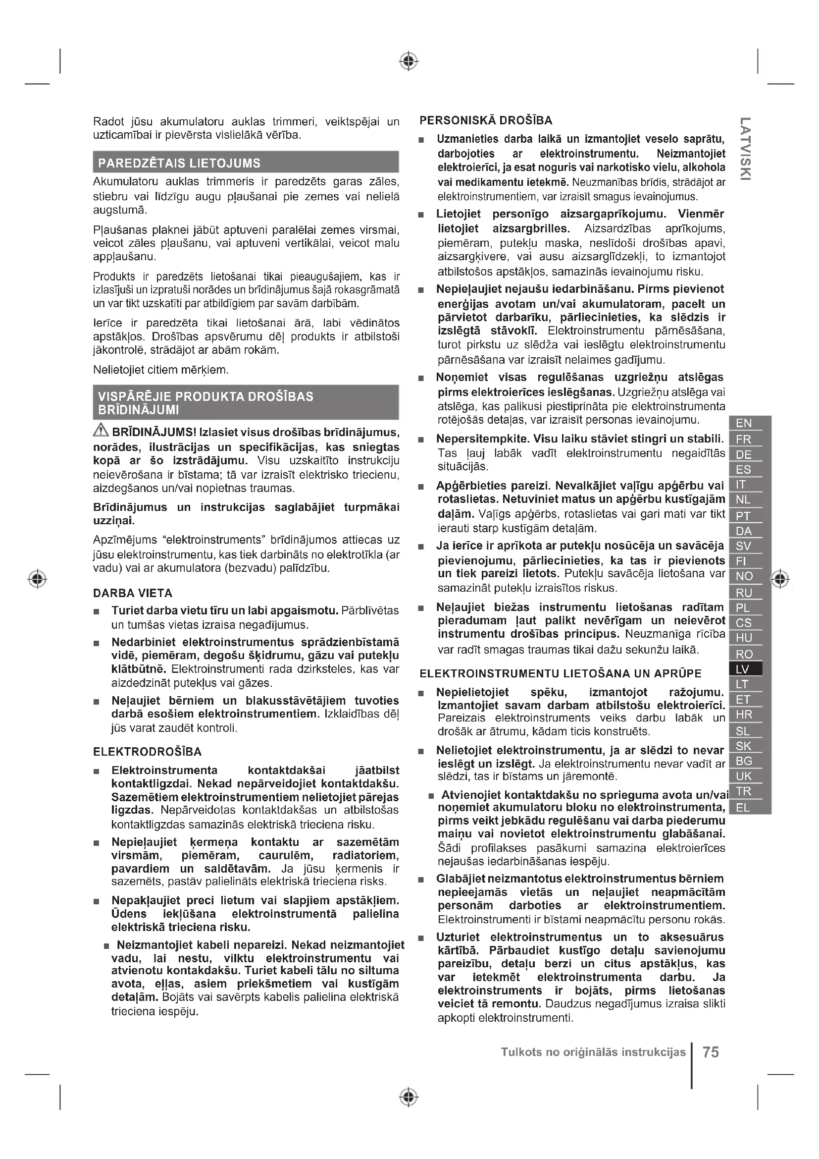 ■ Transportējiet baterijas saskaņā ar vietējiem un valsts noteikumiem un regulām. ■ Ievērojiet visas īpašās prasības saistībā ar iepakošanu un marķēšanu, transportējot trešās puses baterijas. Nodrošiniet, ka baterijas transportā nevar nonākt saskarē ar citām baterijām vai vadītspējīgiem materiāliem, aizsargājot atklātos savienotājus ar nevadošiem izolācijas vāciņiem vai lentēm. Netransportējiet ieplaisājušas baterijas vai baterijas, kurām ir noplūde. Lūdziet padomu kravu pārvadāšanas uzņēmumam. APKOPE ■ Lietojiet tikai oriģinālās ražotāja rezerves daļas, piederumus un uzgaļus. Pretējā gadījumā var tikt radīti ievainojumi un parādīts slikts sniegums, kā arī var tikt anulēta garantija. ■ Aptarnavimą atlikti būtina itin atidžiai, todėl rekomenduojame, kad techninę apžiūrą vykdytų kvalifikuotas specialistas. Veiciet apkalpošanu tikai pilnvarotā servisa centrā. ■ Izslēdziet produktu un noņemiet akumulatora bloku pirms veikt jebkādus apkopes vai tīrīšanas darbus. ■ Jūs varat veikt tikai šajā rokasgrāmatā aprakstīto regulēšanu un remontdarbus. Cita veida remontam vai konsultācijām, vērsieties pēc padoma autorizētā servisa centrā. ■ Aizstāšanai izmantojiet tikai neilona šķiedras auklu, kuras diametrs aprakstīts šīs rokasgrāmatas specifikācijas tabulā. ■ Pēc katras lietošanas reizes notīriet preci ar mīkstu, sausu drāniņu. Jebkura bojāta detaļa jānodod remontam vai nomaiņai pilnvarotā apkopes centrā. ■ Pārbaudiet visus uzgriežņus un skrūves pirms katras lietošanas kā arī ar regulāriem intervāliem, vai tie ir novilkti, lai nodrošinātu izstrādājuma drošu lietošanas stāvokli. Jebkura bojāta detaļa jānodod remontam vai nomaiņai pilnvarotā apkopes centrā. ■ Nesiet preci uz pilnvarotu pakalpojumu centru, lai nomainītu bojātos vai nesalasāmās uzlīmes.78 Tulkots no oriģinālās instrukcijas