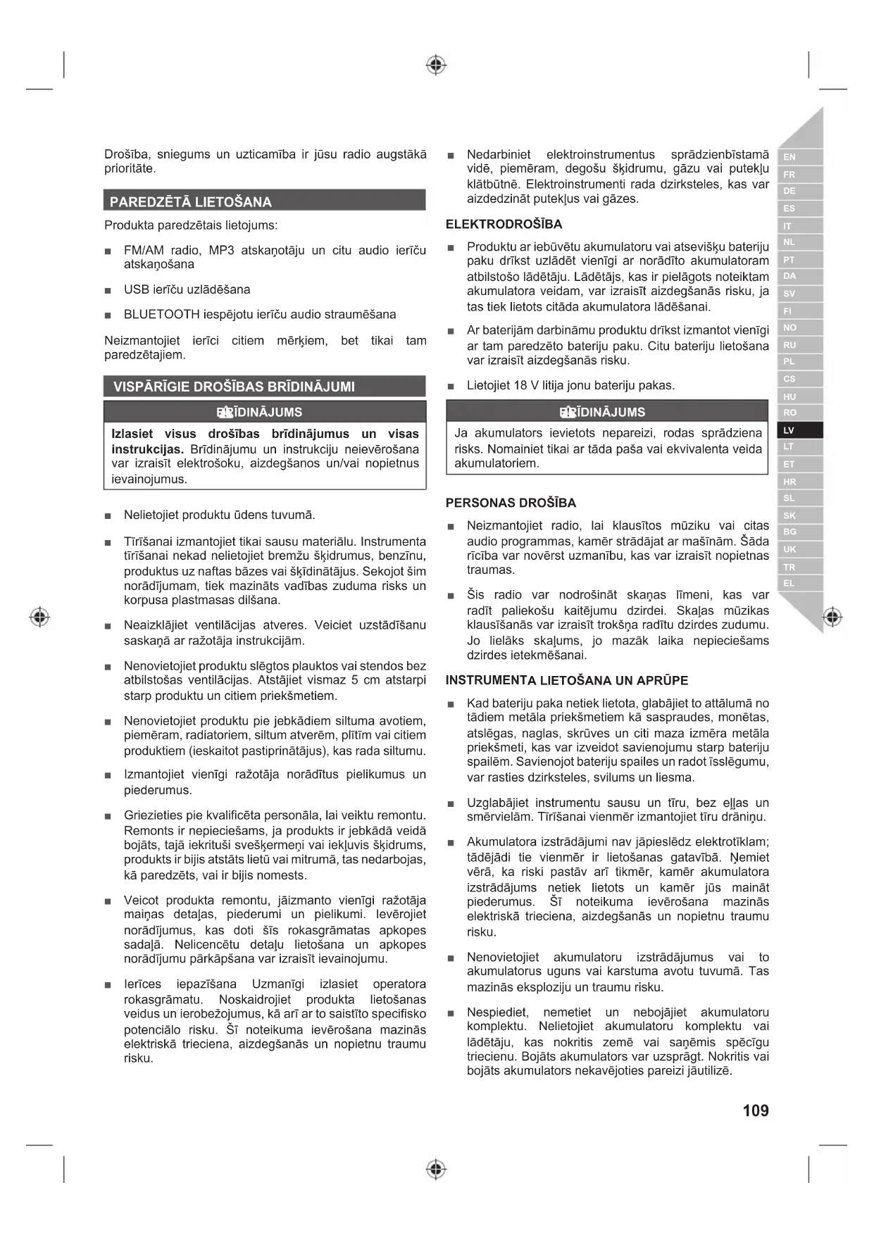 Produkta paredzētais lietojums: ■ FM/AM radio, MP3 atskaņotāju un citu audio ierīču atskaņošana ■ USB ierīču uzlādēšana ■ BLUETOOTH iespējotu ierīču audio straumēšana Neizmantojiet ierīci citiem mērķiem, bet tikai tam paredzētajiem. VISPĀRĪGIE DROŠĪBAS BRĪDINĀJUMI