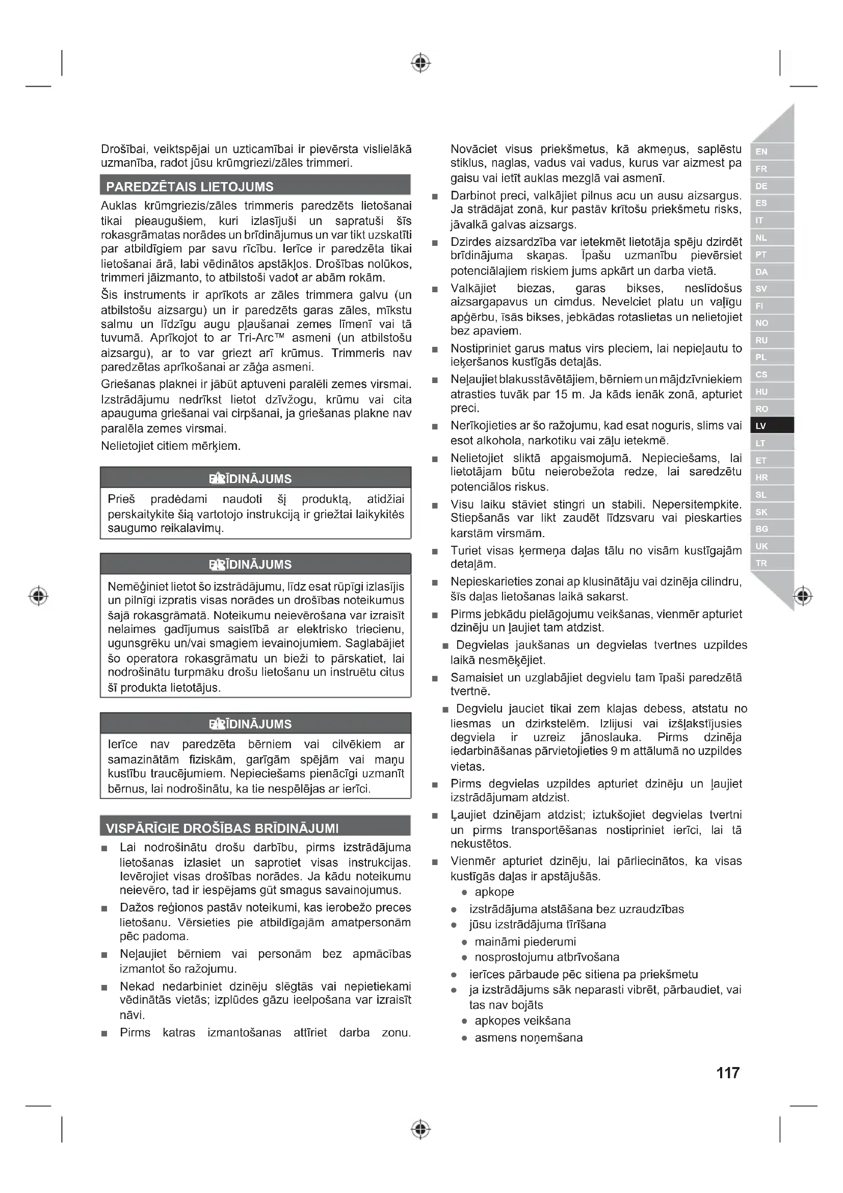 Auklas krūmgriezis/zāles trimmeris paredzēts lietošanai tikai pieaugušiem, kuri izlasījuši un sapratuši šīs rokasgrāmatas norādes un brīdinājumus un var tikt uzskatīti par atbildīgiem par savu rīcību. Ierīce ir paredzēta tikai lietošanai ārā, labi vēdinātos apstākļos. Drošības nolūkos, trimmeri jāizmanto, to atbilstoši vadot ar abām rokām. Šis instruments ir aprīkots ar zāles trimmera galvu (un atbilstošu aizsargu) un ir paredzēts garas zāles, mīkstu salmu un līdzīgu augu pļaušanai zemes līmenī vai tā tuvumā. Aprīkojot to ar Tri-Arc™ asmeni (un atbilstošu aizsargu), ar to var griezt arī krūmus. Trimmeris nav paredzētas aprīkošanai ar zāģa asmeni. Griešanas plaknei ir jābūt aptuveni paralēli zemes virsmai. Izstrādājumu nedrīkst lietot dzīvžogu, krūmu vai cita apauguma griešanai vai cirpšanai, ja griešanas plakne nav paralēla zemes virsmai. Nelietojiet citiem mērķiem.