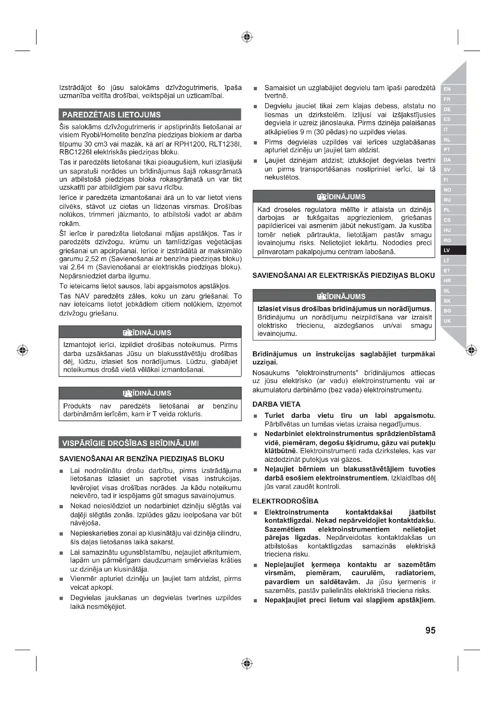vai saites, kas var lidot vai sapīties griešanas brīdī. ■ Pārbaudiet, vai žogā nav priekšmeti, piemēram, žoga stieples. ■ Uzmanieties no krītošām lietām; raugieties, lai tuvāk stāvošie - bērni, un dzīvnieki atrodas vismaz 15 m no jūsu darbošanās vietas. Ja kāds ienāk zonā, apturiet preci. ■ Bieži pārbaudiet, vai dzīvžogā vai krūmā vai arī aiz tā, kurus jūs vēlaties zāģēt, neatrodas cilvēki vai dzīvnieki. ■ Nelietojiet sliktā apgaismojumā. Lietotājam jābūt pilnai redzamībai pār darba zonu, lai spētu identificēt iespējamus draudus. ■ Pirms katras lietošanas reizes pārliecinieties, ka visas kontroles un drošības sistēmas ir darba kārtībā. Neizmantojiet ierīci, ja izslēgšanas slēdzis neapstādina motoru. ■ Pirms lietošanas pārbaudiet ražojumu. Pārbaudiet, vai stiprinājumi nav vaļīgi. Pārbaudiet, vai visi aizsargi un rokturi ir pareizi un stingri piestiprināti. Pirms lietošanas nomainiet visas bojātās detaļas. ■ Nekādi nepārveidojiet ierīci. ■ Neļaujiet bērniem vai personām bez apmācības izmantot šo ražojumu. ■ Darbinot preci, valkājiet pilnus acu un ausu aizsargus. Ja strādājat zonā, kur pastāv krītošu priekšmetu risks, jāvalkā galvas aizsargs. ■ Velciet izturīgas garās bikses, zābakus un cimdus. Nevelciet platu un vaļīgu apģērbu, īsās bikses, jebkādas rotaslietas un nelietojiet bez apaviem. ■ Nostipriniet garus matus tā, lai tie ir virs plecu līmeņa, lai novērstu sapīšanos kustīgajās daļās. ■ Dzirdes aizsargu lietošana mazinās jūsu spēju dzirdēt brīdinājumus (bļāvienus vai skaņas signālus). Operatoram jāpievērš sevišķa uzmanība tam, kas notiek darba zonā. ■ Līdzīgas ierīces izmantošana tuvumā palielina gan risku sabojāt dzirdi, gan iespēju, ka otrs cilvēks ieies jūsu darba zonā. ■ Nedarbiniet šo ierīci, kad esat noguris, slims vai alkohola, narkotisko vielu vai medikamentu ietekmē. ■ Visada tvirtai stovėkite ir išlaikykite pusiausvyrą. Nepersitempkite. Stiepšanās var radīt līdzsvara zudumu un var novest pie nopietnas traumas. ■ Turiet visas ķermeņa daļas tālu no visām kustīgajām detaļām. ■ Pirms iekārtas ieslēgšanas pārliecinieties, vai asmeņi ar neko nesaskarsies. ■ Nelietojiet ierīci apstākļos, kur tā var uzsprāgt. ■ Lietojot dzīvžoga trimmeri to jātur stingri ar abām rokām aiz abiem rokturiem, un jāpārliecinās par darba vietas drošību. Ražotājs neiesaka lietot iekārtu uz pakāpieniem vai trepēm. ■ Izmantojiet drošības jostas, ja tās nāk komplektā jūsu dzīvžoga apgriezēju. Tas arī palīdzēs noturēt ierīces svaru tās izmantošanas laikā un arī palīdzēs pārvietoties griešanas laikā. Uzmanīgi uzstādiet drošības jostas, lai tās jums būtu ērtas. ■ Identificējiet ātrās atbrīvošanas mehānismu un iemācieties to lietot pirms jūs esat sācis lietot šo ierīci. Šī mehānisma pareiza izmantošana var pasargāt jūs no ievainojumiem ārkārtas gadījumos. Nekad nevelciet citu apģērbu virs turētāja vai jebkādā citā veidā apgrūtiniet piekļuvi ātrās atlaišanas mehānismam. ■ Lai aizsargātu sevi no nāvējoša elektrošoka, nestrādājiet tuvāk par 10 m no, virs galvas esošiem elektrības vadiem. ■ Nekad neizmantojiet dzīvžogu trimmeri elektrības vadu, žogu, stāvkoku, ēku vai kādu citu nekustīgu objektu tuvumā. ■ Asmeņi ir asi. Uzstādot asmeni, izmantojiet neslīdošus tam paredzētus aizsargcimdus. Neievietojiet roku vai pirkstus starp asmeņiem vai jebkurā citā vietā, kur tos var saspiest vai nogriezt. ■ Izslēdziet iekārtu, atvienojiet to no strāvas padeves un pārliecinieties, vai visas kustīgās daļas ir pilnībā apstājušās: ● griešanas ierīces darba pozīcijas regulēšana ● nosprostojumu tīrīšana vai aizvākšana ● izstrādājuma atstāšana bez uzraudzības ● ierīces pārbaudīšana, apkope vai darbināšana. ■ Neizmantojiet dzīvžogu trimmeri biezu krūmāju apgriešanai. Tas var izraisīt asmeņu darbības palēnināšanos un iesprūšanu. Ja asmeņu kustības ātrums samazinās, palēniniet gaitu. ■ Nemēģiniet apgriezt stublājus vai zarus, kuru biezums pārsniedz 28 mm, jo tie acīmredzami ir pārāk lieli griezējasmenim. Izmantojiet neelektrisko rokas zāģi vai dārznieka zāģīti, lai apgrieztu lielus stublājus. ■ Nedarbiniet ierīci, ja griezējs ir bojāts vai pārmērīgi nodilis.