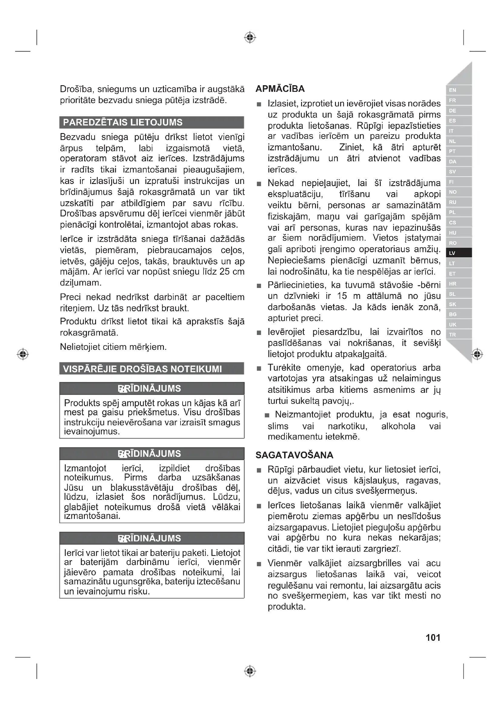 ■ Izlasiet, izprotiet un ievērojiet visas norādes uz produkta un šajā rokasgrāmatā pirms produkta lietošanas. Rūpīgi iepazīstieties ar vadības ierīcēm un pareizu produkta izmantošanu. Ziniet, kā ātri apturēt izstrādājumu un ātri atvienot vadības ierīces. ■ Nekad nepieļaujiet, lai šī izstrādājuma ekspluatāciju, tīrīšanu vai apkopi veiktu bērni, personas ar samazinātām fiziskajām, maņu vai garīgajām spējām vai arī personas, kuras nav iepazinušās ar šiem norādījumiem. Vietos įstatymai gali apriboti įrengimo operatoriaus amžių. Nepieciešams pienācīgi uzmanīt bērnus, lai nodrošinātu, ka tie nespēlējas ar ierīci. ■ Pārliecinieties, ka tuvumā stāvošie -bērni un dzīvnieki ir 15 m attālumā no jūsu darbošanās vietas. Ja kāds ienāk zonā, apturiet preci. ■ Ievērojiet piesardzību, lai izvairītos no paslīdēšanas vai nokrišanas, it sevišķi lietojot produktu atpakaļgaitā. ■ Turėkite omenyje, kad operatorius arba vartotojas yra atsakingas už nelaimingus atsitikimus arba kitiems asmenims ar jų turtui sukeltą pavojų,. ■ Neizmantojiet produktu, ja esat noguris, slims vai narkotiku, alkohola vai medikamentu ietekmē. SAGATAVOŠANA ■ Rūpīgi pārbaudiet vietu, kur lietosiet ierīci, un aizvāciet visus kājslauķus, ragavas, dēļus, vadus un citus svešķermeņus. ■ Ierīces lietošanas laikā vienmēr valkājiet piemērotu ziemas apģērbu un neslīdošus aizsargapavus. Lietojiet pieguļošu apģērbu vai apģērbu no kura nekas nekarājas; citādi, tie var tikt ierauti zargriezī. ■ Vienmēr valkājiet aizsargbrilles vai acu aizsargus lietošanas laikā vai, veicot regulēšanu vai remontu, lai aizsargātu acis no svešķermeņiem, kas var tikt mesti no produkta.102 | Latviski