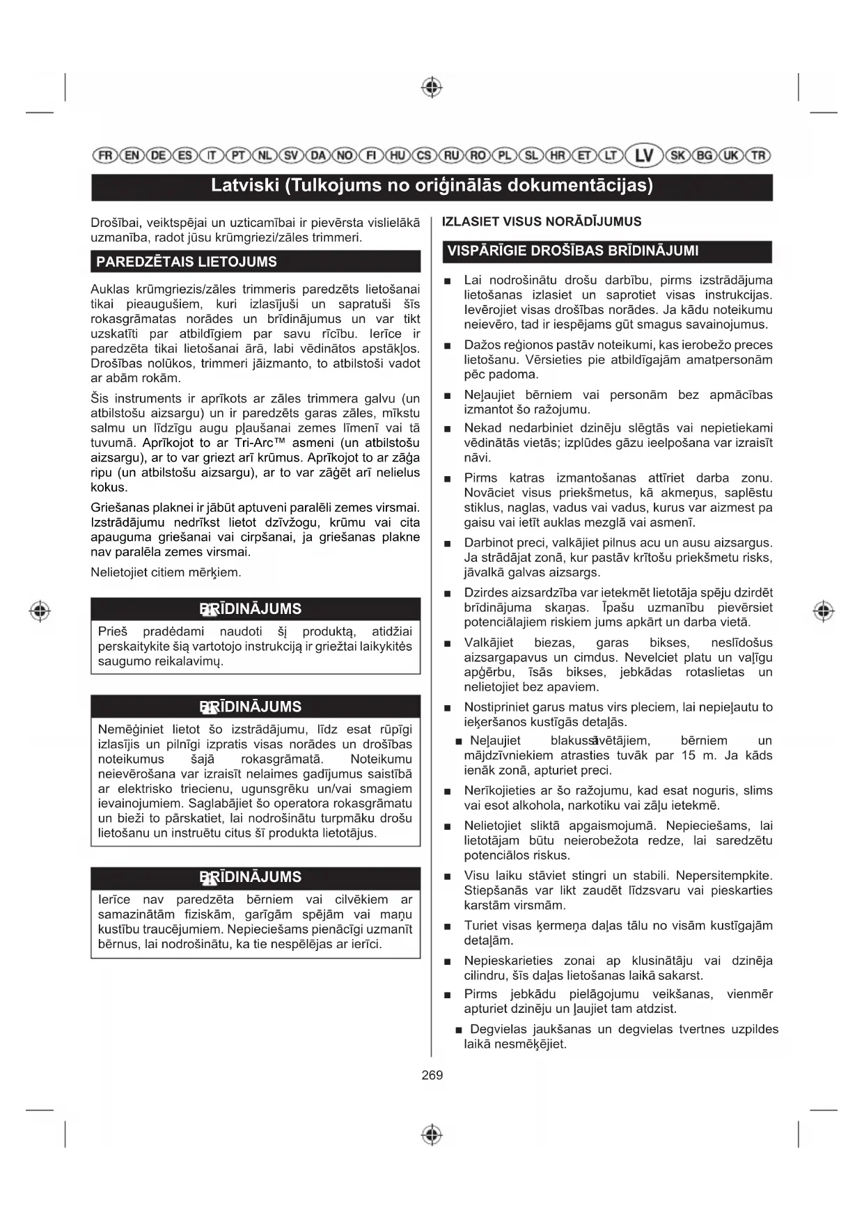 Auklas krūmgriezis/zāles trimmeris paredzēts lietošanai tikai pieaugušiem, kuri izlasījuši un sapratuši šīs rokasgrāmatas norādes un brīdinājumus un var tikt uzskatīti par atbildīgiem par savu rīcību. Ierīce ir paredzēta tikai lietošanai ārā, labi vēdinātos apstākļos. Drošības nolūkos, trimmeri jāizmanto, to atbilstoši vadot ar abām rokām. Šis instruments ir aprīkots ar zāles trimmera galvu (un atbilstošu aizsargu) un ir paredzēts garas zāles, mīkstu salmu un līdzīgu augu pļaušanai zemes līmenī vai tā tuvumā. Aprīkojot to ar Tri-Arc™ asmeni (un atbilstošu aizsargu), ar to var griezt arī krūmus. Aprīkojot to ar zāģa ripu (un atbilstošu aizsargu), ar to var zāģēt arī nelielus kokus. Griešanas plaknei ir jābūt aptuveni paralēli zemes virsmai. Izstrādājumu nedrīkst lietot dzīvžogu, krūmu vai cita apauguma griešanai vai cirpšanai, ja griešanas plakne nav paralēla zemes virsmai. Nelietojiet citiem mērķiem.