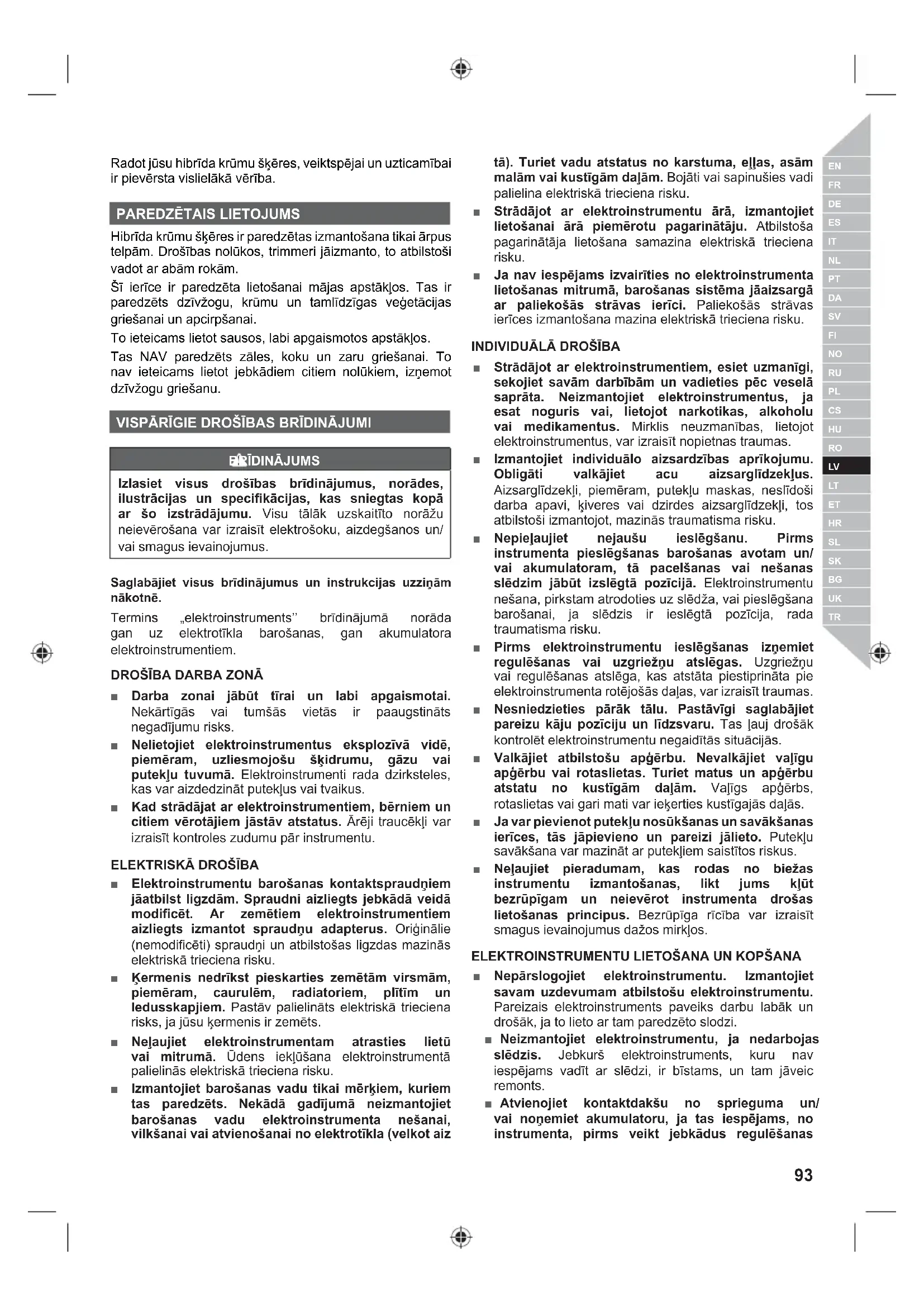 ■ Dažos reģionos pastāv noteikumi, kas ierobežo darbības, kurām produkts ir izmantojams. Vērsieties pie atbildīgajām amatpersonām pēc padoma. Izlasiet visus norādījumus ■ Pirms katras izmantošanas attīriet darba zonu. Aiznesiet visas lietas, piemēram, vadus, apgaismojumus, kabeļus vai saites, kas var lidot vai sapīties griešanas brīdī. ■ Pārbaudiet, vai žogā nav priekšmeti, piemēram, žoga stieples. ■ Ievērojiet papildu piesardzību, izmantojot produktu sētu, stabu, ēku vai citu nekustīgu objektu tuvumā. ■ Uzmanieties no krītošām lietām; raugieties, lai tuvāk stāvošie - bērni, un dzīvnieki atrodas vismaz 15 m no jūsu darbošanās vietas. ■ Neļaujiet bērniem vai person ām bez apmācības izmantot šo ražojumu. ■ Nelietojiet sliktā apgaismojumā. Lietotājam jābūt pilnai redzamībai pār darba zonu, lai spētu identificēt iespējamus draudus. ■ Pirms izmantot iekārtu, vienmēr pārliecinieties, vai ir uzstādīti visi rokturi un aizsargi. Nekad nemēģiniet lietot nepilnīgu instrumentu vai tādu, kam veiktas neatļautas izmaiņas. ■ Pirms katras lietošanas reizes pārliecinieties, ka visas kontroles un drošības sistēmas ir darba kārtībā. Neizmantojiet ierīci, ja izslēgšanas slēdzis neapstādina motoru. ■ Pirms katras lietošanas reizes pārbaudiet ierīci. Pārbaudiet, vai stiprinājumi nav vaļīgi. Pārbaudiet, vai visi aizsargi un rokturi ir pareizi un stingri piestiprin āti. Pirms lietošanas nomainiet visas bojātās detaļas. Pārbaudiet sūces akumulatora komplektā. ■ Nekādā veidā neveiciet instrumenta pārveidi. ■ Darbinot preci, valkājiet pilnus acu un ausu aizsargus. Ja strādājat zonā, kur pastāv krītošu priekšmetu risks, jāvalkā galvas aizsargs. ■ Velciet izturīgas garās bikses, zābakus un cimdus. Nevelciet platu un vaļīgu apģērbu, īsās bikses, jebkādas rotaslietas un nelietojiet bez apaviem. ■ Nostipriniet garus matus tā, lai tie ir virs plecu līmeņa, lai novērstu sapīšanos kustīgajās daļās. ■ Dzirdes aizsargu lietošana mazinās jūsu spēju dzirdēt br īdinājumus (bļāvienus vai skaņas signālus). Operatoram jāpievērš sevišķa uzmanība tam, kas notiek darba zonā. ■ Līdzīgas ierīces izmantošana tuvumā palielina gan risku sabojāt dzirdi, gan iespēju, ka otrs cilvēks ieies jūsu darba zonā. ■ Nerīkojieties ar šo ražojumu, kad esat noguris, slims vai esot alkohola, narkotiku vai zāļu ietekmē. ■ Visada tvirtai stovėkite ir išlaikykite pusiausvyrą. Nepersitempkite. Stiepšanās var radīt līdzsvara zudumu un var novest pie nopietnas traumas. ■ Turiet visas ķermeņa daļas tālu no visām kustīgajām detaļām. ■ Pirms ieslēdzat ierīci, pārliecinieties, vai zāģēšanas asmeņi ne ar ko nesaskarsies. ■ Izmantojot dzīvžogu apgriezējy, vienmēr ar abām rokām turiet to stingri aiz abiem rokturiem un pārliecinieties, ka darbošanās poza ir droša un stabila. Ražotājs neiesaka lietot iekārtu uz pakāpieniem vai trepēm. Ja griešana nepieciešama augstākā vietā, lietojiet pagarinošu papildrīku. ■ Asmeņi ir asi. Uzstādot asmeni, izmantojiet neslīdošus tam paredzētus aizsargcimdus. Neievietojiet roku vai pirkstus starp asmeņiem vai jebkurā citā vietā, kur tos var saspiest vai nogriezt. Nekad nepieskarieties asmenim vai neveiciet produktu apkopi, ja akumulatoru bloks nav noņemts, vai produkts nav atvienots no jebkāda barošanas avota. ■ Izslēdziet un noņemiet akumulatoru bloku vai atvienojiet no barošanas avota. Pārliecinieties, ka visas kustīgās daļas ir pilnīgi apstājušās: ● pirms atstāt izstrādājumu bez uzraudzības ● pirms tīrīšanas vai šķēršļu izciršanas ● pirms griešanas pielāgojuma darba stāvokļa regulēšanas ● pirms ierīces pārbaudīšanas, apkopes vai darbināšanas ■ Neizmantojiet dzīvžogu trimmeri biezu krūmāju apgriešanai. Tas var izraisīt asmeņu darbības palēnināšanos un iesprūšanu. Ja asmeņu kustības ātrums samazinās, palēniniet gaitu. ■ Nemēģiniet apgriezt stublājus vai zarus, kuru biezums pārsniedz 22 mm, jo tie acīmredzami ir pārāk lieli griezējasmenim. Izmantojiet neelektrisko rokas zāģi vai dārznieka zāģīti, lai apgrieztu lielus stublājus. ■ Nedarbiniet ierī ci, ja griezējs ir bojāts vai pārmērīgi nodilis.