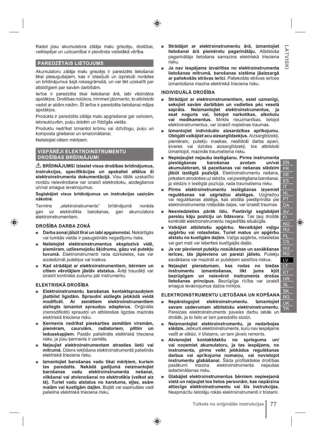 Traducerea instrucţiunilor originaleRadot jūsu akumulatora zālāja malu griezēju, drošībai, veiktspējai un uzticamībai ir pievērsta vislielākā vērība.