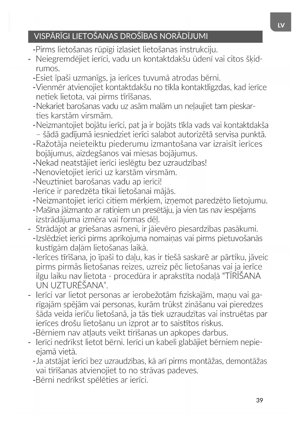 VISPĀRĪGI LIETOŠANAS DROŠĪBAS NORĀDĪJUMI - Pirms lietošanas rūpīgi izlasiet lietošanas instrukciju. - Neiegremdējiet ierīci, vadu un kontaktdakšu ūdenī vai citos šķid