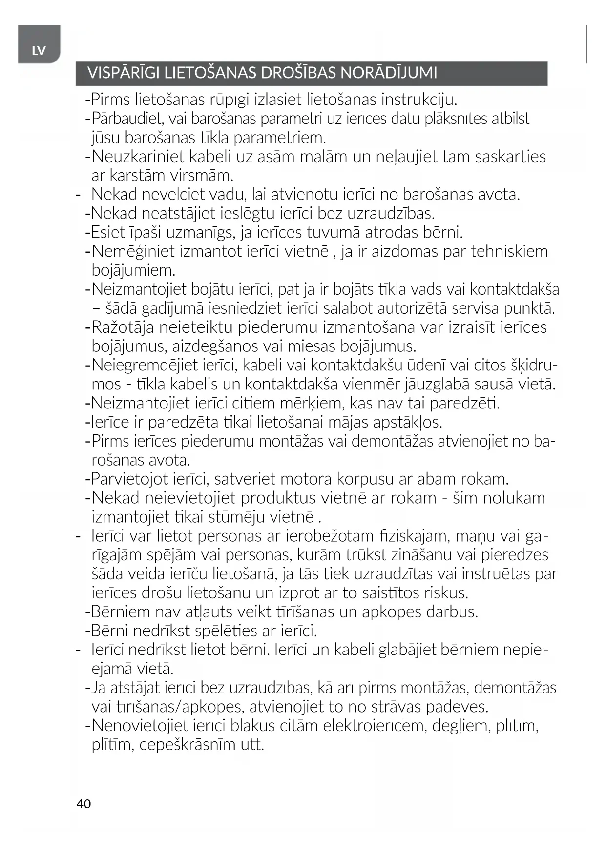 Neiegremdējiet ierīci, kabeli vai kontaktdakšu ūdenī vai citos šķidru- mos - kla kabelis un kontaktdakša vienmēr jāuzglabā sausā vietā. - Neizmantojiet ierīci ciem mērķiem, kas nav tai paredzē. - Ierīce ir paredzēta kai lietošanai mājas apstākļos.