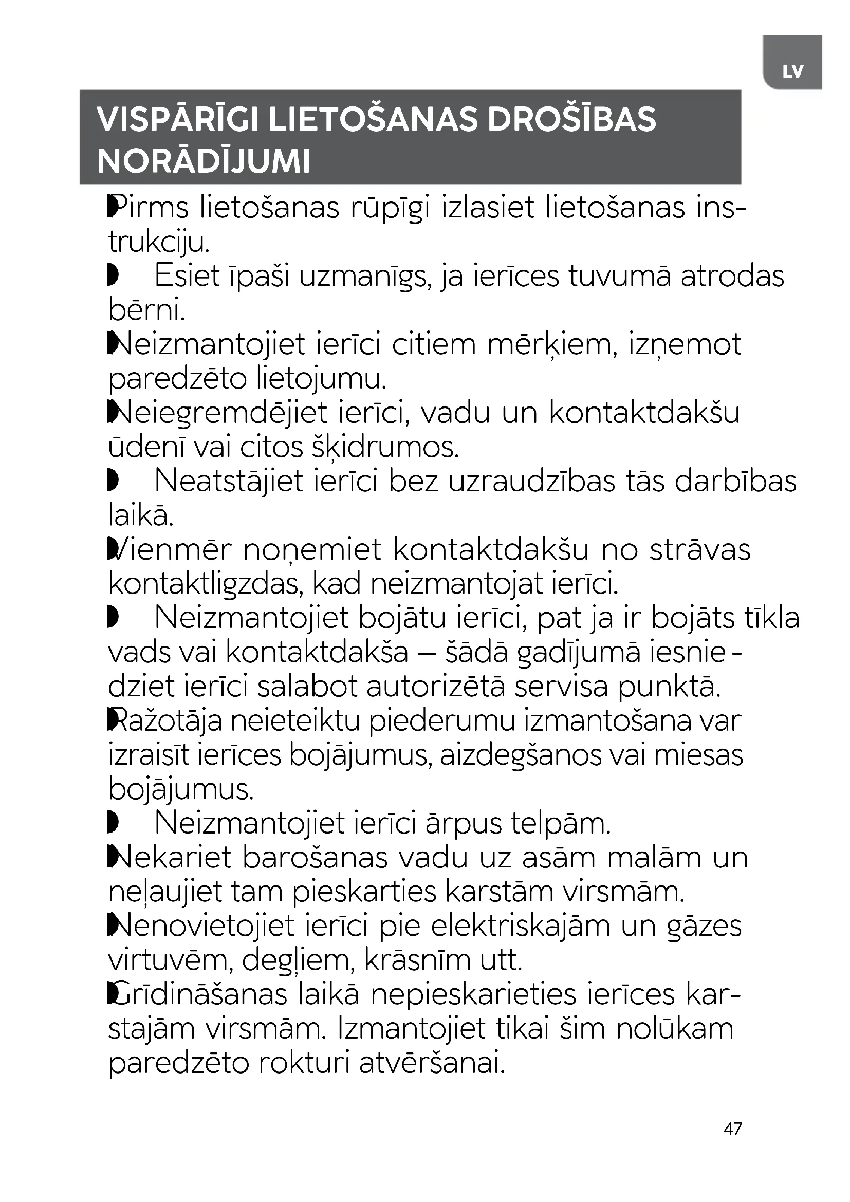 Šo ierīci drīkst lietot bērni, kas ir vismaz 8 gadus veci, kā arī perso nas ar ierobežotām fiziskajām, garīgajām spējām un personas bez pieredzes vai zināšanām par iekārtu, ja tiks nodrošināta uzraudzība vai viņi tiks instruēti par ierīces drošu lietošanu, lai ar to saistīts risks būtu saprotams. Tīrīšanu un apkopi nedrīkst veikt bērni, ja vien viņi nav vismaz 8 gadus veci un netiek uzraudzīti. Bērniem nav atļauts veikt tīrīšanu/apkopi bez uzraudzības.