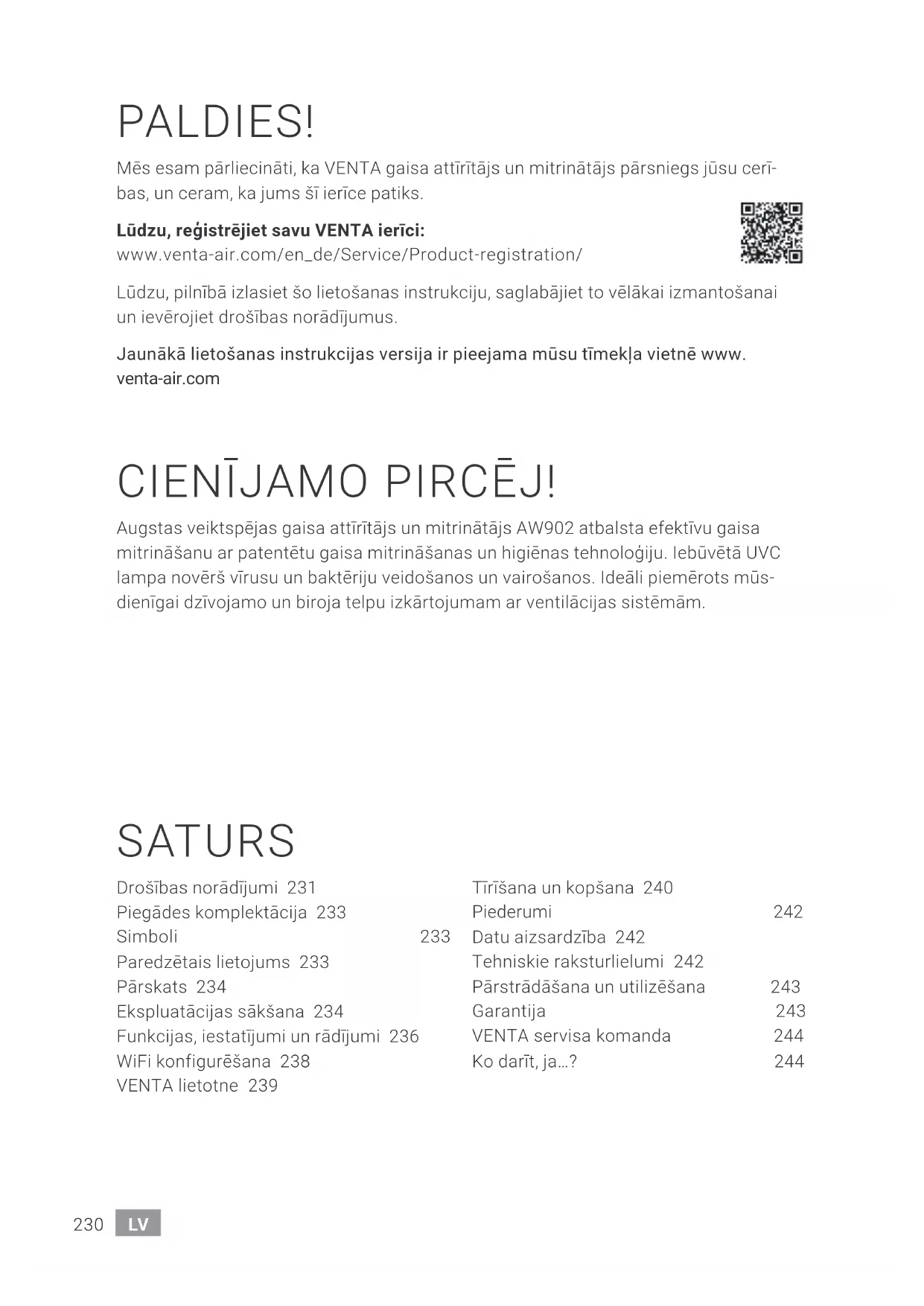 Dacă este cazul actualizați sistemul de operare al smartphone-ului resp. table- tei dvs.230 DE230 LV Drošības norādījumi 231 Piegādes komplektācija 233 Simboli 233 Paredzētais lietojums 233 Pārskats 234 Ekspluatācijas sākšana 234 Funkcijas, iestatījumi un rādījumi 236 WiFi konfigurēšana 238 VENTA lietotne 239 Tīrīšana un kopšana 240 Piederumi 242 Datu aizsardzība 242 Tehniskie raksturlielumi 242 Pārstrādāšana un utilizēšana 243 Garantija 243 VENTA servisa komanda 244 Ko darīt, ja…? 244 PALDIES! Mēs esam pārliecināti, ka VENTA gaisa attīrītājs un mitrinātājs pārsniegs jūsu cerī- bas, un ceram, ka jums šī ierīce patiks. Lūdzu, reģistrējiet savu VENTA ierīci: www.venta-air.com/en_de/Service/Product-registration/ Lūdzu, pilnībā izlasiet šo lietošanas instrukciju, saglabājiet to vēlākai izmantošanai un ievērojiet drošības norādījumus. Jaunākā lietošanas instrukcijas versija ir pieejama mūsu tīmekļa vietnē www. venta-air.com CIENĪJAMO PIRCĒJ! Augstas veiktspējas gaisa attīrītājs un mitrinātājs AW902 atbalsta efektīvu gaisa mitrināšanu ar patentētu gaisa mitrināšanas un higiēnas tehnoloģiju. Iebūvētā UVC lampa novērš vīrusu un baktēriju veidošanos un vairošanos. Ideāli piemērots mūs- dienīgai dzīvojamo un biroja telpu izkārtojumam ar ventilācijas sistēmām.
