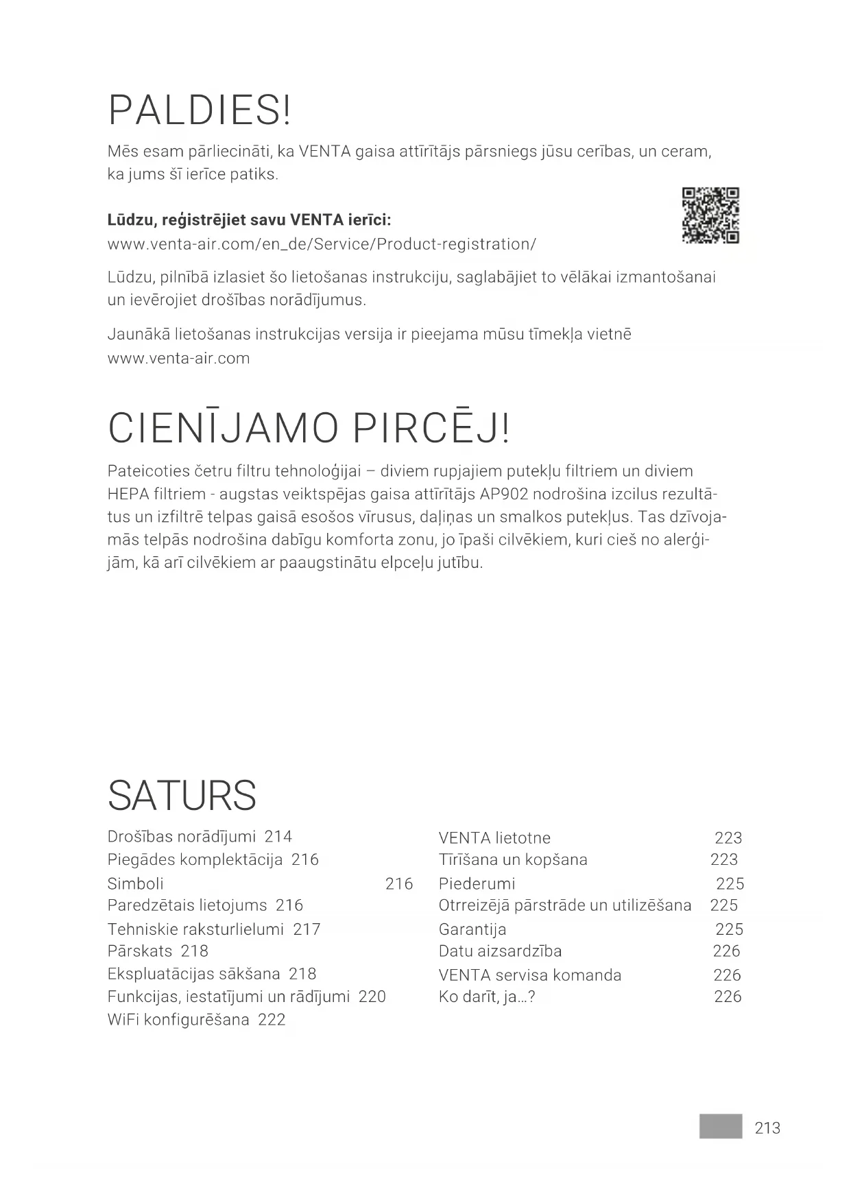 Dacă este cazul actualizați sistemul de operare al smartphone-ului resp. table- tei dvs.213LV PALDIES! Mēs esam pārliecināti, ka VENTA gaisa attīrītājs pārsniegs jūsu cerības, un ceram, ka jums šī ierīce patiks. Lūdzu, reģistrējiet savu VENTA ierīci: www.venta-air.com/en_de/Service/Product-registration/ Lūdzu, pilnībā izlasiet šo lietošanas instrukciju, saglabājiet to vēlākai izmantošanai un ievērojiet drošības norādījumus. Jaunākā lietošanas instrukcijas versija ir pieejama mūsu tīmekļa vietnē www.venta-air.com CIENĪJAMO PIRCĒJ! Pateicoties četru filtru tehnoloģijai – diviem rupjajiem putekļu filtriem un diviem HEPA filtriem - augstas veiktspējas gaisa attīrītājs AP902 nodrošina izcilus rezultā- tus un izfiltrē telpas gaisā esošos vīrusus, daļiņas un smalkos putekļus. Tas dzīvoja- mās telpās nodrošina dabīgu komforta zonu, jo īpaši cilvēkiem, kuri cieš no alerģi- jām, kā arī cilvēkiem ar paaugstinātu elpceļu jutību. SATURS Drošības norādījumi 214 Piegādes komplektācija 216 Simboli 216 Paredzētais lietojums 216 Tehniskie raksturlielumi 217 Pārskats 218 Ekspluatācijas sākšana 218 Funkcijas, iestatījumi un rādījumi 220 WiFi konfigurēšana 222 VENTA lietotne 223 Tīrīšana un kopšana 223 Piederumi 225 Otrreizējā pārstrāde un utilizēšana 225 Garantija 225 Datu aizsardzība 226 VENTA servisa komanda 226 Ko darīt, ja…? 226214 LV