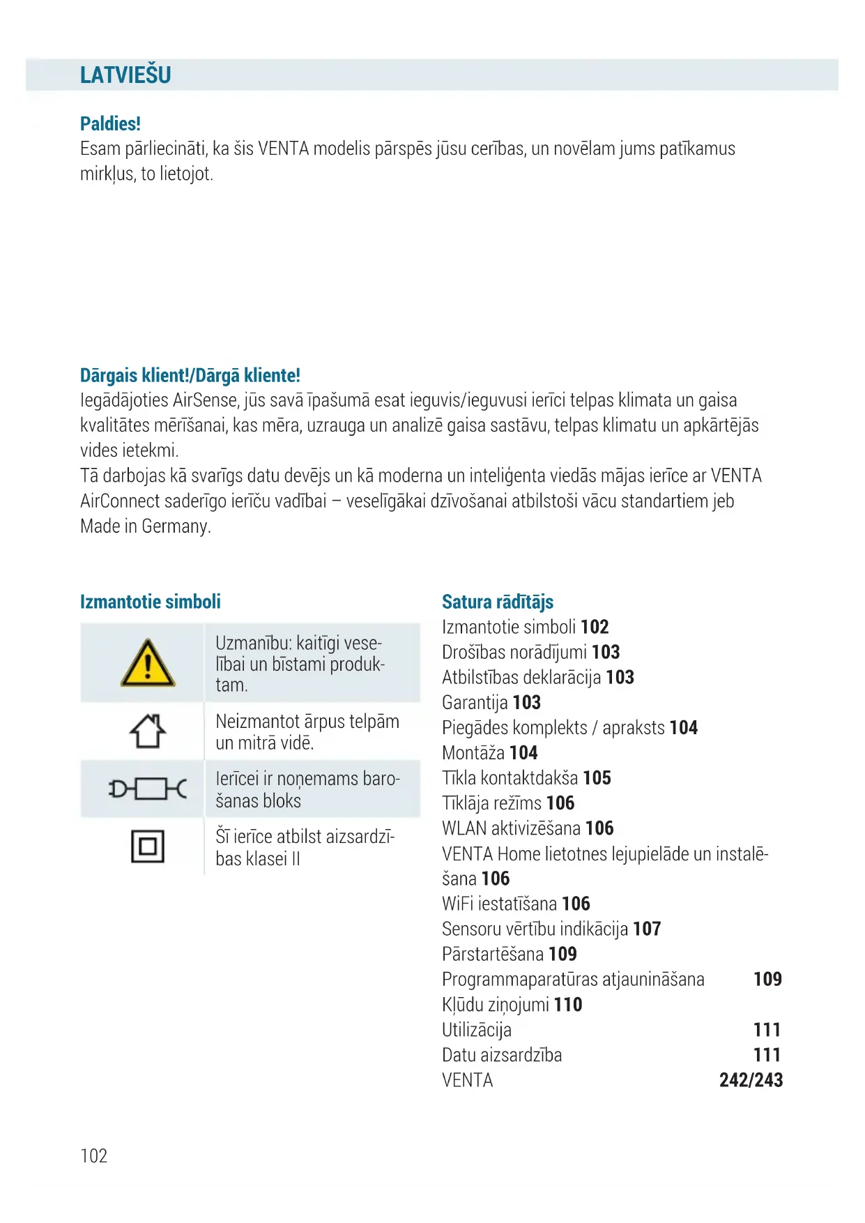 Izmantotie simboli Paldies! Esam pārliecināti, ka šis VENTA modelis pārspēs jūsu cerības, un novēlam jums patīkamus mirkļus, to lietojot. Dārgais klient!/Dārgā kliente! Iegādājoties AirSense, jūs savā īpašumā esat ieguvis/ieguvusi ierīci telpas klimata un gaisa kvalitātes mērīšanai, kas mēra, uzrauga un analizē gaisa sastāvu, telpas klimatu un apkārtējās vides ietekmi. Tā darbojas kā svarīgs datu devējs un kā moderna un inteliģenta viedās mājas ierīce ar VENTA AirConnect saderīgo ierīču vadībai– veselīgākai dzīvošanai atbilstoši vācu standartiem jeb Made in Germany. Uzmanību: kaitīgi vese- lībai un bīstami produk- tam. Neizmantot ārpus telpām un mitrā vidē. Ierīcei ir noņemams baro- šanas bloks Šī ierīce atbilst aizsardzī- bas klasei II Satura rādītājs Izmantotie simboli 102 Drošības norādījumi 103 Atbilstības deklarācija 103 Garantija 103 Piegādes komplekts/ apraksts 104 Montāža 104 Tīkla kontaktdakša 105 Tīklāja režīms 106 WLAN aktivizēšana 106 VENTA Home lietotnes lejupielāde un instalē- šana 106 WiFi iestatīšana 106 Sensoru vērtību indikācija 107 Pārstartēšana 109 Programmaparatūras atjaunināšana 109 Kļūdu ziņojumi 110 Utilizācija 111 Datu aizsardzība 111