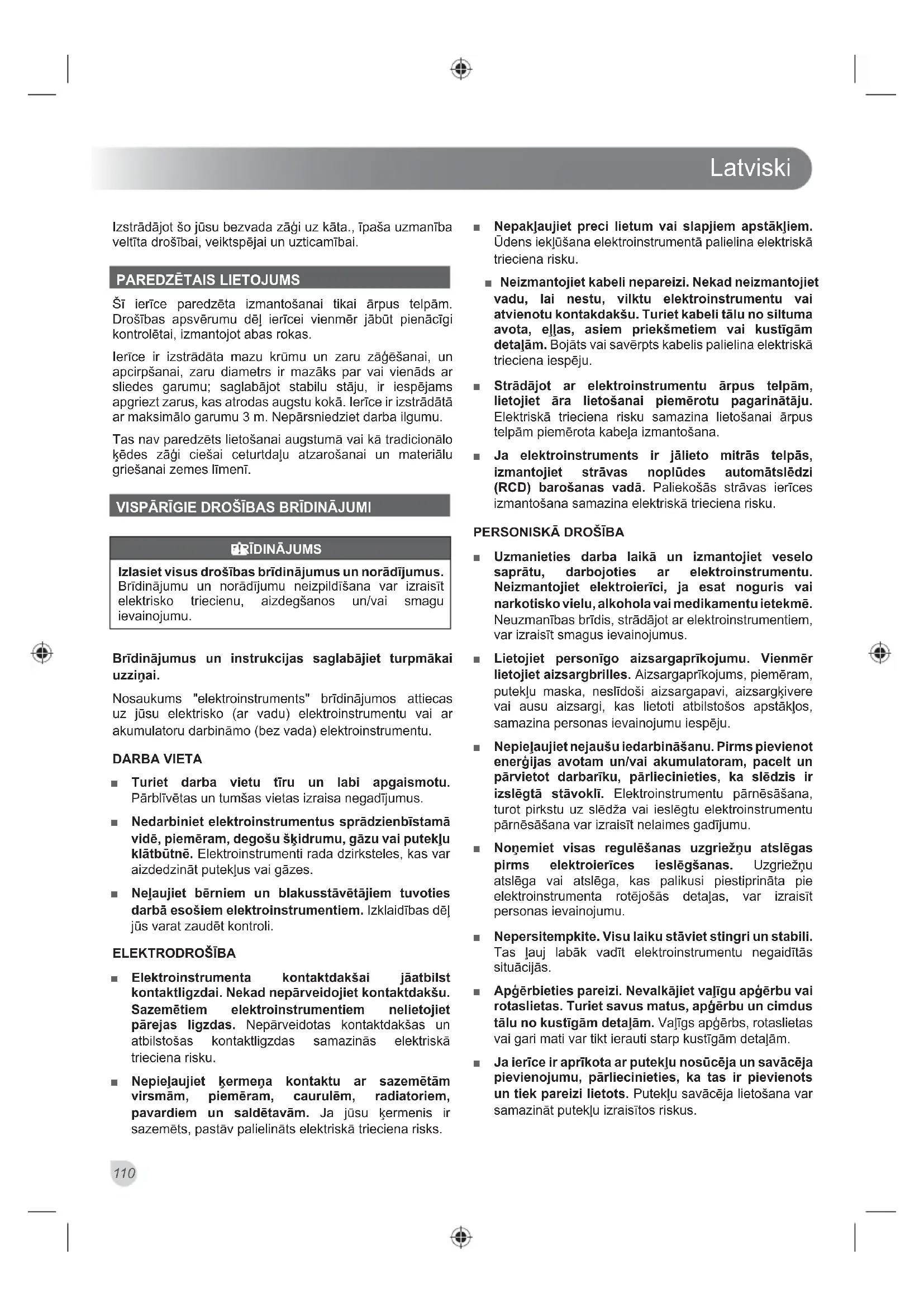 Izlasiet visus drošības brīdinājumus un norādījumus. Brīdinājumu un norādījumu neizpildīšana var izraisīt elektrisko triecienu, aizdegšanos un/vai smagu ievainojumu. Brīdinājumus un instrukcijas saglabājiet turpmākai uzziņai. Nosaukums "elektroinstruments" brīdinājumos attiecas uz jūsu elektrisko (ar vadu) elektroinstrumentu vai ar akumulatoru darbināmo (bez vada) elektroinstrumentu. DARBA VIETA ■ Turiet darba vietu tīru un labi apgaismotu. Pārblīvētas un tumšas vietas izraisa negadījumus. ■ Nedarbiniet elektroinstrumentus sprādzienbīstamā vidē, piemēram, degošu šķidrumu, gāzu vai putekļu klātbūtnē. Elektroinstrumenti rada dzirksteles, kas var aizdedzināt putekļus vai gāzes. ■ Neļaujiet bērniem un blakusstāvētājiem tuvoties darbā esošiem elektroinstrumentiem. Izklaidības dēļ jūs varat zaudēt kontroli. ELEKTRODROŠĪBA ■ Elektroinstrumenta kontaktdakšai jāatbilst kontaktligzdai. Nekad nepārveidojiet kontaktdakšu. Sazemētiem elektroinstrumentiem nelietojiet pārejas ligzdas. Nepārveidotas kontaktdakšas un atbilstošas kontaktligzdas samazinās elektriskā trieciena risku. ■ Nepieļaujiet ķermeņa kontaktu ar sazemētām virsmām, piemēram, caurulēm, radiatoriem, pavardiem un saldētavām. Ja jūsu ķermenis ir sazemēts, pastāv palielināts elektriskā trieciena risks. ■ Nepakļaujiet preci lietum vai slapjiem apstākļiem. Ūdens iekļūšana elektroinstrumentā palielina elektriskā trieciena risku. ■ Neizmantojiet kabeli nepareizi. Nekad neizmantojiet vadu, lai nestu, vilktu elektroinstrumentu vai atvienotu kontakdakšu. Turiet kabeli tālu no siltuma avota, eļļas, asiem priekšmetiem vai kustīgām detaļām. Bojāts vai savērpts kabelis palielina elektriskā trieciena iespēju. ■ Strādājot ar elektroinstrumentu ārpus telpām, lietojiet āra lietošanai piemērotu pagarinātāju. Elektriskā trieciena risku samazina lietošanai ārpus telpām piemērota kabeļa izmantošana. ■ Ja elektroinstruments ir jālieto mitrās telpās, izmantojiet strāvas noplūdes automātslēdzi (RCD) barošanas vadā. Paliekošās strāvas ierīces izmantošana samazina elektriskā trieciena risku.