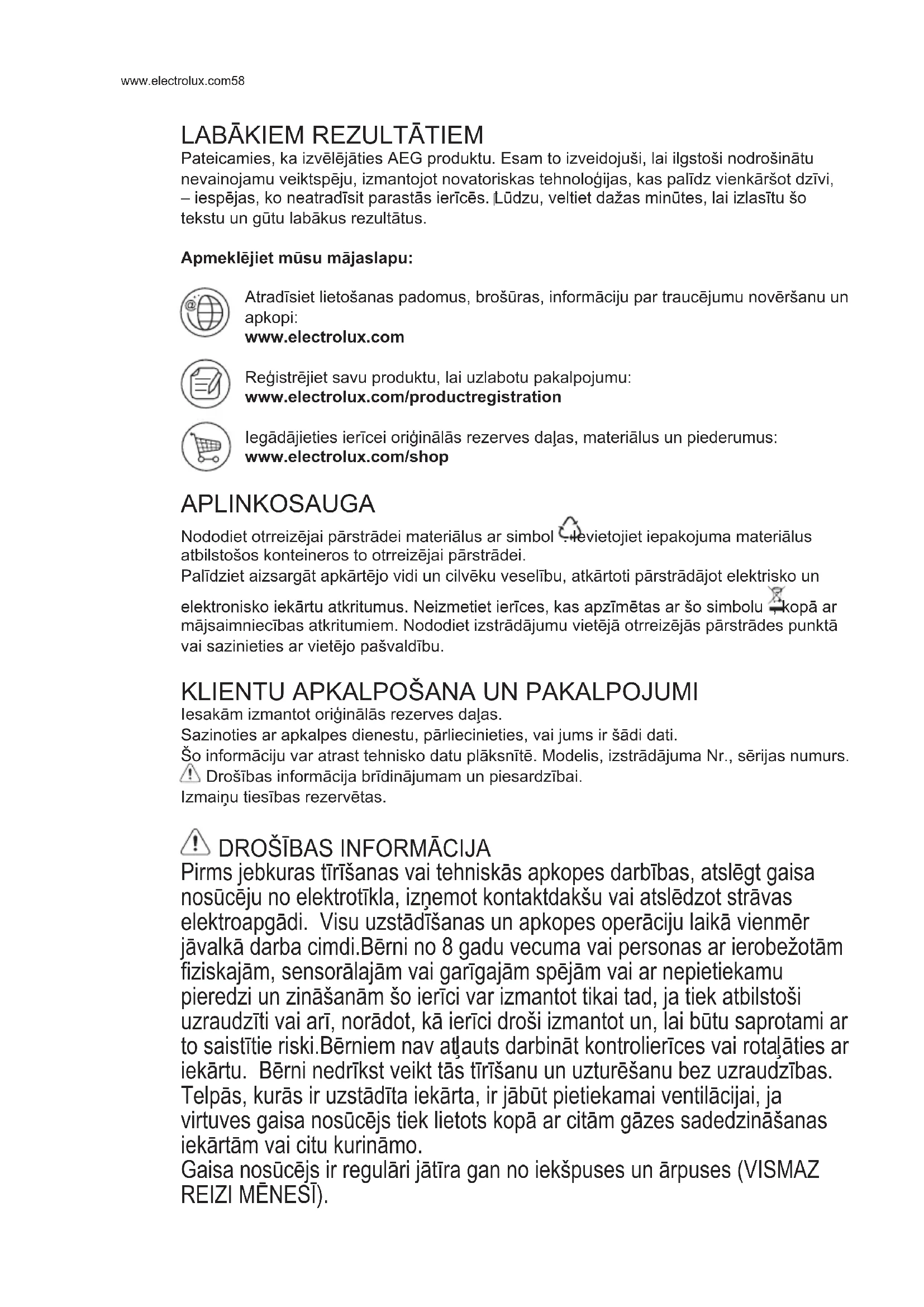 Pateicamies, ka izvēlējāties AEG produktu. Esam to izveidojuši, lai ilgstoši nodrošinātu nevainojamu veiktspēju, izmantojot novatoriskas tehnoloģijas, kas palīdz vienkāršot dzīvi, – iespējas, ko neatradīsit parastās ierīcēs. Lūdzu, veltiet dažas minūtes, lai izlasītu šo tekstu un gūtu labākus rezultātus. Apmeklējiet mūsu mājaslapu: Atradīsiet lietošanas padomus, brošūras, informāciju par traucējumu novēršanu un apkopi: www.electrolux.com Reģistrējiet savu produktu, lai uzlabotu pakalpojumu: www.electrolux.com/productregistration Iegādājieties ierīcei oriģinālās rezerves daļas, materiālus un piederumus: www.electrolux.com/shop APLINKOSAUGA Nododiet otrreizējai pārstrādei materiālus ar simbol . Ievietojiet iepakojuma materiālus atbilstošos konteineros to otrreizējai pārstrādei. Palīdziet aizsargāt apkārtējo vidi un cilvēku veselību, atkārtoti pārstrādājot elektrisko un elektronisko iekārtu atkritumus. Neizmetiet ierīces, kas apzīmētas ar šo simbolu , kopā ar mājsaimniecības atkritumiem. Nododiet izstrādājumu vietējā otrreizējās pārstrādes punktā vai sazinieties ar vietējo pašvaldību.