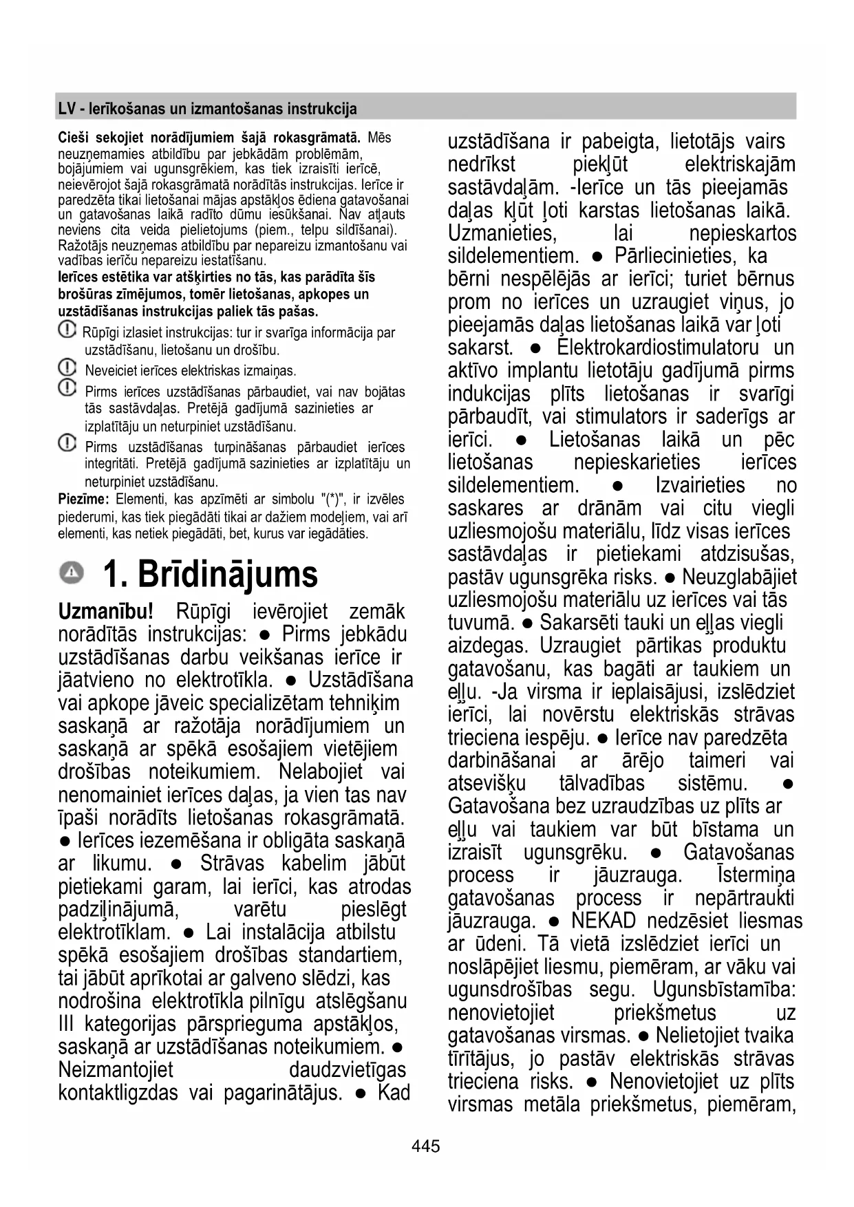 Uzmanību! Rūpīgi ievērojiet zemāk norādītās instrukcijas: ● Pirms jebkādu uzstādīšanas darbu veikšanas ierīce ir jāatvieno no elektrotīkla. ● Uzstādīšana vai apkope jāveic specializētam tehniķim saskaņā ar ražotāja norādījumiem un saskaņā ar spēkā esošajiem vietējiem drošības noteikumiem. Nelabojiet vai nenomainiet ierīces daļas, ja vien tas nav īpaši norādīts lietošanas rokasgrāmatā. ● Ierīces iezemēšana ir obligāta saskaņā ar likumu. ● Strāvas kabelim jābūt pietiekami garam, lai ierīci, kas atrodas padziļinājumā, varētu pieslēgt elektrotīklam. ● Lai instalācija atbilstu spēkā esošajiem drošības standartiem, tai jābūt aprīkotai ar galveno slēdzi, kas nodrošina elektrotīkla pilnīgu atslēgšanu III kategorijas pārsprieguma apstākļos, saskaņā ar uzstādīšanas noteikumiem. ● Neizmantojiet daudzvietīgas kontaktligzdas vai pagarinātājus. ● Kad uzstādīšana ir pabeigta, lietotājs vairs nedrīkst piekļūt elektriskajām sastāvdaļām. -Ierīce un tās pieejamās daļas kļūt ļoti karstas lietošanas laikā. Uzmanieties, lai nepieskartos sildelementiem. ● Pārliecinieties, ka bērni nespēlējās ar ierīci; turiet bērnus prom no ierīces un uzraugiet viņus, jo pieejamās daļas lietošanas laikā var ļoti sakarst. ● Elektrokardiostimulatoru un aktīvo implantu lietotāju gadījumā pirms indukcijas plīts lietošanas ir svarīgi pārbaudīt, vai stimulators ir saderīgs ar ierīci. ● Lietošanas laikā un pēc lietošanas nepieskarieties ierīces sildelementiem. ● Izvairieties no saskares ar drānām vai citu viegli uzliesmojošu materiālu, līdz visas ierīces sastāvdaļas ir pietiekami atdzisušas, pastāv ugunsgrēka risks. ● Neuzglabājiet uzliesmojošu materiālu uz ierīces vai tās tuvumā. ● Sakarsēti tauki un eļļas viegli aizdegas. Uzraugiet pārtikas produktu gatavošanu, kas bagāti ar taukiem un eļļu. -Ja virsma ir ieplaisājusi, izslēdziet ierīci, lai novērstu elektriskās strāvas trieciena iespēju. ● Ierīce nav paredzēta darbināšanai ar ārējo taimeri vai atsevišķu tālvadības sistēmu. ● Gatavošana bez uzraudzības uz plīts ar eļļu vai taukiem var būt bīstama un izraisīt ugunsgrēku. ● Gatavošanas process ir jāuzrauga. Īstermiņa gatavošanas process ir nepārtraukti jāuzrauga. ● NEKAD nedzēsiet liesmas ar ūdeni. Tā vietā izslēdziet ierīci un noslāpējiet liesmu, piemēram, ar vāku vai ugunsdrošības segu. Ugunsbīstamība: nenovietojiet priekšmetus uz gatavošanas virsmas. ● Nelietojiet tvaika tīrītājus, jo pastāv elektriskās strāvas trieciena risks. ● Nenovietojiet uz plīts virsmas metāla priekšmetus, piemēram,446 nažus, dakšiņas, karotes un vākus, jo tie var pārkarst. ● Pirms ierīces pievienošanas elektrotīklam: pārbaudiet datu plāksnīti (atrodas ierīces apakšā), lai pārliecinātos, ka spriegums un jauda atbilst elektrotīkla spriegumam un savienojuma kontaktligzdai. Ja rodas šaubas, sazinieties ar kvalificētu elektriķi. Svarīgi: ● Pēc lietošanas izslēdziet plīti, izmantojot tās vadības ierīci, un nepaļaujieties uz katla detektoru. ● Izvairieties no šķidruma izlīšanas; tāpēc, vārot vai sildot šķidrumu, samaziniet siltuma padevi. ● Neatstājiet sildelementus ieslēgtus ar tukšiem katliem un pannām vai bez katliem. ● Kad gatavošana ir pabeigta, izslēdziet attiecīgo gatavošanas zonu. ● Nekādā gadījumā nelietojiet alumīnija foliju ēdiena gatavošanai un nekad negatavojiet produktus, kas iesaiņoti alumīnija folijā. Alumīnijs var izkust un neatgriezeniski sabojāt ierīci. ● Nekad nekarsējiet skārda bundžu vai burku, kas satur pārtikas produktus, iepriekš to neatverot: tā var uzsprāgt! Šis brīdinājums attiecas uz visu citu veidu plīts virsmām. ● Lielas jaudas izmantošana, piemēram, Booster (palielināšana) funkcija, nav piemērota dažu šķidrumu, piemēram, cepšanas eļļas sildīšanai. Pārmērīgs karstums var būt bīstams. Šādos gadījumos mēs iesakām izmantot zemāku jaudu. ● Katli jānovieto tieši uz plīts virsmas un tiem jābūt centrētiem. Starp katlu un plīti nekādā gadījumā neievietojiet citus priekšmetus. ● Situācijā ar augstu temperatūru ierīce automātiski samazina gatavošanas zonu jaudas līmeni. ● Pirms tīrīšanas vai apkopes darbībām atvienojiet ierīci no strāvas avota, izņemot kontaktdakšu vai izslēdzot galveno slēdzi telpā. ● Visām uzstādīšanas un apkopes darbībām izmantojiet darba cimdus. ● Ierīci var lietot bērni, kas ir vecāki par 8 gadiem, un cilvēki ar samazinātām fiziskām, maņu vai garīgām spējām, vai bez pieredzes un nepieciešamajām zināšanām, ja vien tas tiek darīts citu uzraudzībā vai pēc tam, kad tie ir saņēmuši norādījumus par drošu ierīces lietošanu un sapratuši ar ierīci saistītos riskus. ● Bērni ir jāuzrauga, lai viņi nespēlētos ar ierīci. ● Tīrīšanu un apkopi bērni nedrīkst veikt bez uzraudzības. ● Telpā jābūt pietiekamai ventilācijai, ja ierīci lieto vienlaikus ar citām gāzes vai citām degšanas ierīcēm. ● Ierīce ir bieži jātīra gan no iekšpuses, gan no ārpuses (VISMAZ VIENU REIZI MĒNESĪ), katrā ziņā ievērojot apkopes instrukcijās skaidri norādīto. ● Ierīces tīrīšanas, filtru nomaiņas un filtru tīrīšanas noteikumu neievērošana rada ugunsbīstamību. ● Flambēšanas gatavošana ir stingri aizliegta. ● Atklātas liesmas izmantošana filtriem ir kaitīga un var izraisīt ugunsgrēku, tāpēc no tā jebkurā gadījumā ir jāizvairās. ● Cepšana jāveic kontrolētā veidā, lai nepieļautu pārkarsētas eļļas aizdegšanos. ● UZMANĪBU: kad plīts darbojas, ierīces pieejamās daļas var sakarst. ● Uzmanību! Nepievienojiet ierīci elektrotīklam, līdz uzstādīšana nav pabeigta. ● Attiecībā uz tehniskajiem un drošības pasākumiem, kas 