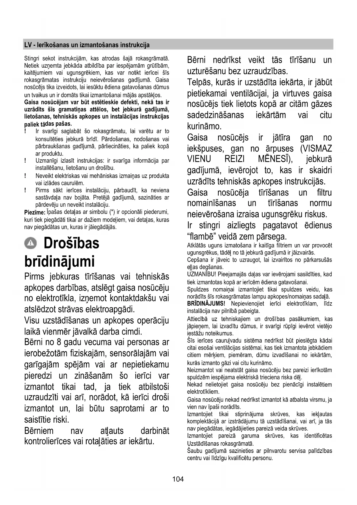 spragtelėjimas). Jei apšvietimas neveiks, prieš kviesdami techninę pagalbą, patikrinkite, ar lempas įstatėte teisinga pozicija. - Modelis su LED lempomis Gartraukyje įrengta diodų technologijos apšvietimo sistema. Diodai užtikrina optimalų apšvietimą, be to, jų naudojimo laikas iki 10 kartų ilgesnis nei tradicinių lempučių, taigi sutaupoma 90 % elektros energijos. Jei norite juos pakeisti, kreipkitės į techninio aptarnavimo tarnybą.104 LV - Ierīkošanas un izmantošanas instrukcija Stingri sekot instrukcijām, kas atrodas šajā rokasgrāmatā. Netiek uzņemta jebkāda atbildība par iespējamām grūtībām, kaitējumiem vai ugunsgrēkiem, kas var notikt ierīcei šīs rokasgrāmatas instrukciju neievērošanas gadījumā. Gaisa nosūcējs tika izveidots, lai iesūktu ēdiena gatavošanas dūmus un tvaikus un ir domāts tikai izmantošanai mājās apstākļos. Gaisa nosūcējam var būt estētieskie defekti, nekā tas ir uzrādīts šīs gramatiņas attēlos, bet jebkurā gadījumā, lietošanas, tehniskās apkopes un instalācijas instrukcijas paliek tā das pašas. ! Ir svarīgi saglabāt šo rokasgrāmatu, lai varētu ar to konsultēties jebkurā brīdī. Pārdošanas, nodošanas vai pārbraukšanas gadījumā, pārliecināties, ka paliek kopā ar produktu. ! Uzmanīgi izlasīt instrukcijas: ir svarīga informācija par installēšanu, lietošanu un drošību. ! Neveikt elektriskas vai mehāniskas izmaiņas uz produkta vai izlādes caurulēm. ! Pirms sākt ierīces instalāciju, pārbaudīt, ka neviena sastāvdaļa nav bojāta. Pretējā gadījumā, sazināties ar pārdevēju un neveikt instalāciju. Piezīme: Īpašas detaļas ar simbolu (*) ir opcionāli piederumi, kuri tiek piegādāti tikai ar dažiem modeļiem, vai detaļas, kuras nav piegādātas un, kuras ir jāiegādājās. Drošības brīdinājumi Pirms jebkuras tīrīšanas vai tehniskās apkopes darbības, atslēgt gaisa nosūcēju no elektrotīkla, izņemot kontaktdakšu vai atslēdzot strāvas elektroapgādi. Visu uzstādīšanas un apkopes operāciju laikā vienmēr jāvalkā darba cimdi. Bērni no 8 gadu vecuma vai personas ar ierobežotām fiziskajām, sensorālajām vai garīgajām spējām vai ar nepietiekamu pieredzi un zināšanām šo ierīci var izmantot tikai tad, ja tiek atbilstoši uzraudzīti vai arī, norādot, kā ierīci droši izmantot un, lai būtu saprotami ar to saistītie riski. Bērniem nav atļauts darbināt kontrolierīces vai rotaļāties ar iekārtu. Bērni nedrīkst veikt tās tīrīšanu un uzturēšanu bez uzraudzības. Telpās, kurās ir uzstādīta iekārta, ir jābūt pietiekamai ventilācijai, ja virtuves gaisa nosūcējs tiek lietots kopā ar citām gāzes sadedzināšanas iekārtām vai citu kurināmo. Gaisa nosūcējs ir jātīra gan no iekšpuses, gan no ārpuses (VISMAZ VIENU REIZI MĒNESĪ), jebkurā gadījumā, ievērojot to, kas ir skaidri uzrādīts tehniskās apkopes instrukcijās. Gaisa nosūcēja tīrīšanas un filtru nomainīšanas un tīrīšanas normu neievērošana izraisa ugunsgrēku riskus. Ir stingri aizliegts pagatavot ēdienus “flambē” veidā zem pārsega. Atklātās uguns izmatošana ir kaitīga filtriem un var provocēt ugunsgrēkus, tādēļ no tā jebkurā gadījumā ir jāizvairās. Cepšana ir jāveic to uzraugot, lai izvairītos no pārkarsušās eļļas degšanas. UZMANĪBU! Pieejamajās daļas var ievērojami sasildīties, kad tiek izmantotas kopā ar ierīcēm ēdiena gatavošanai. Spuldzes nomaiņai izmantojiet tikai spuldzes veidu, kas norādīts šīs rokasgrāmatas lampu apkopes/nomaiņas sadaļā. BRĪDINĀJUMS! Nepievienojiet ierīci elektrotīklam, līdz instalācija nav pilnībā pabeigta. Attiecībā uz tehniskajiem un drošī bas pasākumiem, kas jāpieņem, lai izvadītu dūmus, ir svarīgi rūpīgi ievērot vietējo iestāžu noteikumus. Šīs ierīces cauruļvadu sistēma nedrīkst būt pieslēgta kādai citai esošai ventilācijas sistēmai, kas tiek izmantota jebkādiem citiem mērķiem, piemēram, dūmu izvadīšanai no iekārtām, kurās izmanto gāzi vai citu kurināmo. Neizmantot vai neatstāt gaisa nosūcēju bez pareizi ierīkotām spuldzēm iespējama elektriskā trieciena riska dēļ. Nekad nelietojiet gaisa nosūcēju bez pienācīgi instalē tiem elektrotīkliem. Gaisa nosūcēju nekad nedrīkst izmantot kā atbalsta virsmu, ja vien nav īpaši norādīts. Izmantojiet tikai stiprinājuma skrūves, kas iekļautas komplektācijā ar izstrādājumu tā uzstādīšanai, vai arī, ja tās nav piegādātas, iegādājieties pareizā veida skrūves. Izmantojiet pareizā garuma skrūves, kas identificētas Uzstādīšanas rokasgrāmatā. Šaubu gadījumā sazinieties ar pilnvarotu servisa palīdzības centru vai līdzīgu kvalificētu personu.105 BRĪDINĀJUMS! Nespēja uzstādīt skrūves vai stiprinājuma ierīci saskaņā ar šiem norādījumiem, var izraisīt elektriskā apdraudējuma risku. Šī ierīce atbilst Eiropas Direktīvai 2012/19/EC, Waste Electrical And Electronic Equipment (WEEE). Pārliecinoties, vai šis produkts tiek izmests ārā pareizā veidā, izmantotājs veicina izvairīšanos no negatīvajām sekām apkārtējai videi un veselībai. Simbols uz produkta vai uz pievienotās dokumetācijas nozīmē, ka ar šo produktu nav jārīkojas, kā mājas atkritumam, bet tas ir jānogādā uz tam domātu savākšanas punktu, kur atkārtoti izlieto elektriskās un elektroniskās ierīces. Tas ir jāizmet, respektējot vietējos likumus, kas attiecas uz atkritumu aizvākšanu. Pēc papildus informācijas par produkta izmantošanu, apstrādi un atkārtotu izlietošanu, ir jāgriežas vietējā iestādē ,kas nodarbojas ar attiecīgo jautājumu, atkritumu atkārtotās izlietošanas servisu, vai uz veikalu, kur produkts tika iegadāts. Ierīce ir izstrādāta, pārbaudīta un ražota atbilstoši šādām prasībām.