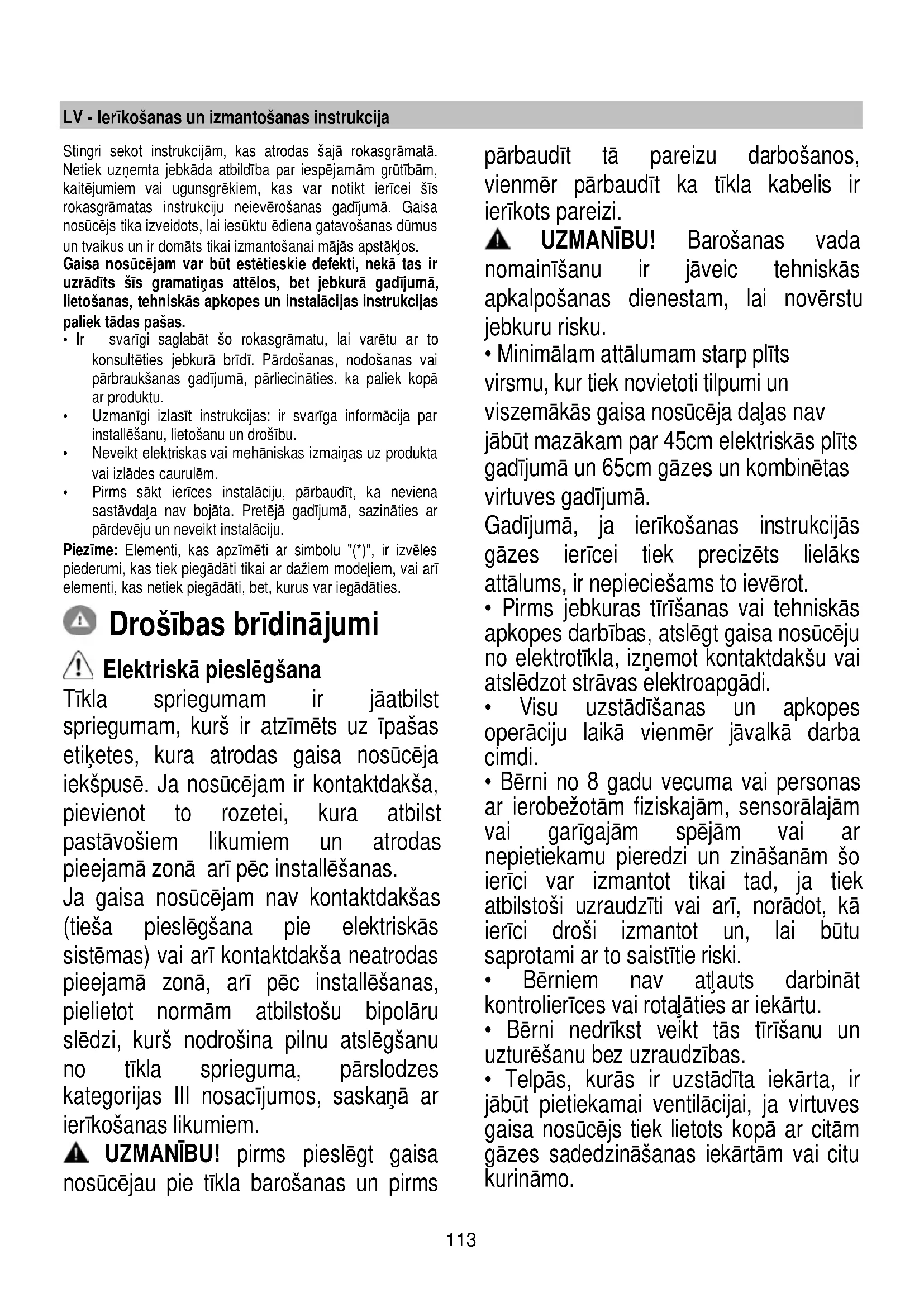 - Telpās, kurās ir uzstādīta iekārta, ir jābūt pietiekamai ventilācijai, ja virtuves gaisa nosūcējs tiek lietots kopā ar citām gāzes sadedzināšanas iekārtām vai citu kurināmo.114
