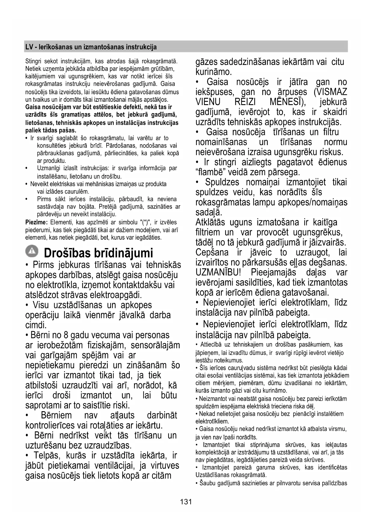 - Telpās, kurās ir uzstādīta iekārta, ir jābūt pietiekamai ventilācijai, ja virtuves gaisa nosūcējs tiek lietots kopā ar citām gāzes sadedzināšanas iekārtām vai citu kurināmo.