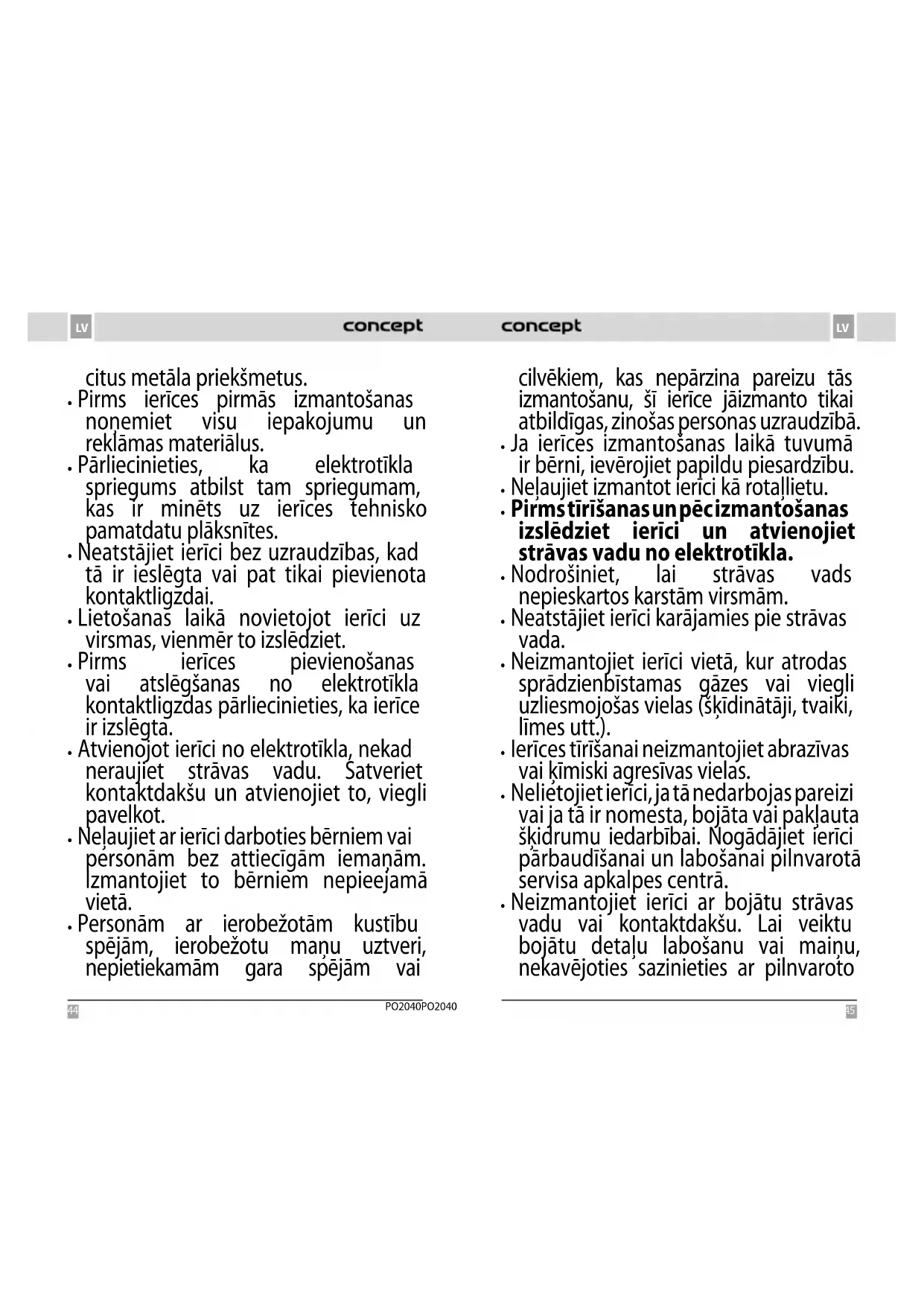 PO2040 PATEICĪBA Pateicamies par šīs “Concept” ierīces iegādi. Ceram, ka būsiet apmierināti ar šo izstrādājumu visu tā kalpošanas laiku. Pirms lietošanas rūpīgi izlasiet šo lietošanas instrukciju un uzglabājiet to drošā vietā, lai nepieciešamības gadījumā varētu pārlasīt. Nodrošiniet, lai arī citi cilvēki, kuri izmantos šo ierīci, pirms šīs ierīces lietošanas būtu iepazinušies ar norādījumiem. Tehniskie dati Spriegums, jauda Norādīts datu plāksnītē Akumulators Litija jonu, 420 mAh Zilās gaismas viļņa garums 470 nm Sarkanās gaismas viļņa garums 635 nm Uzlāde indukcijas lādētājs, USB vads Ūdensizturība IPX5 Uzlādes laiks <4h Taimeris 5 min. SVARĪGI DROŠĪBAS NORĀDĪJUMI