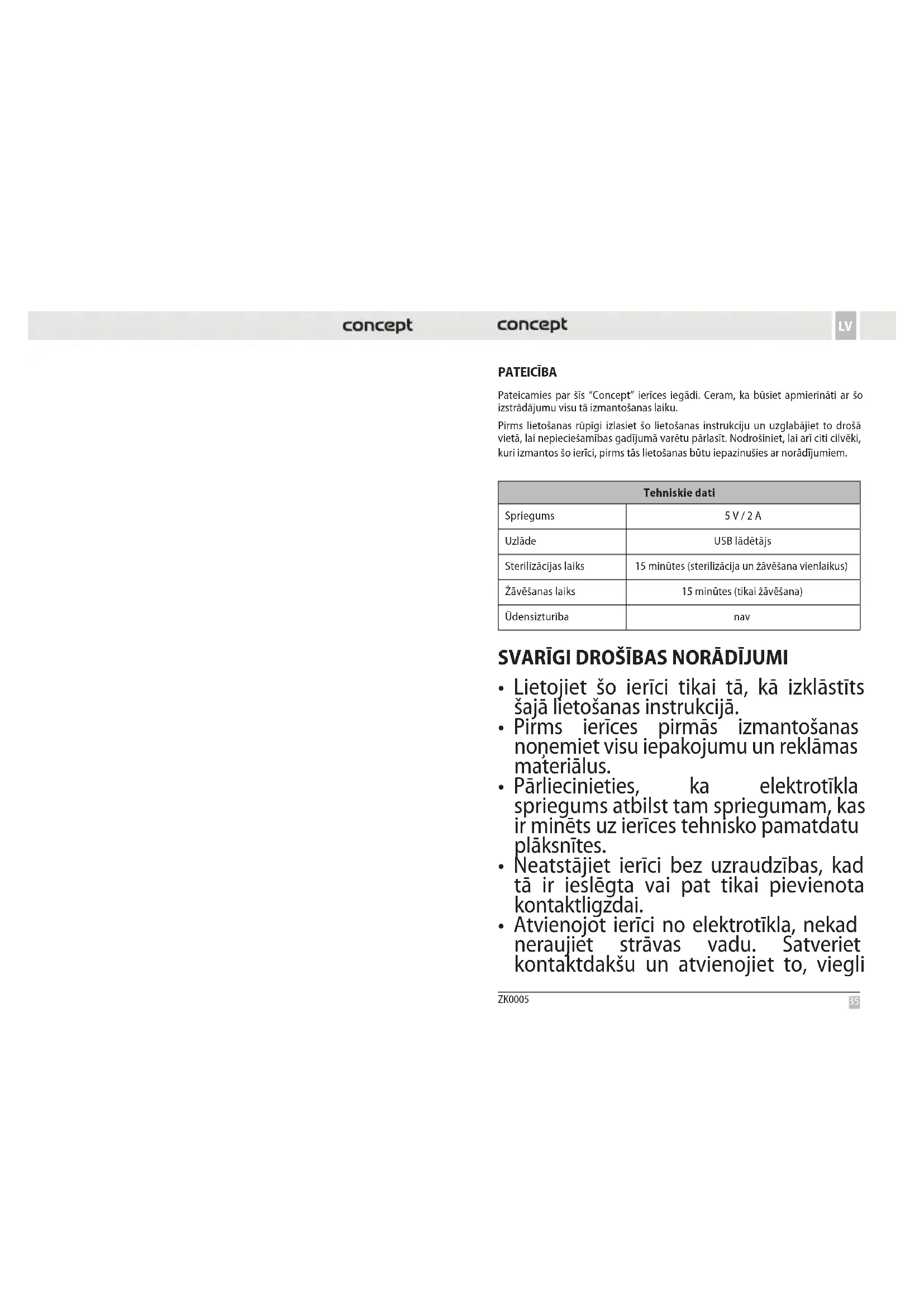 PATEICĪBA Pateicamies par šīs “Concept” ierīces iegādi. Ceram, ka būsiet apmierināti ar šo izstrādājumu visu tā izmantošanas laiku. Pirms lietošanas rūpīgi izlasiet šo lietošanas instrukciju un uzglabājiet to drošā vietā, lai nepieciešamības gadījumā varētu pārlasīt. Nodrošiniet, lai arī citi cilvēki, kuri izmantos šo ierīci, pirms tās lietošanas būtu iepazinušies ar norādījumiem. Tehniskie dati Spriegums 5V / 2A Uzlāde USB lādētājs Sterilizācijas laiks 15minūtes (sterilizācija un žāvēšana vienlaikus) Žāvēšanas laiks 15minūtes (tikai žāvēšana) Ūdensizturība nav SVARĪGI DROŠĪBAS NORĀDĪJUMI
