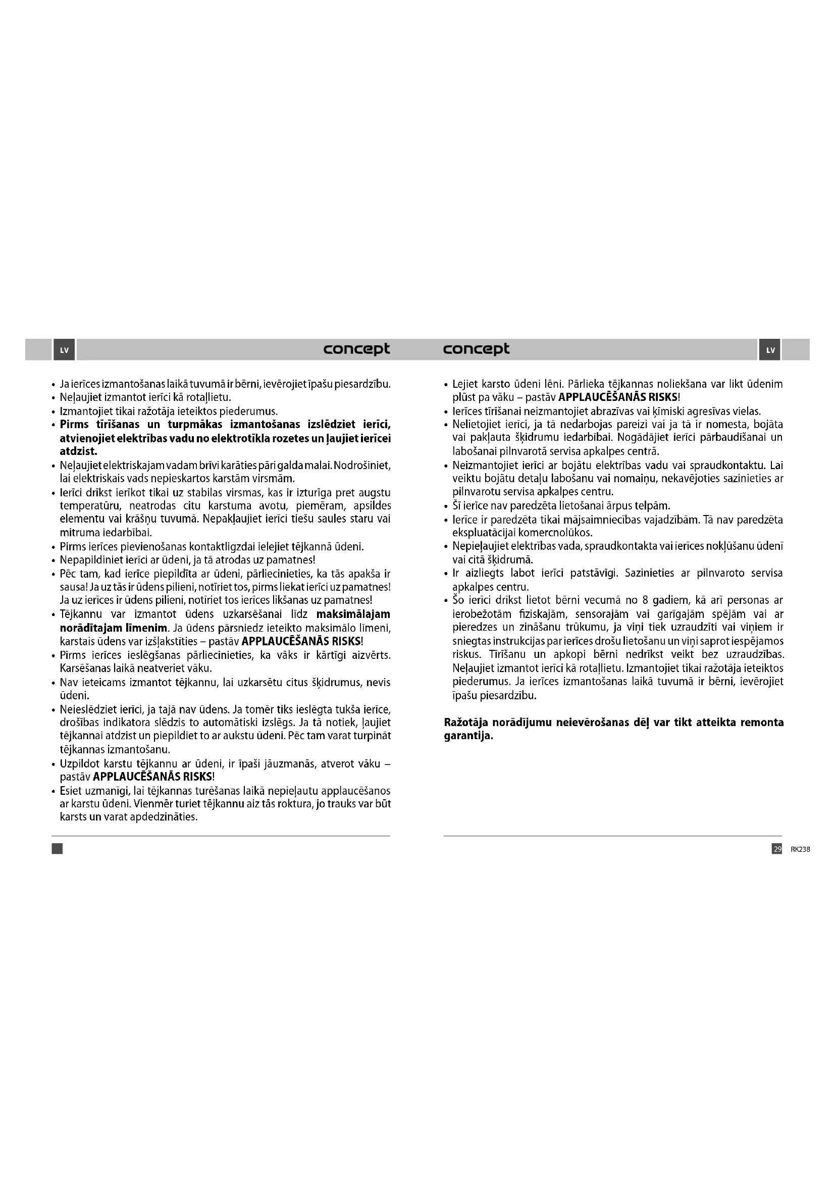 A garanciális javítás keretében kicserélt hibás pótalkatrészekre a fogyasztó nem tarthat igényt. Amennyiben a fogyasztó eláll az adásvételi szerződéstől, úgy köteles visszaszolgáltatni a komplett terméket beleértve annak tartozékait, valamint a termékkel leszállított dokumentumokat is. A termékkel együtt adott ajándékokra, amelyek nem kerültek kiszámlázásra a fogyasztónak, semmilyen jótállás nem vonatkozik. Megjegyzés: A szállítás során megsérült termék reklamációjára a szállítmányozó reklamációs szabályzata vonatkozik. Gyártó Jindřich Valenta – Concept Vysokomýtská 1800, 565 01 Choceň Cseh Köztársaság tel: +420465471400 fax: +420 465 473 304 email: servis@my-concept.cz www: www.my-concept.com7978 RK238XRK238X GARANTIJAS TALONS Pārdevēja pienākums ir iepazīstināt patērētāju ar izstrādājuma parametriem un darbību, kā arī pilnībā un salasāmi aizpildīt garantijas talonu izstrādājuma pārdošanas dienā. Ja nav pareizi aizpildīta vai nepareizi norādīta nepieciešamā informācija par izstrādājumu, garantijas talons ir nederīgs! Ražotājs (vai piegādātājs) garantijas laika periodā ir atbildīgs par izstrādājuma tehniskajām īpašībām un tā darbību, ko paredz attiecīgās tehniskās normas un nosacījumi. Garantijas laiks ilgst 24 mēnešus, sākot no pārdošanas datuma, ja ražotājs (vai piegādātājs) nav noteicis citādi. Patērētājam garantijas ietvaros ir tiesības uz bezmaksas, savlaicīgu un pilnīgu izstrādājuma bojājumu novēršanu (skat. tālāk) vai, ja tas nav neadekvāti attiecībā pret bojājuma raksturu, tiesības uz izstrādājuma bojāto detaļu maiņu. Tiesības uz izstrādājuma maiņu vai pirkšanas līguma nosacījumu neievērošanu var izmantot tikai tad, ja ir izpildīti visi likumīgie nosacījumi, un tikai gadījumā, ja izstrādājums nav ticis pārmērīgi nolietots vai bojāts. Garantija ir spēkā, ja ir izpildīti šādi nosacījumi: