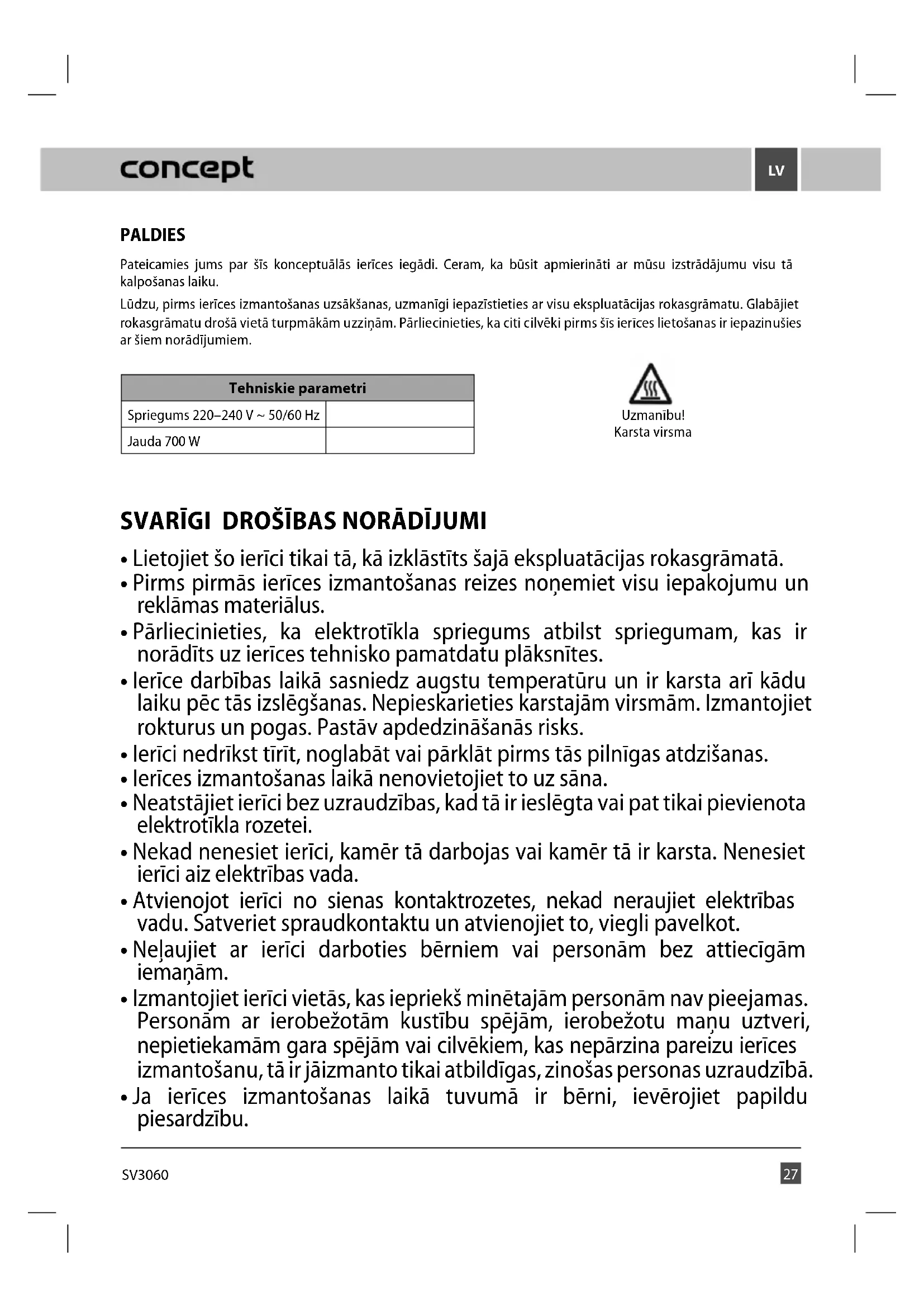 SV3060 PALDIES Pateicamies jums par šīs konceptuālās ierīces iegādi. Ceram, ka būsit apmierināti ar mūsu izstrādājumu visu tā kalpošanas laiku. Lūdzu, pirms ierīces izmantošanas uzsākšanas, uzmanīgi iepazīstieties ar visu ekspluatācijas rokasgrāmatu. Glabājiet rokasgrāmatu drošā vietā turpmākām uzziņām. Pārliecinieties, ka citi cilvēki pirms šīs ierīces lietošanas ir iepazinušies ar šiem norādījumiem. Tehniskie parametri Spriegums 220–240 V ~ 50/60 Hz Jauda 700 W SVARĪGI DROŠĪBAS NORĀDĪJUMI