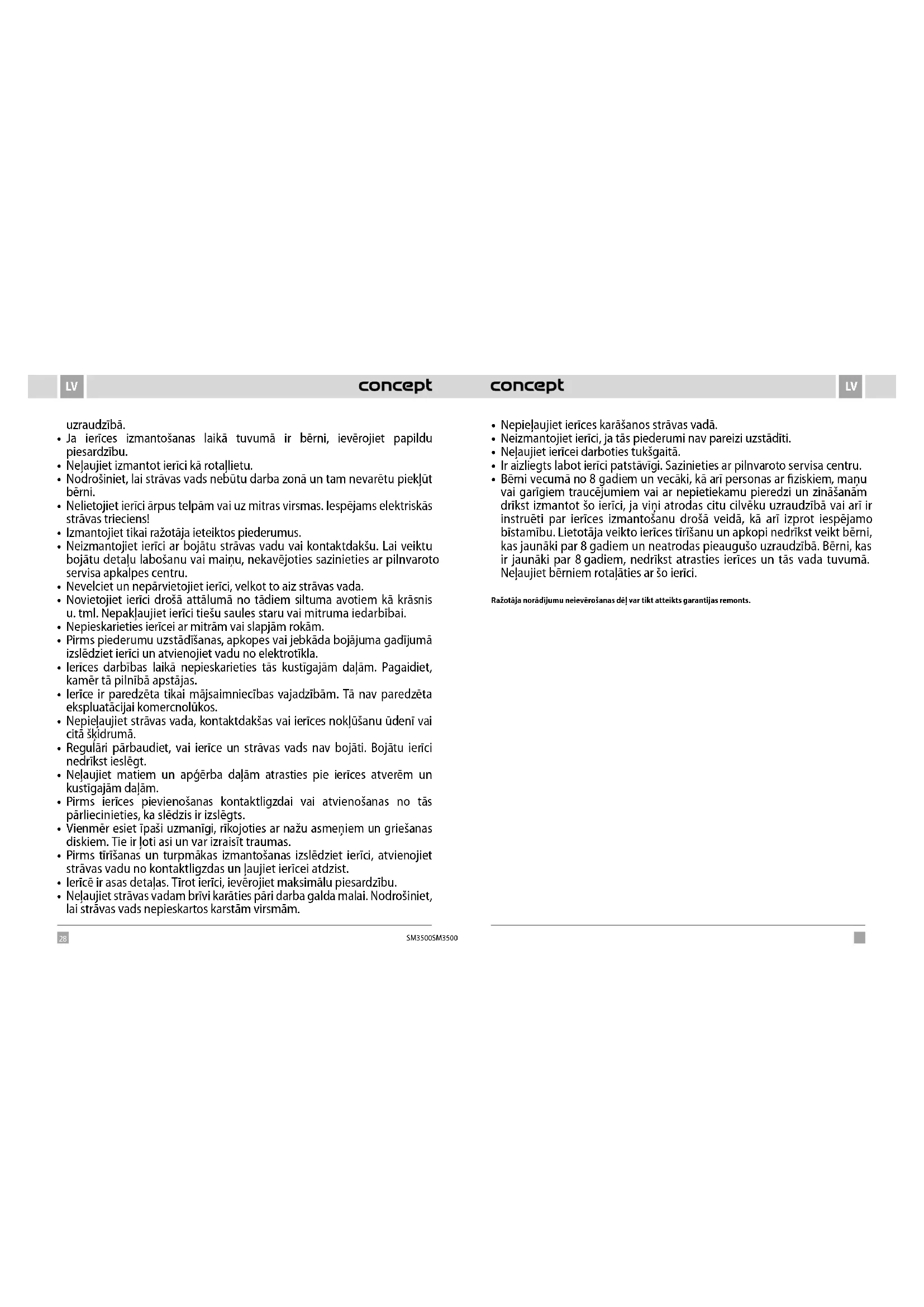 - Bērni vecumā no 8gadiem un vecāki, kā arī personas ar ziskiem, maņu vai garīgiem traucējumiem vai ar nepietiekamu pieredzi un zināšanām drīkst izmantot šo ierīci, ja viņi atrodas citu cilvēku uzraudzībā vai arī ir instruēti par ierīces izmantošanu drošā veidā, kā arī izprot iespējamo bīstamību. Lietotāja veikto ierīces tīrīšanu un apkopi nedrīkst veikt bērni, kas jaunāki par 8gadiem un neatrodas pieaugušo uzraudzībā. Bērni, kas ir jaunāki par 8gadiem, nedrīkst atrasties ierīces un tās vada tuvumā. Neļaujiet bērniem rotaļāties ar šo ierīci. Ražotāja norādījumu neievērošanas dēļ var tikt atteikts garantijas remonts.30 31 SM3500 SM3500 LVLV