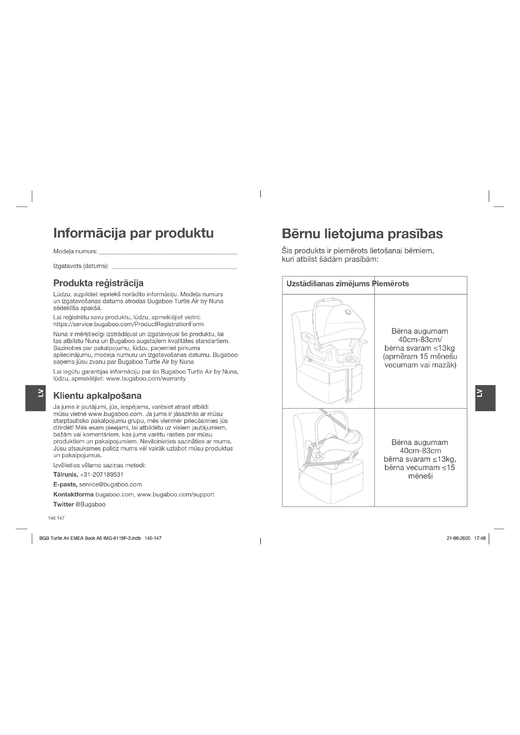 BGB Turtle Air EMEA Book A6 IMG-0119F-3.indb 144-145BGB Turtle Air EMEA Book A6 IMG-0119F-3.indb 144-145 21-08-2020 17:4821-08-2020 17:48Informācija par produktu Modeļa numurs: _____________________________________________ Izgatavots (datums): _________________________________________ Produkta reģistrācija Lūdzu, aizpildiet iepriekš norādīto informāciju. Modeļa numurs un izgatavošanas datums atrodas Bugaboo Turtle Air by Nuna sēdeklīša apakšā. Lai reģistrētu savu produktu, lūdzu, apmeklējiet vietni: https://service.bugaboo.com/ProductRegistrationForm Nuna ir mērķtiecīgi izstrādājusi un izgatavojusi šo produktu, lai tas atbilstu Nuna un Bugaboo augstajiem kvalitātes standartiem. Sazinoties par pakalpojumu, lūdzu, paņemiet pirkuma apliecinājumu, modeļa numuru un izgatavošanas datumu. Bugaboo saņems jūsu zvanu par Bugaboo Turtle Air by Nuna Lai iegūtu garantijas informāciju par šo Bugaboo Turtle Air by Nuna, lūdzu, apmeklējiet: www.bugaboo.com/warranty Klientu apkalpošana Ja jums ir jautājumi, jūs, iespējams, varēsiet atrast atbildi mūsu vietnē www.bugaboo.com. Ja jums ir jāsazinās ar mūsu starptautisko pakalpojumu grupu, mēs vienmēr priecāsimies jūs dzirdēt! Mēs esam pieejami, lai atbildētu uz visiem jautājumiem, bažām vai komentāriem, kas jums varētu rasties par mūsu produktiem un pakalpojumiem. Nevilcinieties sazināties ar mums. Jūsu atsauksmes palīdz mums vēl vairāk uzlabot mūsu produktus un pakalpojumus. Izvēlieties vēlamo saziņas metodi: Tālrunis, +31-207189531 E-pasts, service@bugaboo.com Kontaktforma bugaboo.com, www.bugaboo.com/support Twitter @Bugaboo Bērnu lietojuma prasības Uzstādīšanas zīmējums Piemērots Bērna augumam 40cm-83cm/ bērna svaram ≤13kg (apmēram 15 mēnešu vecumam vai mazāk) Bērna augumam 40cm-83cm bērna svaram ≤13kg, bērna vecumam ≤15 mēneši Šis produkts ir piemērots lietošanai bērniem, kuri atbilst šādām prasībām: