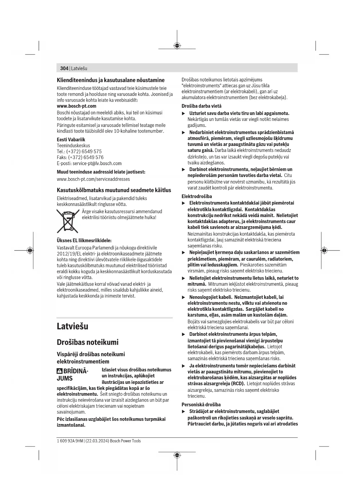 Fikseerijaga lülitivariant Elektrilise tööriista kasutamisele võtmiseks vajutage kõigepealt sisse-/väljalülitit(2) ➊, siis lükake seda ettepoole ➋. Seejärel vajutage seda ja hoidke vajutatult ➌. Et fikseerida vajutatud sisse-/väljalülitit(2), lükake sisse-/ väljalülitit(2) edasi ettepoole ➍. Elektrilise tööriista väljalülitamiseks vabastage sisse-/ väljalüliti(2) või kui see on fikseeritud, vajutage lühidalt sisse-/väljalülitit(2) ja vabastage seejärel. Fikseerijata lülitivariant Elektrilise tööriista kasutamisele võtmiseks vajutage kõigepealt sisse-/väljalülitit(2) ➊, siis lükake seda ettepoole ➋. Seejärel vajutage seda ja hoidke vajutatult ➌. Elektrilise tööriista väljalülitamiseks vabastage sisse-/ väljalüliti(2). u Enne kasutamist kontrollige lihvimistarvikud üle. Lihvimistarvik peab olema nõuetekohaselt paigaldatud ja saama vabalt pöörelda. Katsetage tööriista vähemalt 1 minuti jooksul tühikäigul. Ärge kasutage lihvimistarvikuid, mis on vigastada saanud, deformeerunud või vibreerivad. Vigastada saanud lihvimistarvikud võivad puruneda ja tekitada kehavigastusi. Hooldus ja korrashoid Hooldus ja puhastamine u Enne mistahes tööde teostamist elektrilise tööriista kallal tõmmake pistik pistikupesast välja. u Seadme laitmatu ja ohutu töö tagamiseks hoidke seade ja selle ventilatsiooniavad puhtad. u Äärmuslikes töötingimustes kasutage võimaluse korral alati tolmuimejat. Puhastage sageli ventilatsiooniavasid ja kasutage rikkevoolukaitselülitit. Äärmuslike töötingimuste korral võib seadmesse koguneda elektrit juhtivat tolmu. Seadme kaitseisolatsioon võib kahjustuda. Hoidke ja käsitsege lisavarustust hoolikalt. Kui on vaja vahetada ühendusjuhet, laske seda ohutuskaalutlustel teha Bosch-il või Bosch-i elektriliste tööriistade volitatud klienditeenindusel. Bosch Power Tools 1 609 92A 9HM | (22.03.2024)304 | Latviešu Klienditeenindus ja kasutusalane nõustamine Klienditeeninduse töötajad vastavad teie küsimustele teie toote remondi ja hoolduse ning varuosade kohta. Joonised ja info varuosade kohta leiate ka veebisaidilt: www.bosch-pt.com Boschi nõustajad on meeleldi abiks, kui teil on küsimusi toodete ja lisatarvikute kasutamise kohta. Päringute esitamisel ja varuosade tellimisel teatage meile kindlasti toote tüübisildil olev 10‑kohaline tootenumber. Eesti Vabariik Teeninduskeskus Tel.: (+372) 6549 575 Faks: (+372) 6549 576 E-posti: service-pt@lv.bosch.com Muud teeninduse aadressid leiate jaotisest: www.bosch-pt.com/serviceaddresses Kasutuskõlbmatuks muutunud seadmete käitlus Elektriseadmed, lisatarvikud ja pakendid tuleks keskkonnasäästlikult ringlusse võtta. Ärge visake kasutusressursi ammendanud elektrilisi tööriistu olmejäätmete hulka! Üksnes ELliikmesriikidele: Vastavalt Euroopa Parlamendi ja nõukogu direktiivile 2012/19/EL elektri- ja elektroonikaseadmete jäätmete kohta ning direktiivi ülevõtvatele riiklikele õigusaktidele tuleb kasutuskõlbmatuks muutunud elektrilised tööriistad eraldi kokku koguda ja keskkonnasäästlikult korduskasutada või ringlusse võtta. Vale jäätmekäitluse korral võivad vanad elektri- ja elektroonikaseadmed, milles sisaldub kahjulikke aineid, kahjustada keskkonda ja inimeste tervist. Latviešu Drošības noteikumi Vispārēji drošības noteikumi elektroinstrumentiem BRĪDINĀ- JUMS Izlasiet visus drošības noteikumus un instrukcijas, aplūkojiet ilustrācijas un iepazīstieties ar specifikācijām, kas tiek piegādātas kopā ar šo elektroinstrumentu. Šeit sniegto drošības noteikumu un instrukciju neievērošana var izraisīt aizdegšanos un būt par cēloni elektriskajam triecienam vai nopietnam savainojumam. Pēc izlasīšanas uzglabājiet šos noteikumus turpmākai izmantošanai. Drošības noteikumos lietotais apzīmējums "elektroinstruments" attiecas gan uz Jūsu tīkla elektroinstrumentiem (ar elektrokabeli), gan arī uz akumulatora elektroinstrumentiem (bez elektrokabeļa). Drošība darba vietā u Uzturiet savu darba vietu tīru un labi apgaismotu. Nekārtīgās un tumšās vietās var viegli notikt nelaimes gadījums. u Nedarbiniet elektroinstrumentus sprādzienbīstamā atmosfērā, piemēram, viegli uzliesmojošu šķidrumu tuvumā un vietās ar paaugstinātu gāzu vai putekļu saturu gaisā. Darba laikā elektroinstruments nedaudz dzirksteļo, un tas var izsaukt viegli degošu putekļu vai tvaiku aizdegšanos. u Darbinot elektroinstrumentu, neļaujiet bērniem un nepiederošām personām tuvoties darba vietai. Citu personu klātbūtne var novērst uzmanību, kā rezultātā jūs varat zaudēt kontroli pār elektroinstrumentu. Elektrodrošība u Elektroinstrumenta kontaktdakšai jābūt piemērotai elektrotīkla kontaktligzdai. Kontaktdakšas konstrukciju nedrīkst nekādā veidā mainīt. Nelietojiet kontaktdakšas adapterus, ja elektroinstruments caur kabeli tiek savienots ar aizsargzemējuma ķēdi. Neizmainītas konstrukcijas kontaktdakša, kas piemērota kontaktligzdai, ļauj samazināt elektriskā trieciena saņemšanas risku. u Nepieļaujiet ķermeņa daļu saskaršanos ar sazemētiem priekšmetiem, piemēram, ar caurulēm, radiatoriem, plītīm vai ledusskapjiem. Pieskaroties sazemētām virsmām, pieaug risks saņemt elektrisko triecienu. u Nelietojiet elektroinstrumentu lietus laikā, neturiet to mitrumā. Mitrumam iekļūstot elektroinstrumentā, pieaug risks saņemt elektrisko triecienu. u Nenoslogojiet kabeli. Neizmantojiet kabeli, lai elektroinstrumentu nestu, vilktu vai atvienotu no elektrotīkla kontaktligzdas. Sargājiet kabeli no karstuma, eļļas, asām malām un kustošām daļām. Bojāts vai samezglojies elektrokabelis var būt par cēloni elektriskā trieciena saņemšanai. u Darbinot elektroinstrumentu ārpus telpām, izmantojiet tā pievienošanai vienīgi ārpustelpu lietošanai derīgus pagarinātājkabeļus. Lietojot elektrokabeli, kas piemērots darbam ārpus telpām, samazinās elektriskā triec