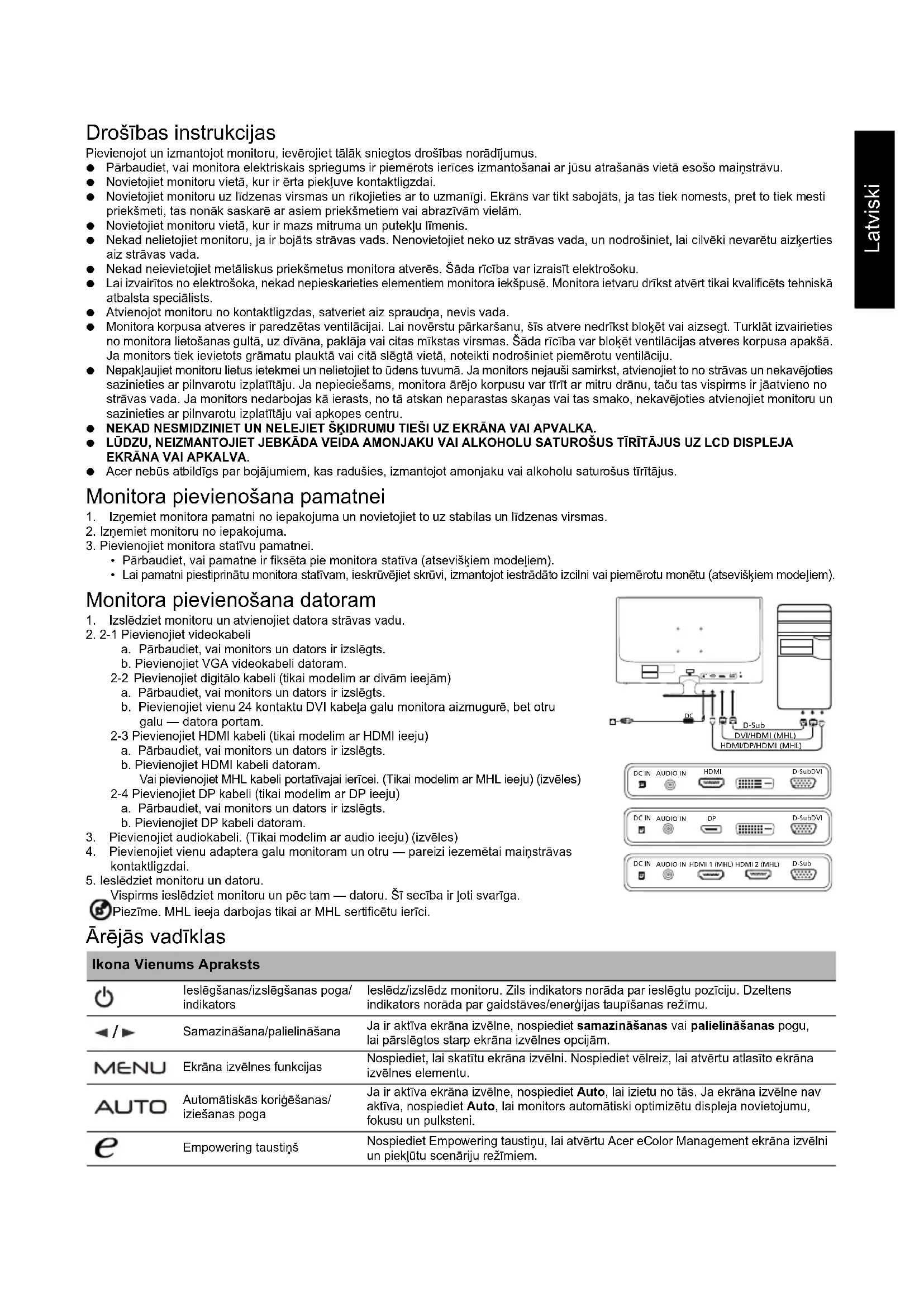 MENU/ENTER (Meniu / Įvestis) „Auto/Exit“ (Automatinis / Išeiti) Mygtukas E („Empowering“) Įvesties klavišas Funkcijos Kontrastas Ryškumas Fokusavimas Sinchronizavimas Vertikali padėtis Horizontali padėtis (Šilta) spalva (Šalta) spalva RGB spalvinė temperatūra Kalba Ekrano rodinio padėtis Ekrano rodinio skirtasis laikas Automatinis konfigūravimas (tik analoginės įvesties modelyje) Platusis režimas (Visas / Aspektas) ACM įjungti / išjungti Įvesties signalų pasirinkimas (tik dvigubos įvesties modelye) DDC/CI įjungti / išjungti Ekrano informacija Atkurti Išeiti Visi techniniai duomenys gali būti keičiami iš anksto nepranešus.Latviski Drošības instrukcijas Pievienojot un izmantojot monitoru, ievērojiet tālāk sniegtos drošības norādījumus. Pārbaudiet, vai monitora elektriskais spriegums ir piemērots ierīces izmantošanai ar jūsu atrašanās vietā esošo maiņstrāvu. Novietojiet monitoru vietā, kur ir ērta piekļuve kontaktligzdai. Novietojiet monitoru uz līdzenas virsmas un rīkojieties ar to uzmanīgi. Ekrāns var tikt sabojāts, ja tas tiek nomests, pret to tiek mesti priekšmeti, tas nonāk saskarē ar asiem priekšmetiem vai abrazīvām vielām. Novietojiet monitoru vietā, kur ir mazs mitruma un putekļu līmenis. Nekad nelietojiet monitoru, ja ir bojāts strāvas vads. Nenovietojiet neko uz strāvas vada, un nodrošiniet, lai cilvēki nevarētu aizķerties aiz strāvas vada. Nekad neievietojiet metāliskus priekšmetus monitora atverēs. Šāda rīcība var izraisīt elektrošoku. Lai izvairītos no elektrošoka, nekad nepieskarieties elementiem monitora iekšpusē. Monitora ietvaru drīkst atvērt tikai kvalificēts tehniskā atbalsta speciālists. Atvienojot monitoru no kontaktligzdas, satveriet aiz spraudņa, nevis vada. Monitora korpusa atveres ir paredzētas ventilācijai. Lai novērstu pārkaršanu, šīs atvere nedrīkst bloķēt vai aizsegt. Turklāt izvairieties no monitora lietošanas gultā, uz dīvāna, paklāja vai citas mīkstas virsmas. Šāda rīcība var bloķēt ventilācijas atveres korpusa apakšā. Ja monitors tiek ievietots grāmatu plauktā vai citā slēgtā vietā, noteikti nodrošiniet piemērotu ventilāciju. Nepakļaujiet monitoru lietus ietekmei un nelietojiet to ūdens tuvumā. Ja monitors nejauši samirkst, atvienojiet to no strāvas un nekavējoties sazinieties ar pilnvarotu izplatītāju. Ja nepieciešams, monitora ārējo korpusu var tīrīt ar mitru drānu, taču tas vispirms ir jāatvieno no strāvas vada. Ja monitors nedarbojas kā ierasts, no tā atskan neparastas skaņas vai tas smako, nekavējoties atvienojiet monitoru un sazinieties ar pilnvarotu izplatītāju vai apkopes centru. NEKAD NESMIDZINIET UN NELEJIET ŠĶIDRUMU TIEŠI UZ EKRĀNA VAI APVALKA. LŪDZU, NEIZMANTOJIET JEBKĀDA VEIDA AMONJAKU VAI ALKOHOLU SATUROŠUS TĪRĪTĀJUS UZ LCD DISPLEJA EKRĀNA VAI APKALVA. Acer nebūs atbildīgs par bojājumiem, kas radušies, izmantojot amonjaku vai alkoholu saturošus tīrītājus. Monitora pievienošana pamatnei