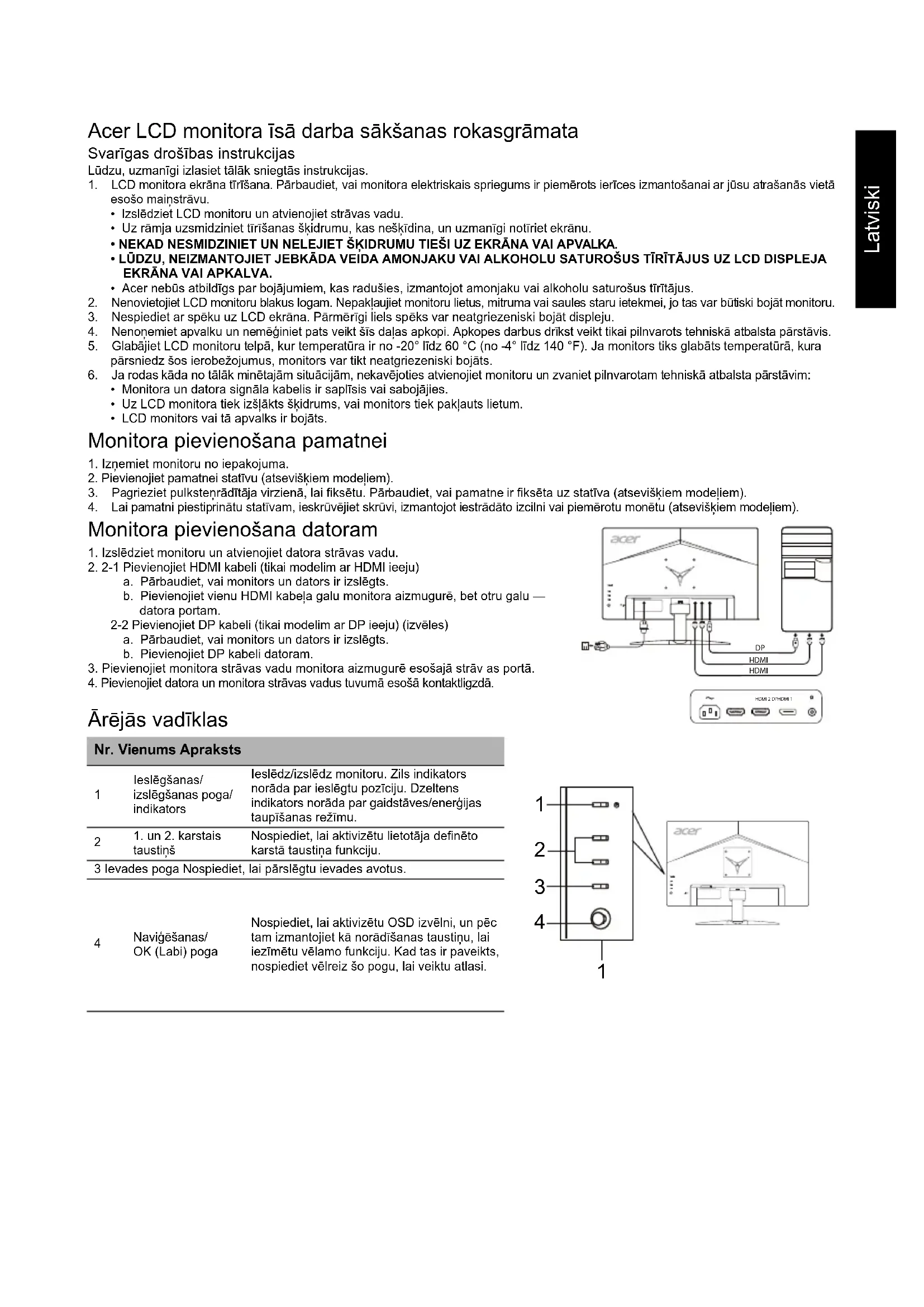 3. Pagrieziet pulksteņrādītāja virzienā, lai fiksētu. Pārbaudiet, vai pamatne ir fiksēta uz statīva (atsevišķiem modeļiem). 4. Lai pamatni piestiprinātu statīvam, ieskrūvējiet skrūvi, izmantojot iestrādāto izcilni vai piemērotu monētu (atsevišķiem modeļiem). Monitora pievienošana datoram 1. Izslēdziet monitoru un atvienojiet datora strāvas vadu.2. 2-1 Pievienojiet HDMI kabeli (tikai modelim ar HDMI ieeju)a. Pārbaudiet, vai monitors un dators ir izslēgts.b. Pievienojiet vienu HDMI kabeļa galu monitora aizmugurē, bet otru galu — datora portam.2-2 Pievienojiet DP kabeli (tikai modelim ar DP ieeju) (izvēles)a. Pārbaudiet, vai monitors un dators ir izslēgts.b. Pievienojiet DP kabeli datoram.3. Pievienojiet monitora strāvas vadu monitora aizmugurē esošajā strāv as portā.4. Pievienojiet datora un monitora strāvas vadus tuvumā esošā kontaktligzdā. Ārējās vadīklas Nr. Vienums Apraksts